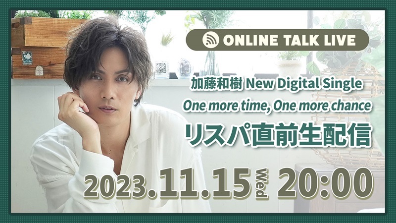 この度2023年第二弾として配信リリースされるのは、山崎まさよしの名曲「One more time, One more chance」。リリースを記念し、11月15日(水)リリース日の20時より加藤和樹本人によるYouTubeを生配信、21時には同時刻に一斉に楽曲を試聴するオンラインリスニングパーティーも開催される。