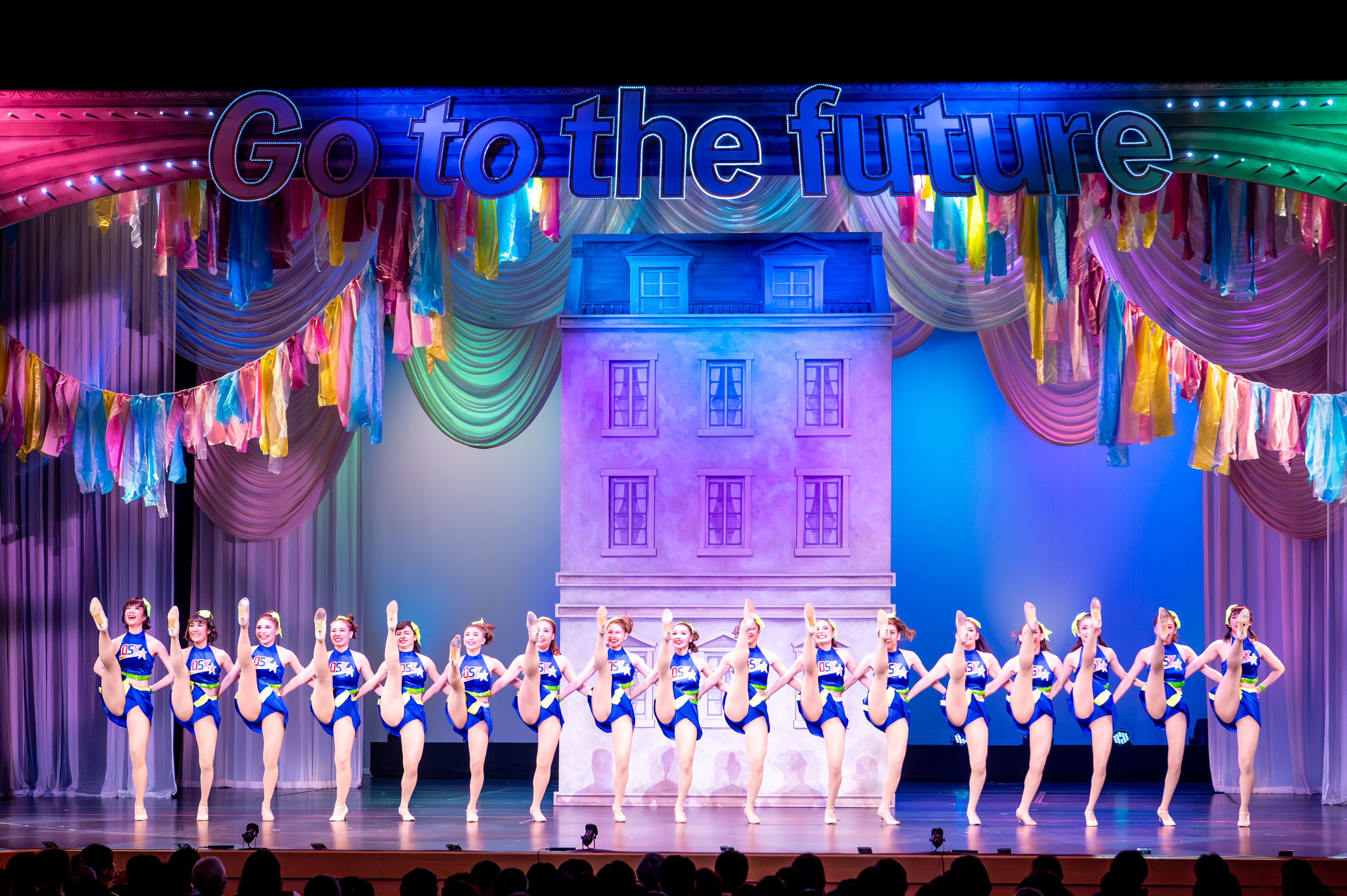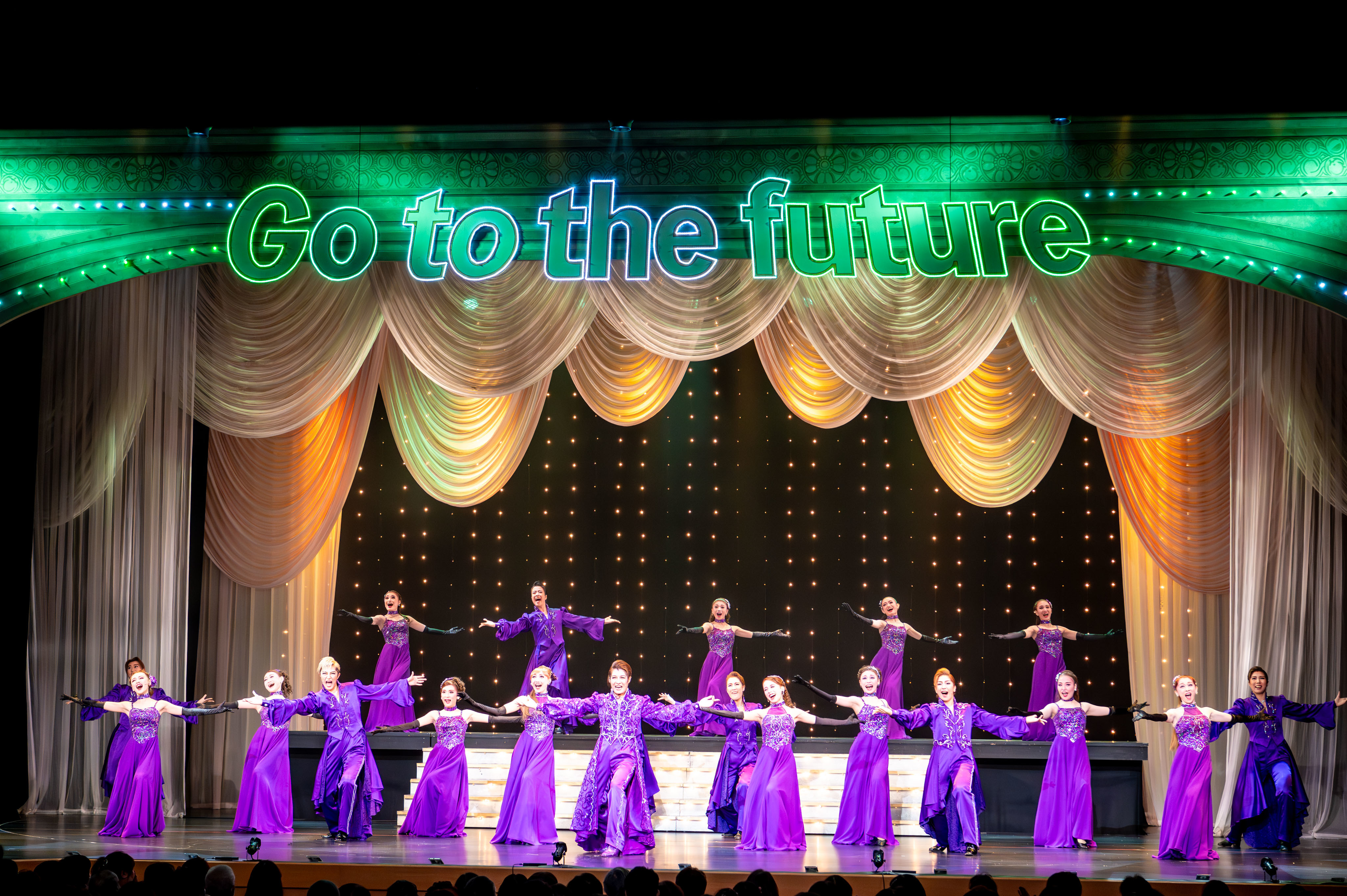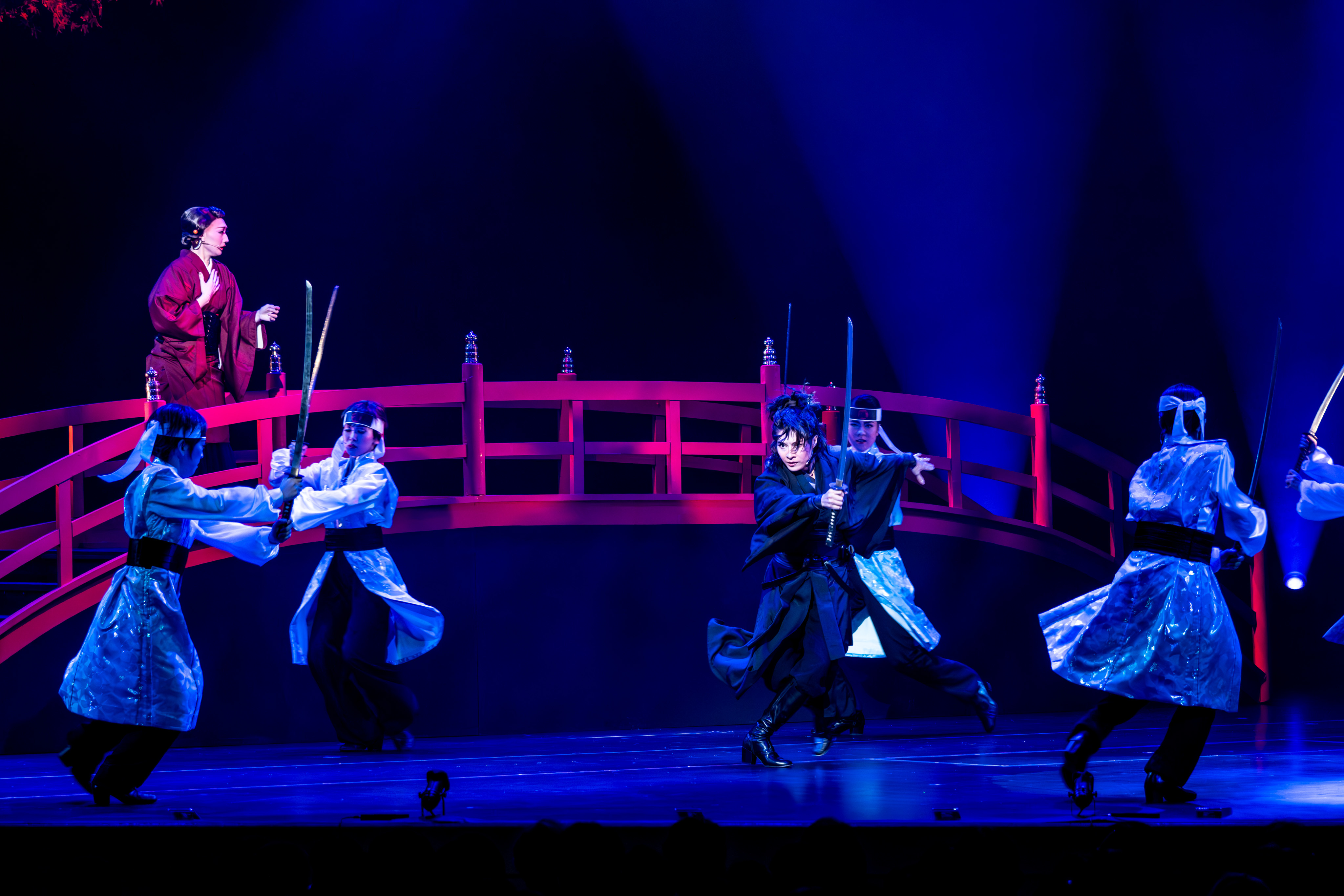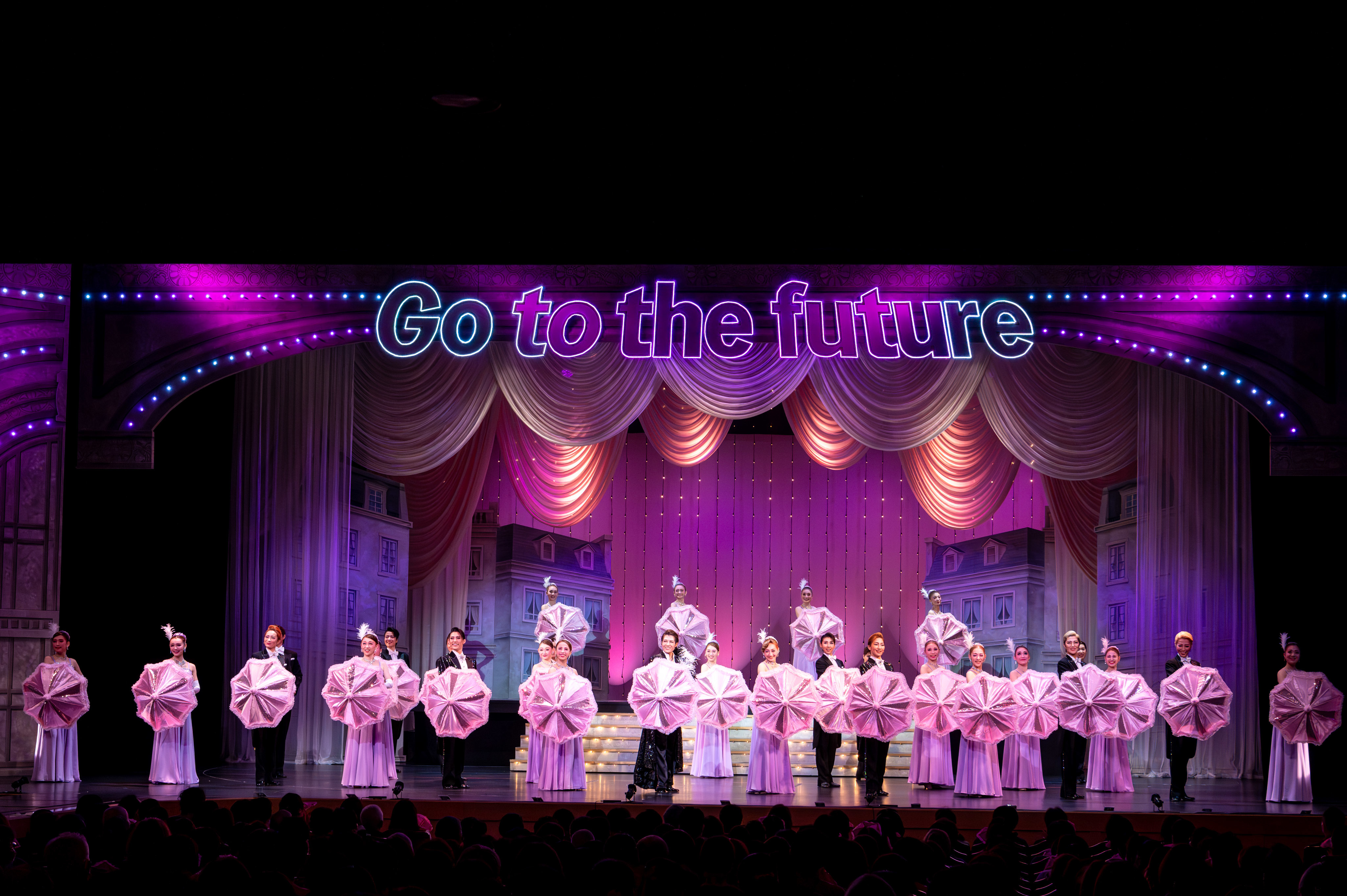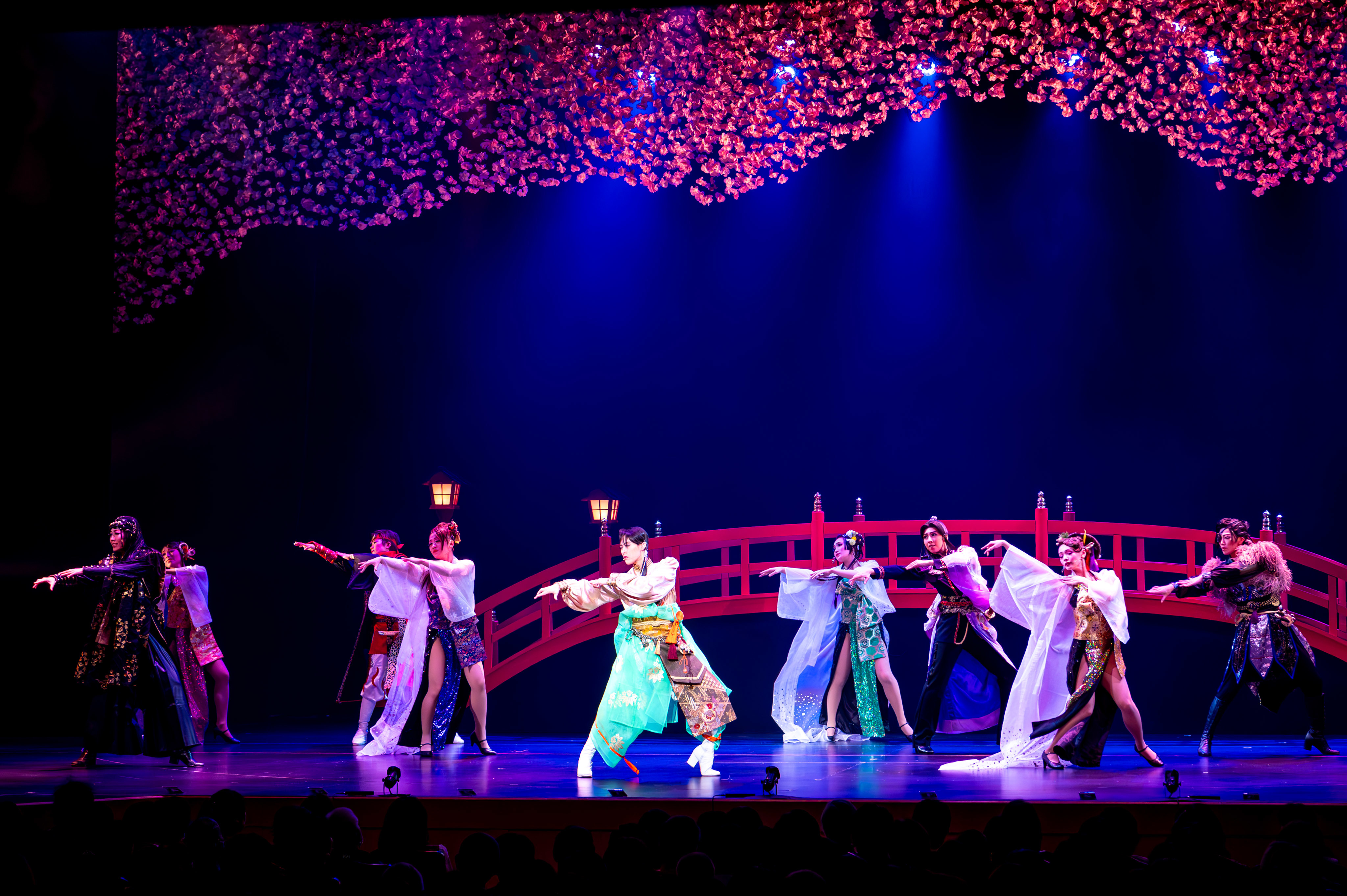 思いがけず満開の花が咲いたような空気の中、タキシードの男からバトンを受け継ぐように、本作のテーマ曲「未来への扉~Go to the future~」を全員で歌い踊る。今回の舞台の見どころの一つが、和テイストにあふれた新作部分から、洋物テイストの再演部分へと、いかに違和感なく移行させるか? ということだったが、見事にシームレスにつなげることに成功していた。