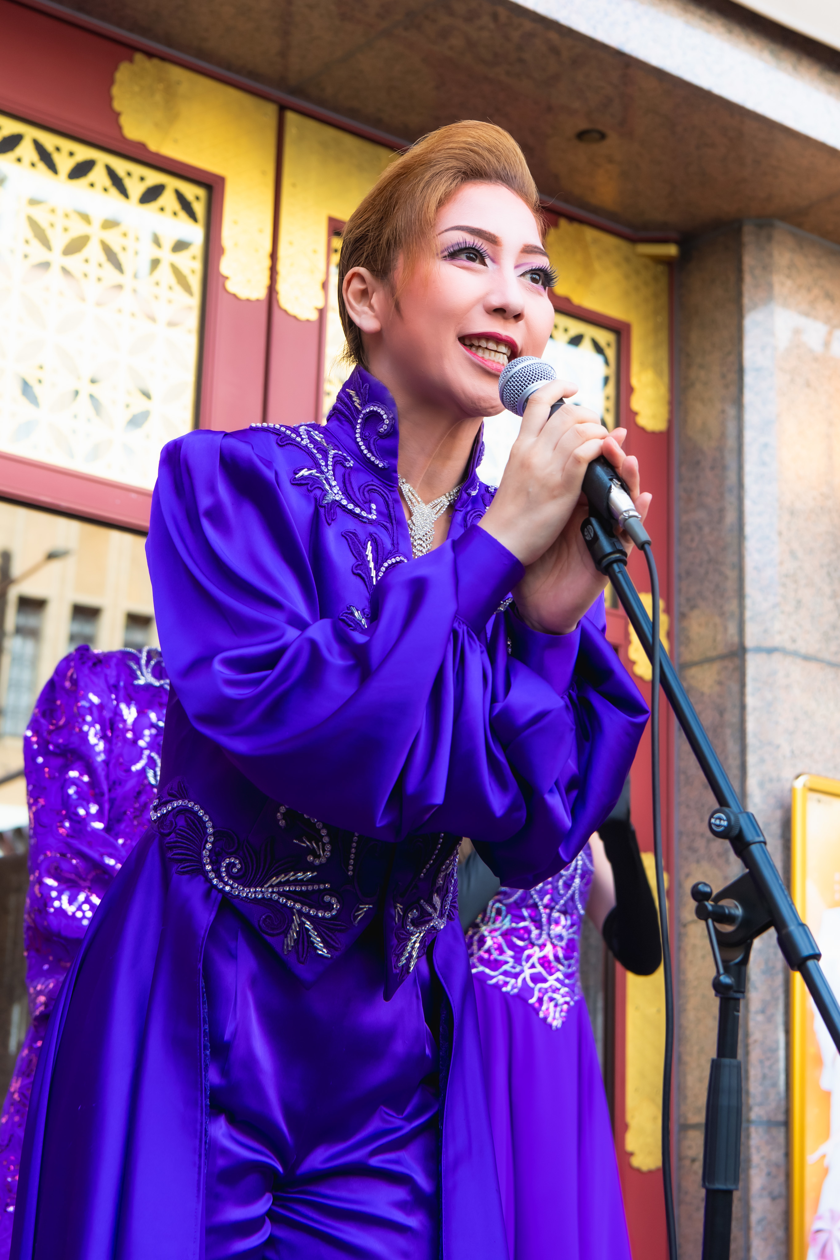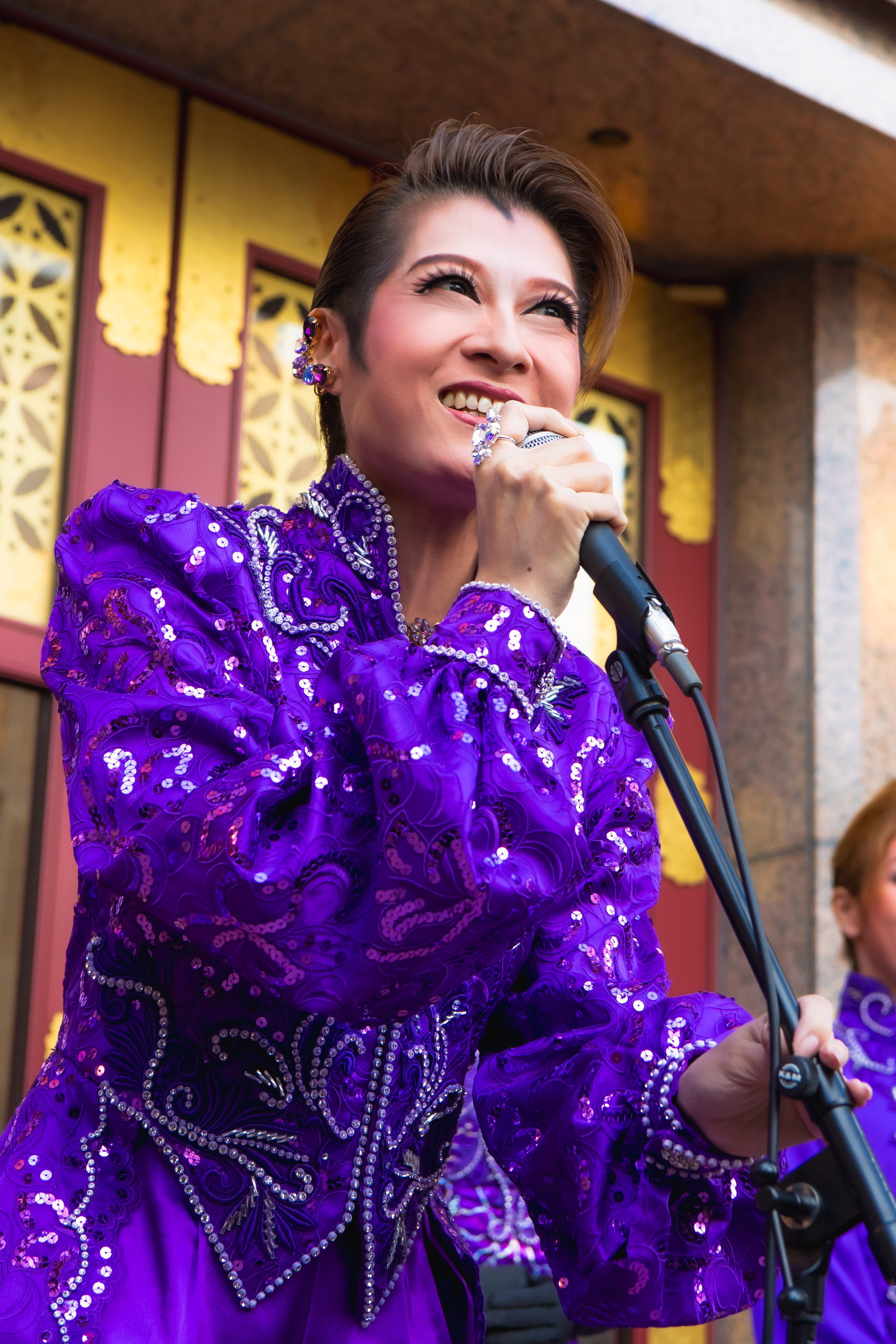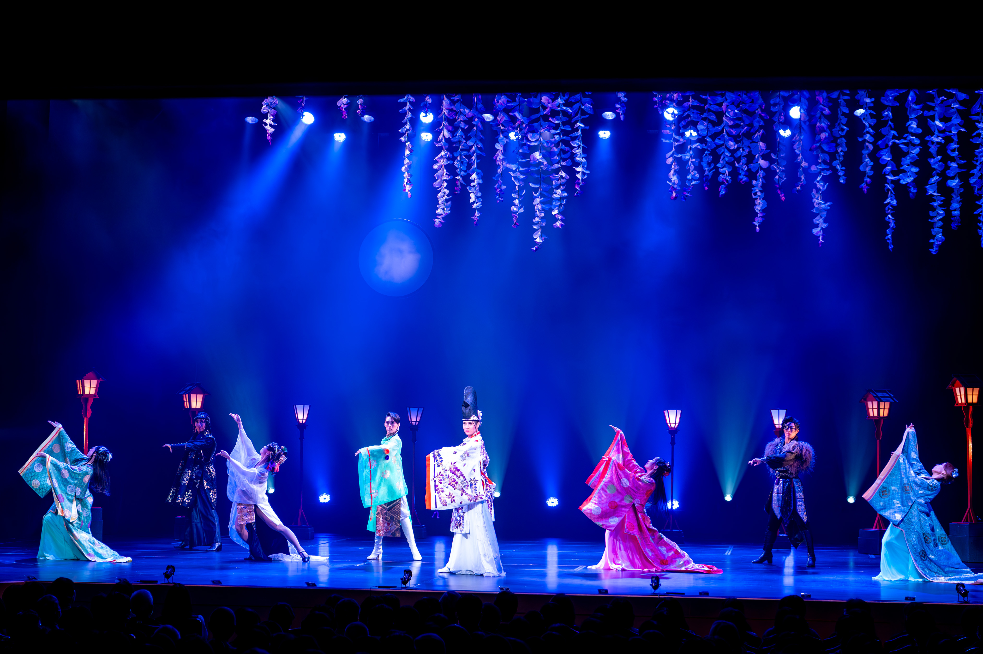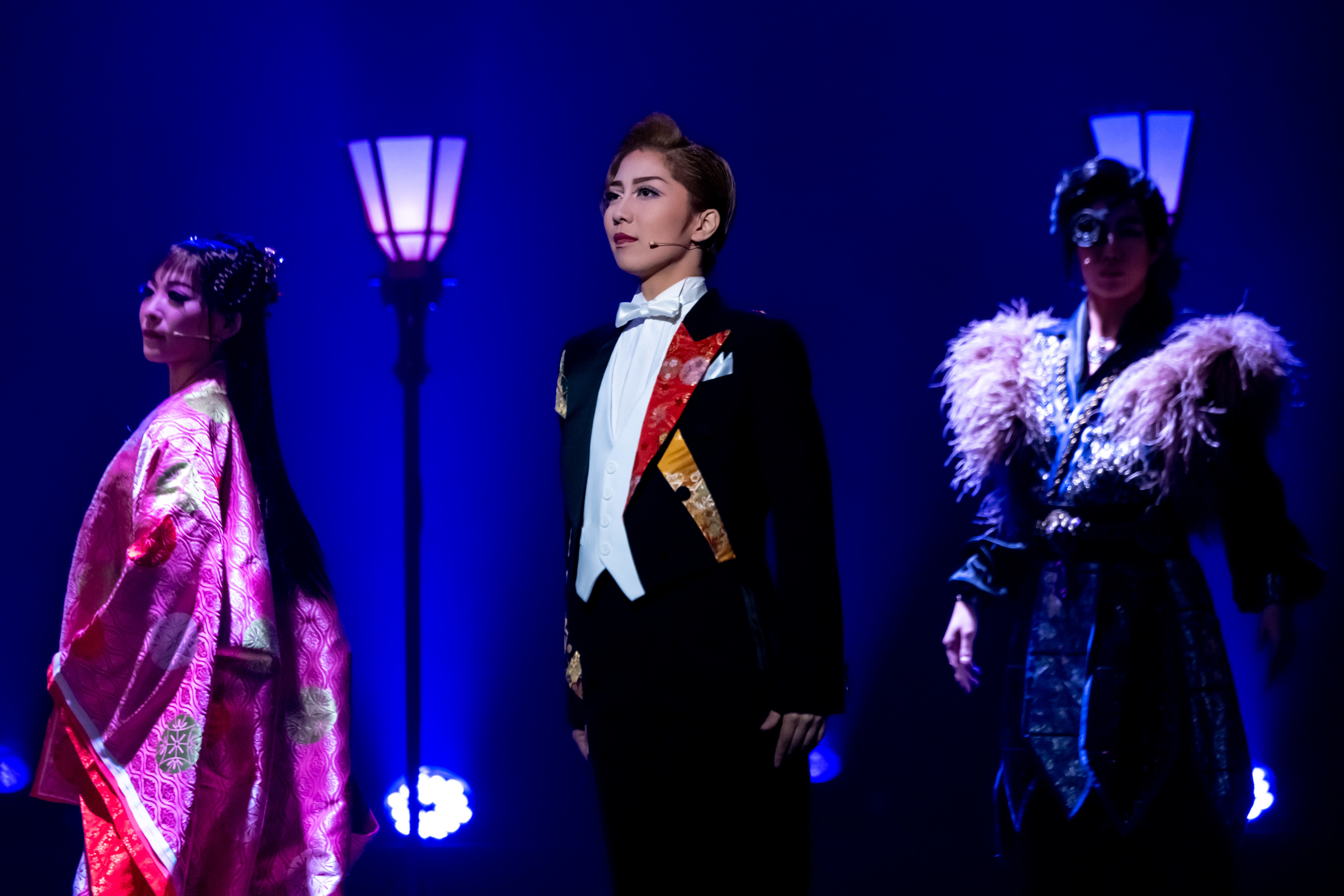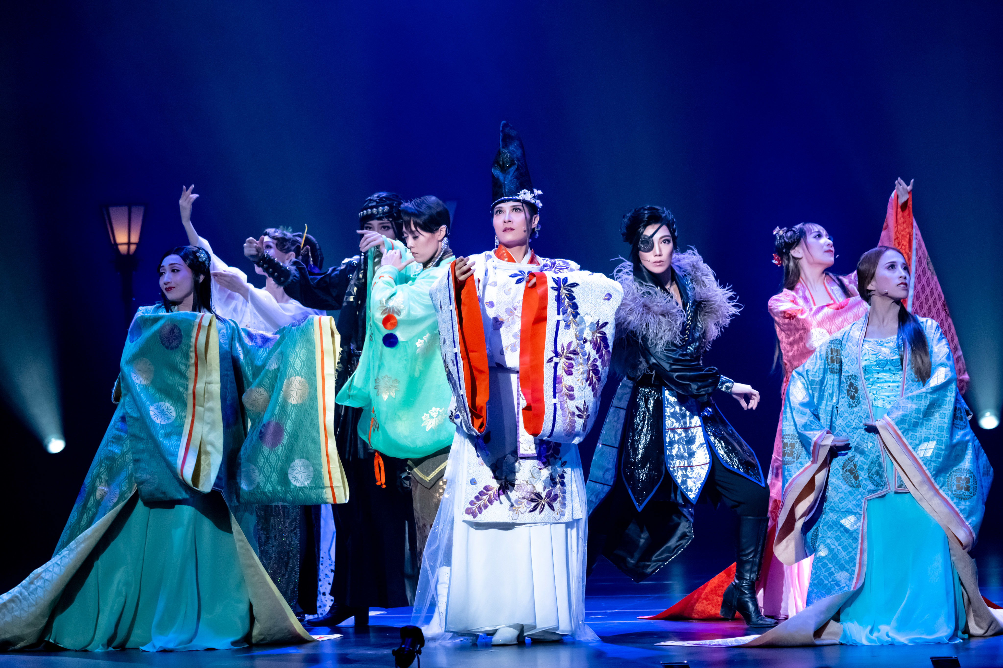 ほぼオンタイムで劇場が暗転し、舞台に照明が入ると、貴族から武将まで様々な和の衣裳を身にまとった、劇団員たちが浮かび上がった。このあまりにもドラマティックなオープニングに、客席からは「待ってました!」という大向うまで入る。そして黒いタキシード姿の男(華月)が現れると、今回のために書き下ろされた「この都で」を歌唱。古の街で生きて恋して、そして散っていった先人たちに思いを馳せながら、過去にタイムスリップしていく。