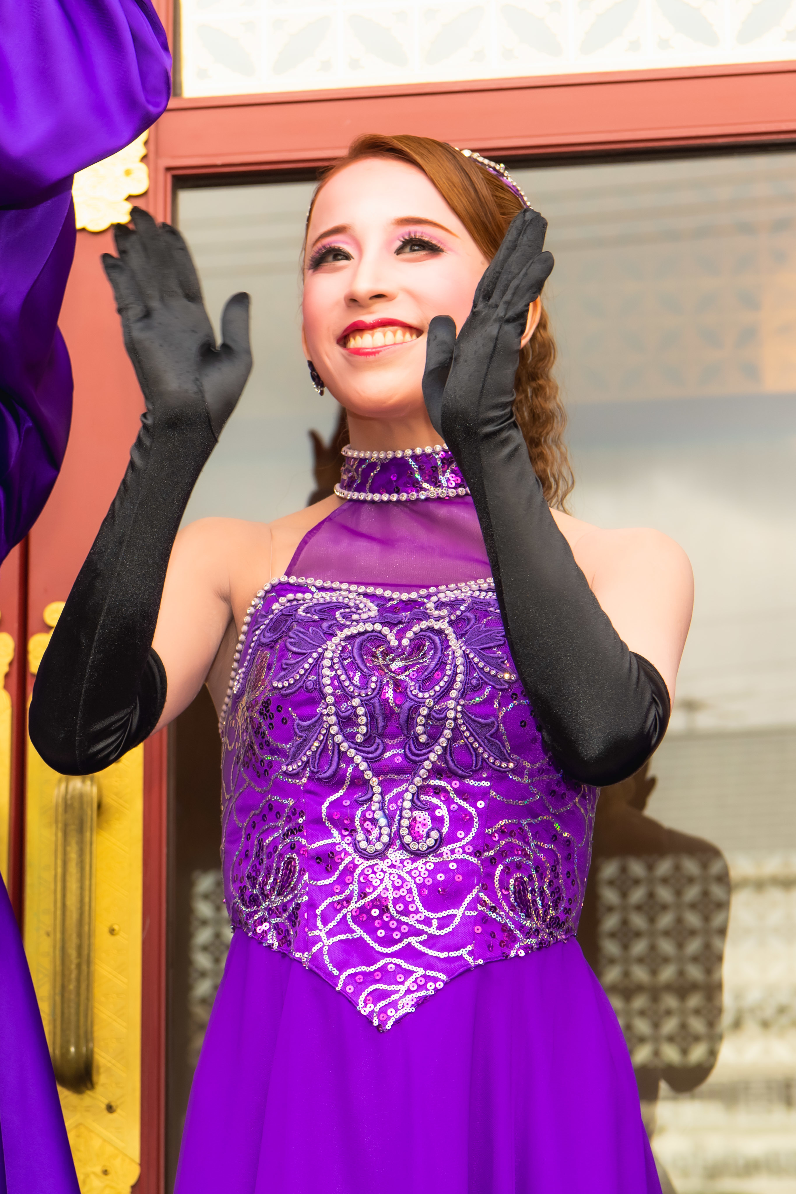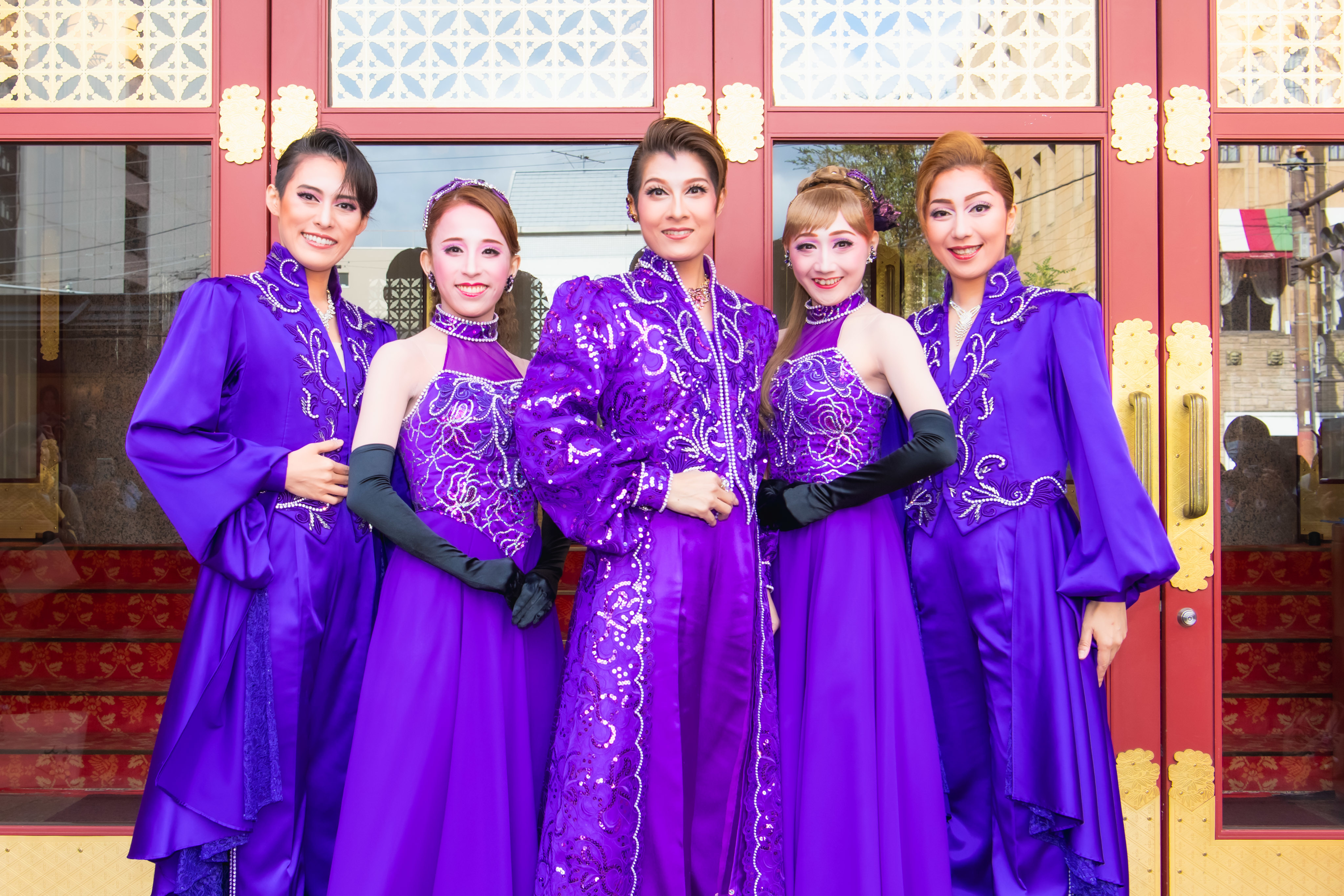 公演初日となる11日(土)には、午前11時の公演の前に、南座のエントランスで劇団員たちのあいさつが行われた。トップスターの楊琳をはじめとする、5人の団員たちがあでやかな舞台衣裳で登場すると、集まったOSKファンたちはもちろん、黒山の人だかりに興味を持って立ち止まった観光客らしき人たちからも「おー」という声が上がる。この華やいだ空気の中で、団員たちは京都の街に向かって、以下のように挨拶をした。