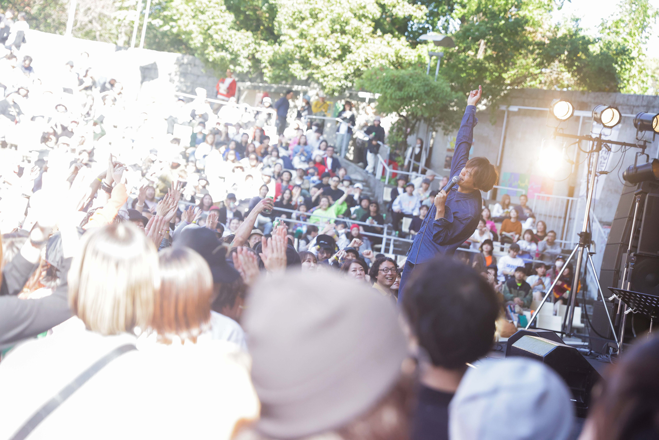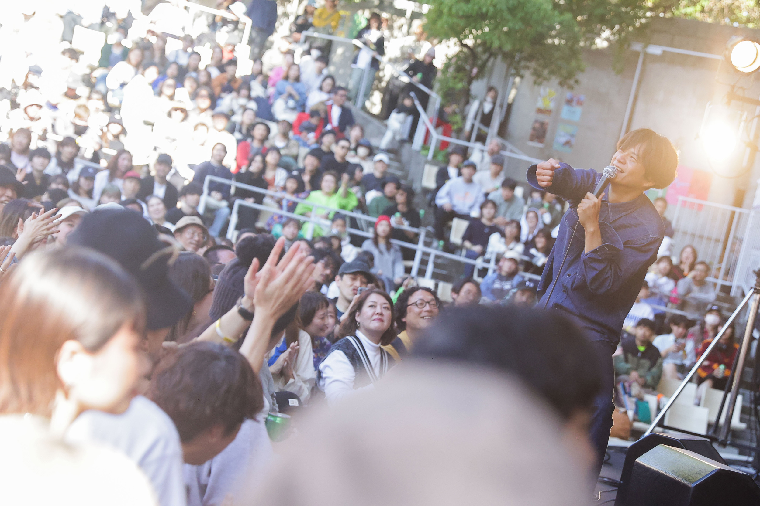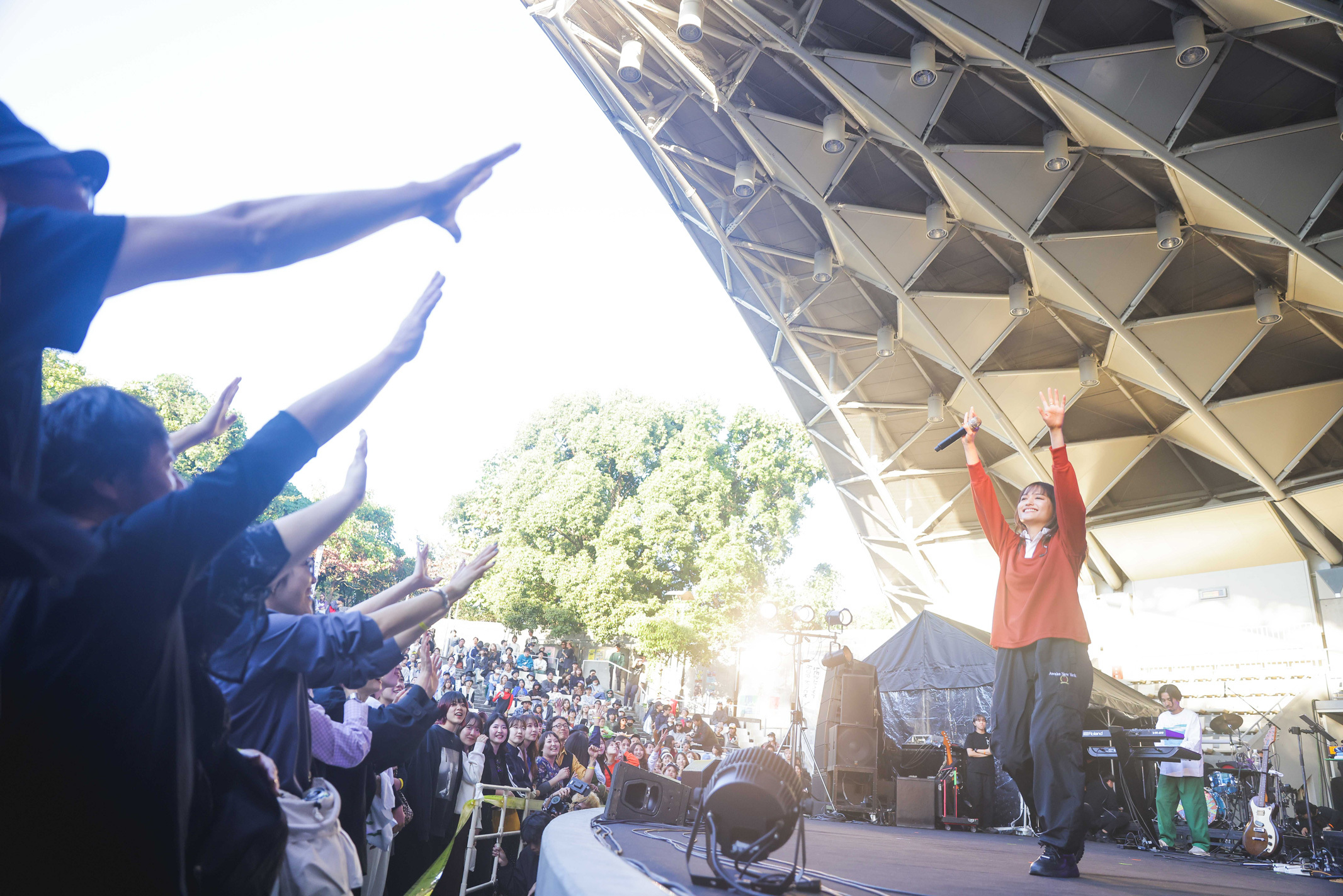 この日のイベントMCはFM802のDJ板東さえかが担当。この日、美容師が1000人ほど集まったらしく、あまりの人数に会場がざわつく瞬間も。さらに、チケットは小学生以下無料ということもあり、小さな子どもを連れてピクニック気分で来場する人も多かった。月曜の真っ昼間に生のライブを楽しめるイベントはなかなか他にはないので、貴重な経験になったはず。なかには小学生くらいの子どももちらほら。話を聞くと、運動会のあとの振替休日なんだとか。パパやママと一緒に月曜のお休みを満喫できるなんて最高だ!