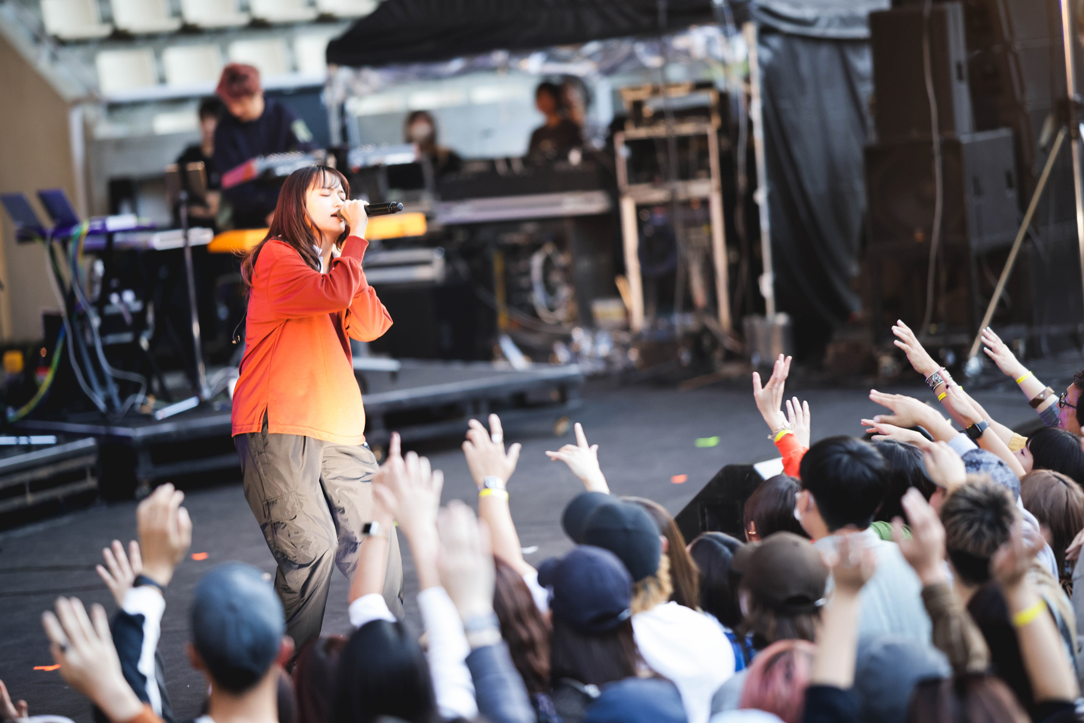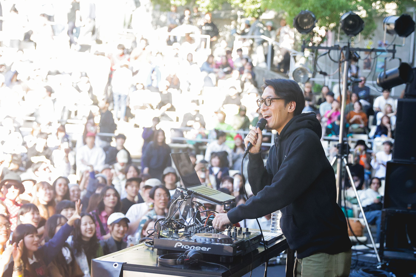 続くtofubeatsは会場をクラブへ早変わりさせていく。「お休み楽しんでますか? いつもお仕事お疲れ様です。今日は僕が仕事します!」と、1曲目「RUN」からご機嫌なサウンドで観客のテンションを高めていく。tofubeatsをはじめ、この日出演するアーティストの誰もが、昼間からのライブは貴重だけれど、この日ならではのセットリストが楽しめるのも気分がいい! この日の出演者はジャンルも世代もバラバラだけど、とにかく“気持ちよく”させることに長けた面々がそろっている。tofubeatsも「LONLEY NIGHTS」、「No.1」と、心地良いビートで観客を躍らせ、気付けばスタンドエリアになっている客席前方には驚くほどたくさんの人が集まっている。