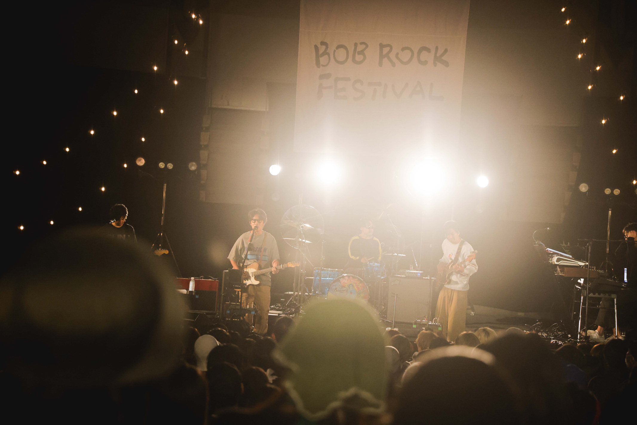 大トリのくるりのライブを前に、会場は夕暮れから夜の空気の匂いが漂ってくる。ステージに灯された白熱電球のオレンジ色が優しく会場を照らしている。