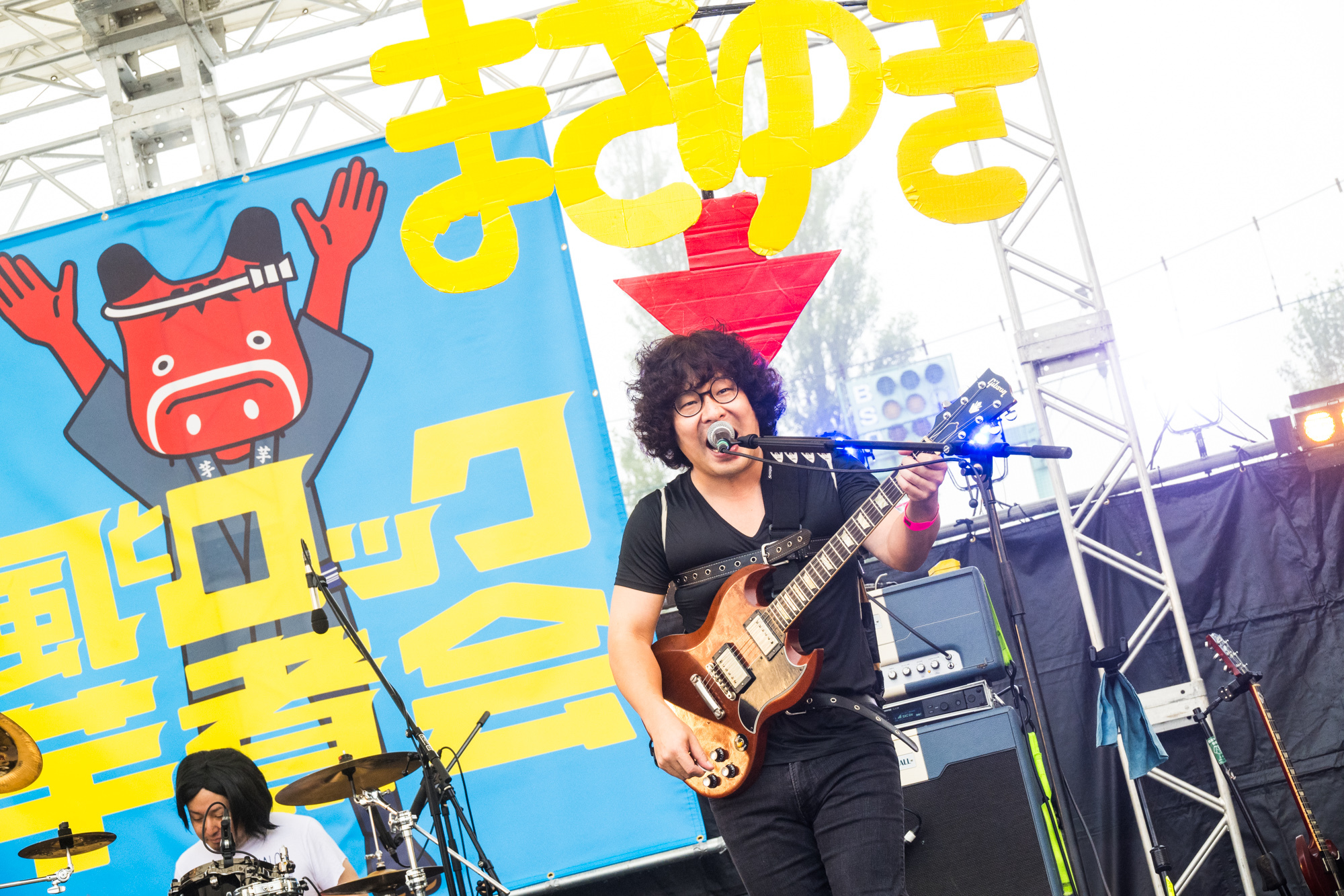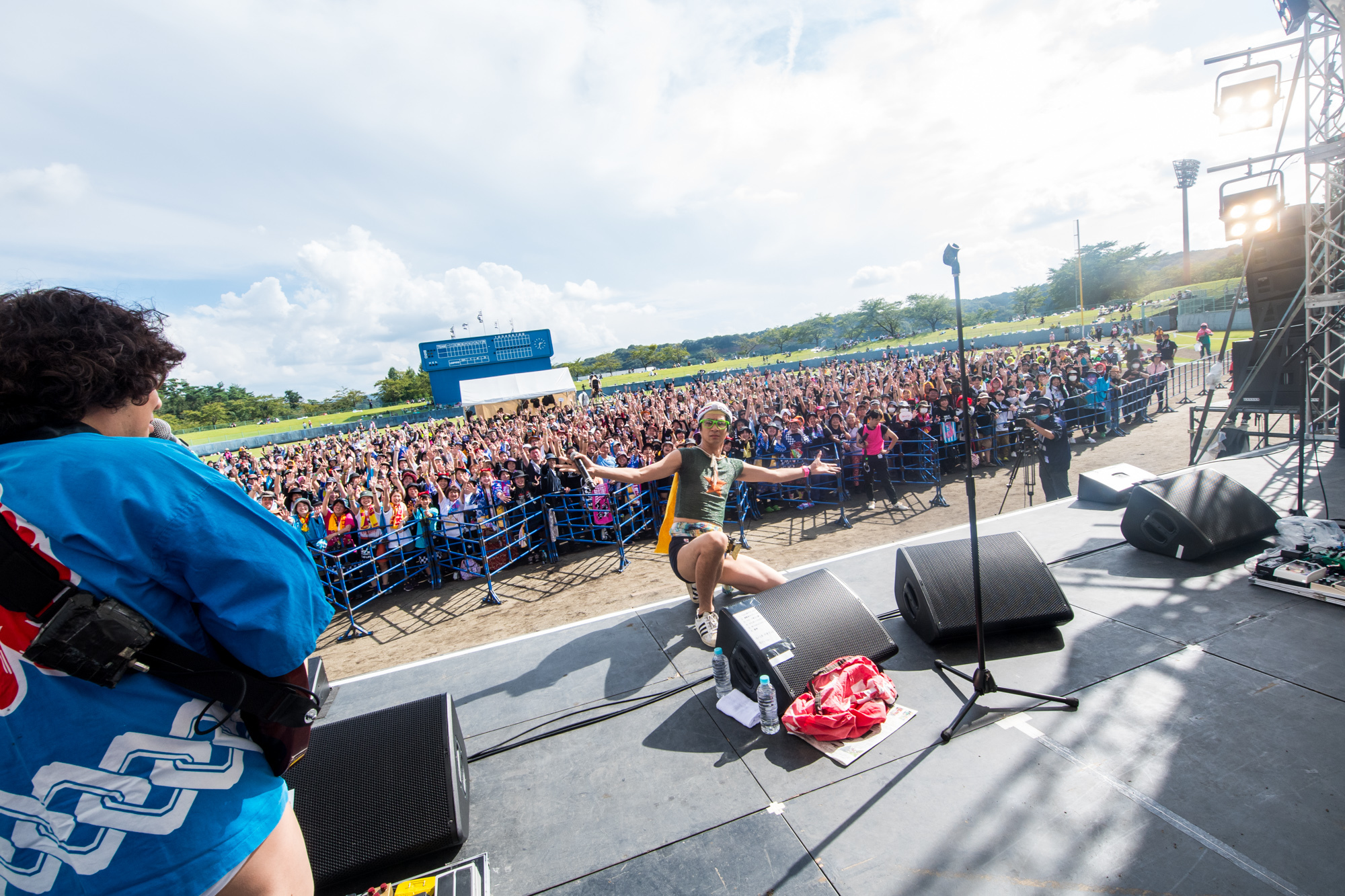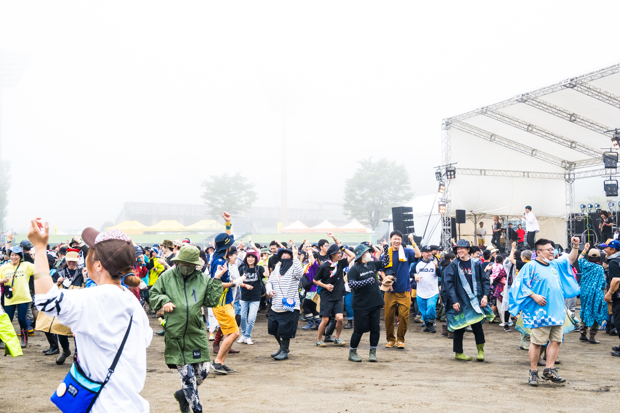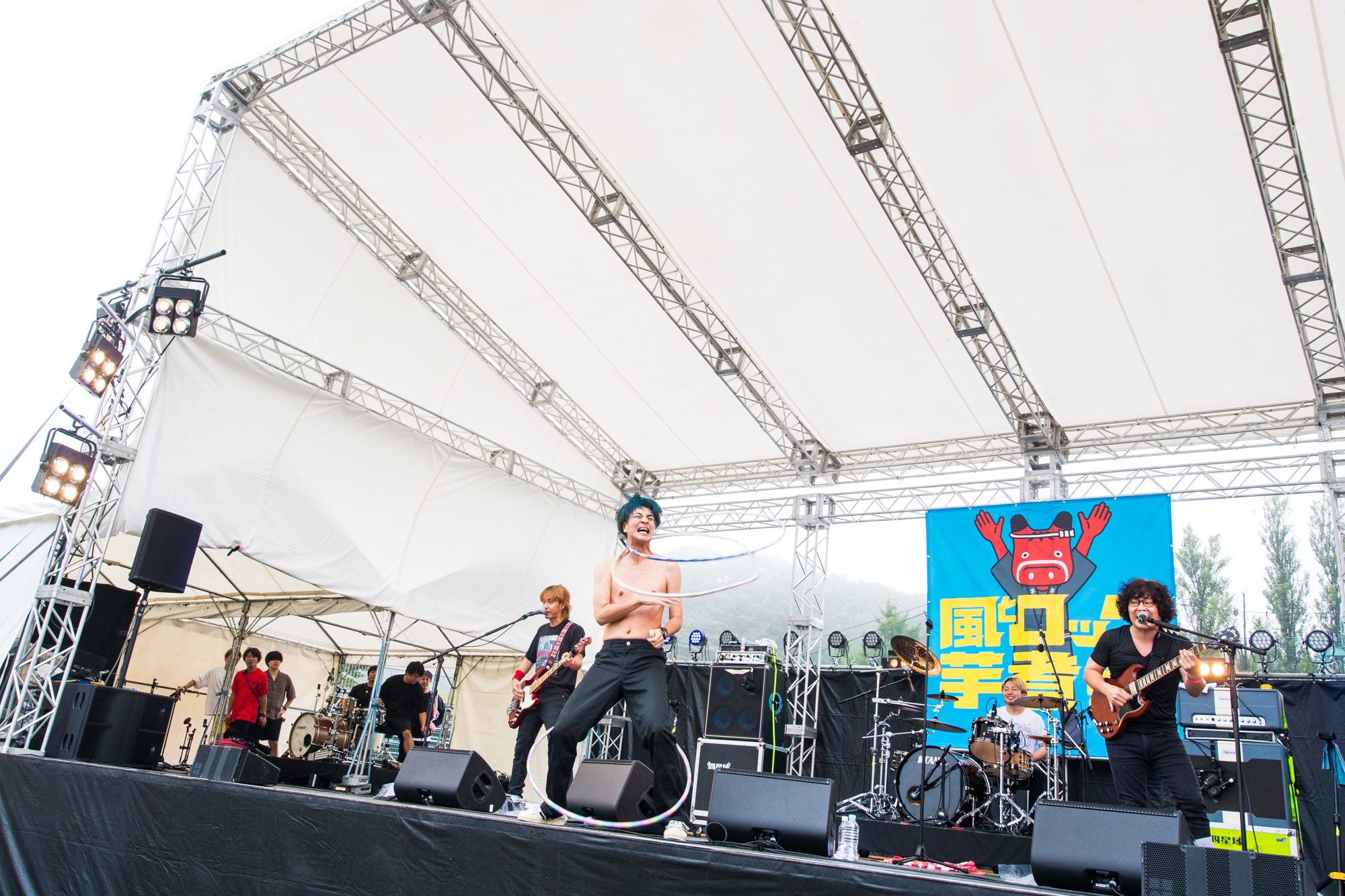 で、これ余談なんですけど、翌朝、箭内に昨夜の御礼を伝えたが、御本人はあまり何も覚えてなかった。この出来事自体が村祭りの前夜祭っぽいではないか。より気持ちが楽になった私であったが、そう思ったのは朝8時前の話。この日一番手、朝10時出場の四星球の入り時間は朝7時半。開園式は朝9時35分。いや、もう本当に村祭りの始まりの時間じゃないか! あっ、開園と言っているのには理由があって、毎年サブタイトル的にテーマが付くのだが、今年は『KAZETOROCK IMONY PARK』。芋煮~パ~ク?? 何も深く考える必要もないし、そんなに深い意味もなく、東京のフェスみたいにガチガチにコンセプチュアルな感じもなく、ただ何となく付けた感じであった。もちろん良い意味でね。そうそう、2017年に『KAZETOROCK IMONY COSMO』が開催されると知ったU太は、「Mr.Cosmo」という持ち曲もあるため、他のフェス会場で箭内に会った時に面識がないにも関わらず、いきなり売り込みをしたという。そして、その年、見事出場となり今に至る。ちなみにな話だが、その話からも、箭内と『風とロック芋煮会』が如何にフランクでフラットかが伝わってくる。