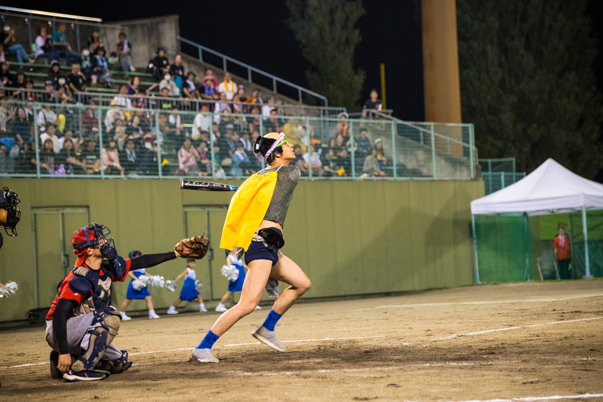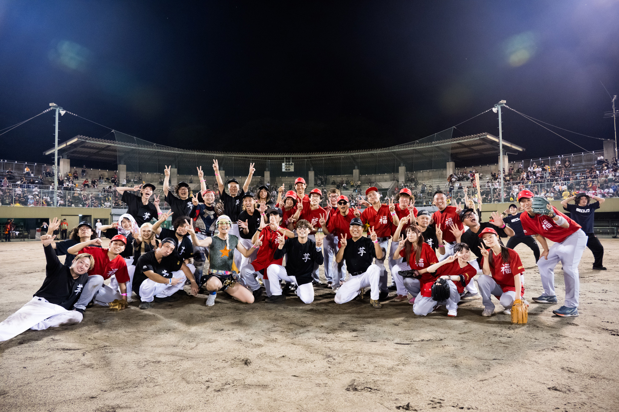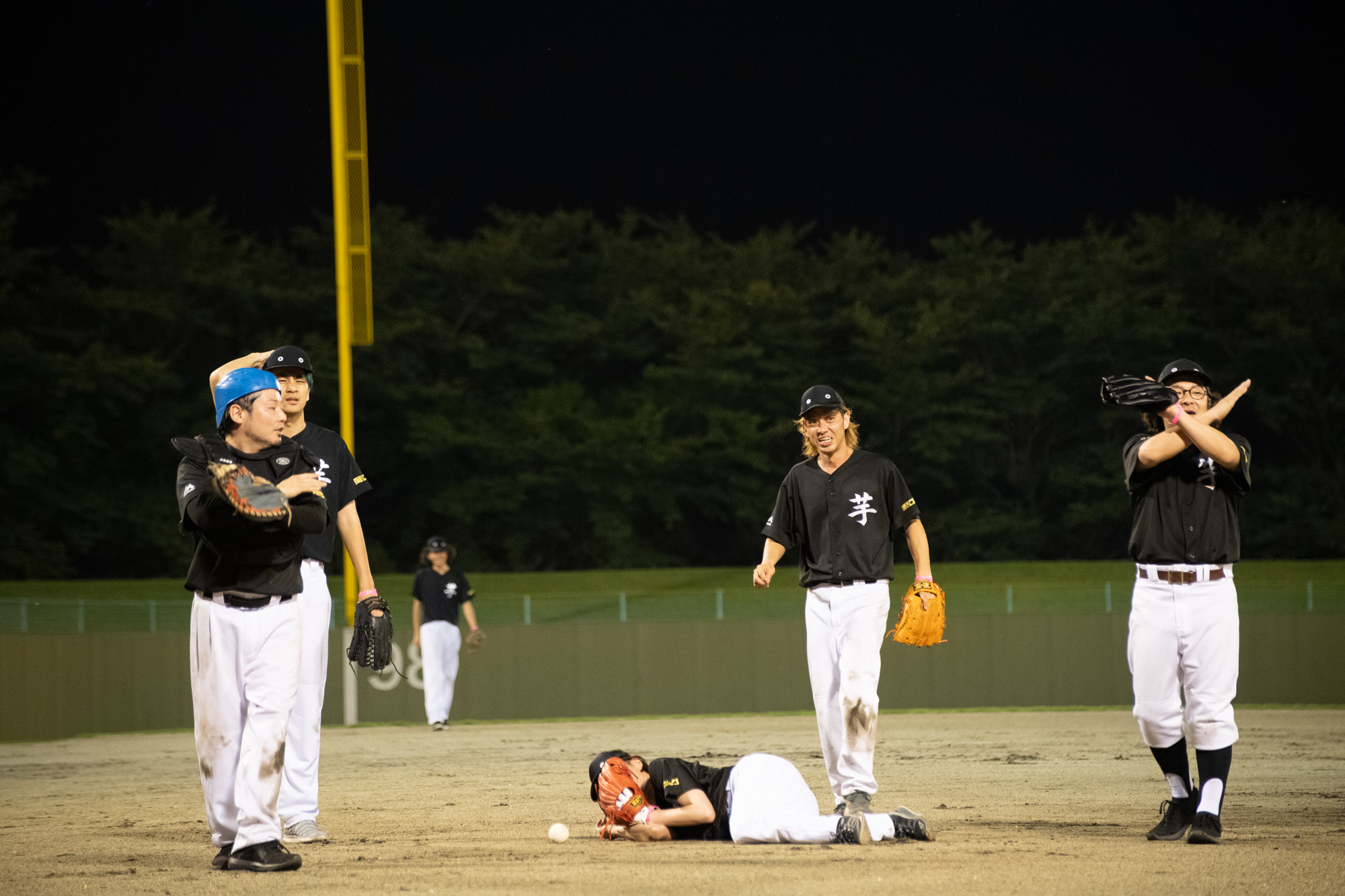 まだメインイベントは控えていると言ったが、それは夕方6時から白河グリーンスタジアムで開催される芋野球。ライブと野球が第一部と第二部の関係性のわけだが、てか、芋野球って何よ? 草野球じゃなくて芋野球!? 福島県出身者と、その他のミュージシャンチームに分かれて野球対決をするわけだが、地元の子供たちによるチアリーディングや観客有志によるブラスバンドなど、かなりの賑わいになる。