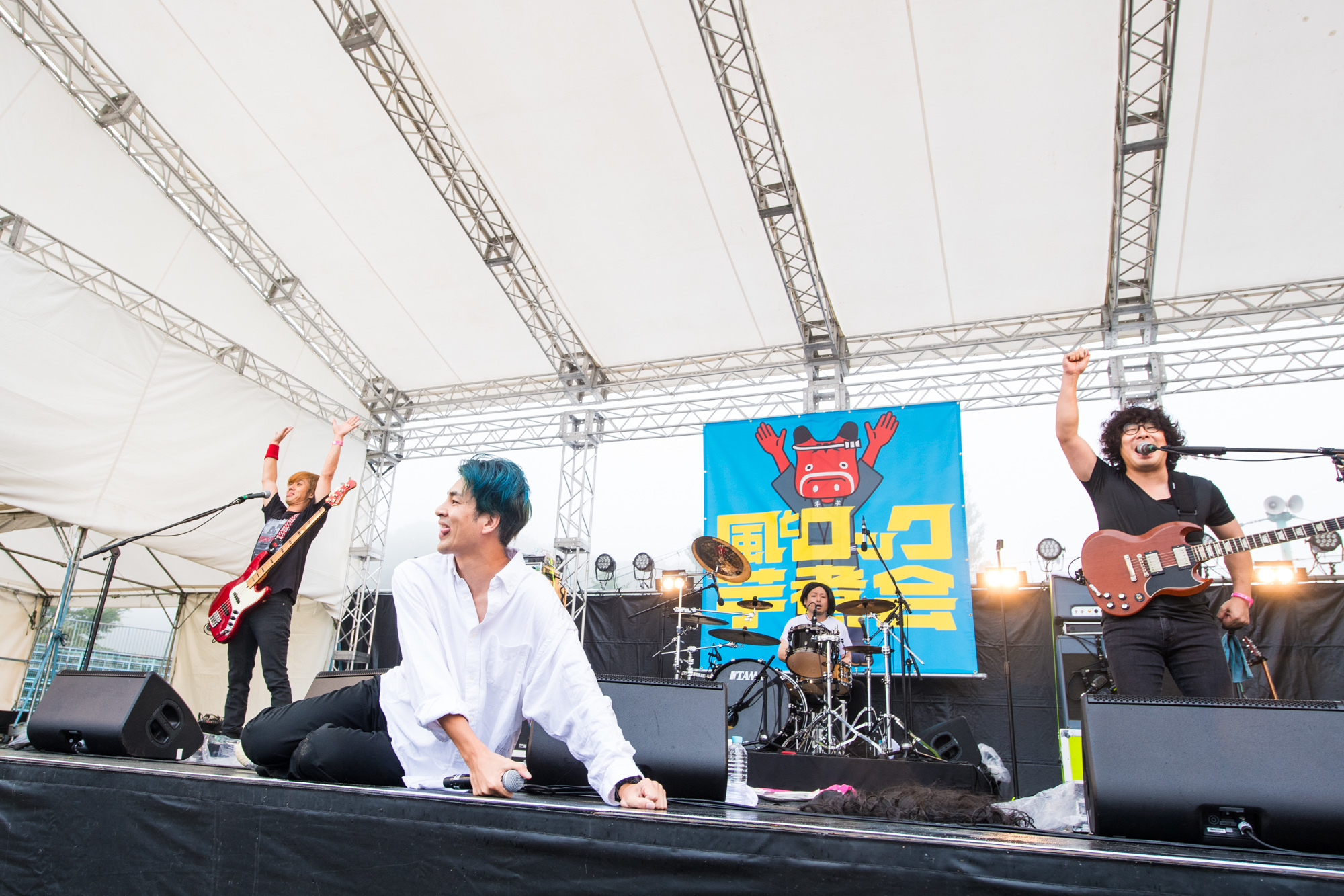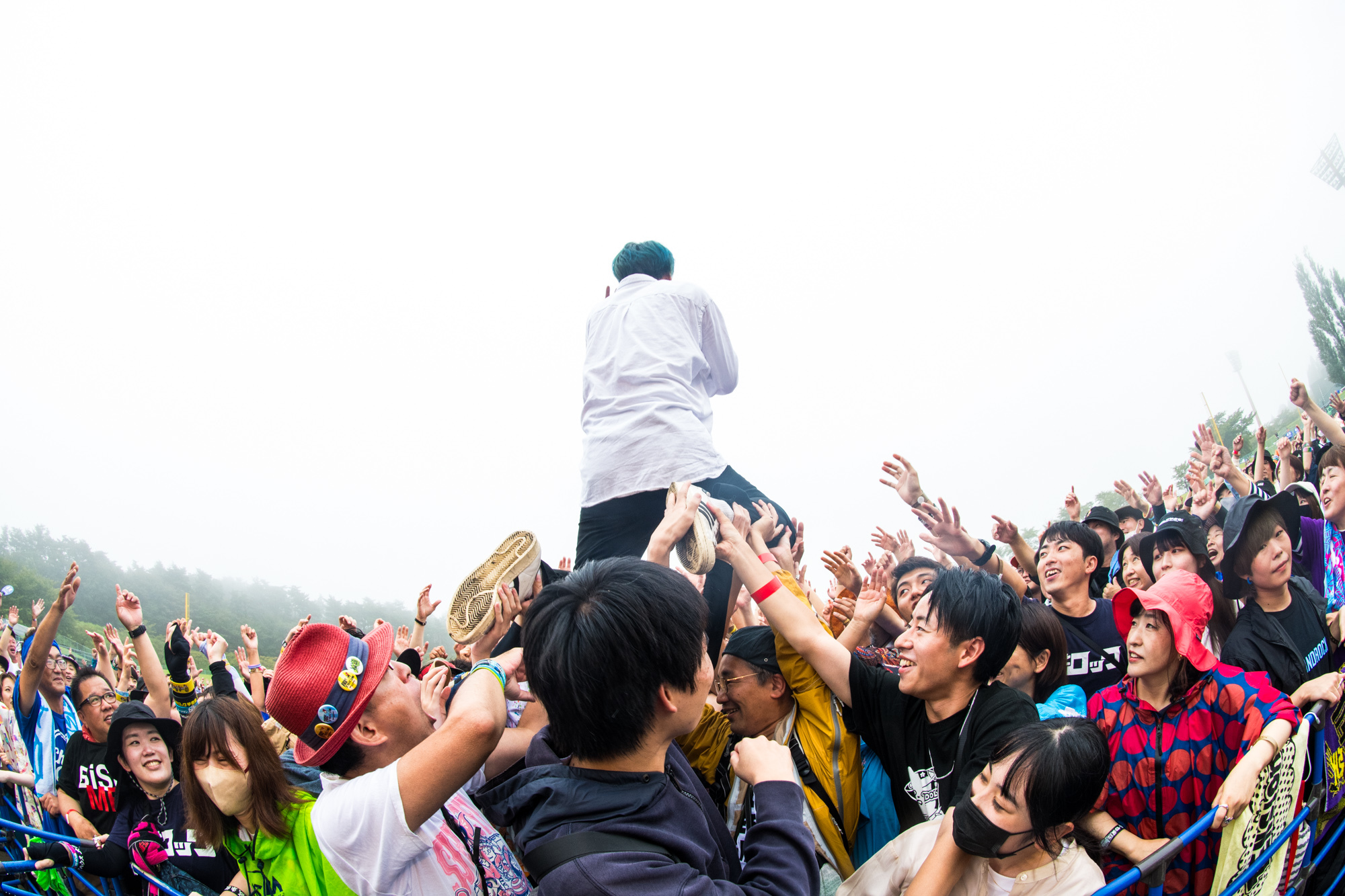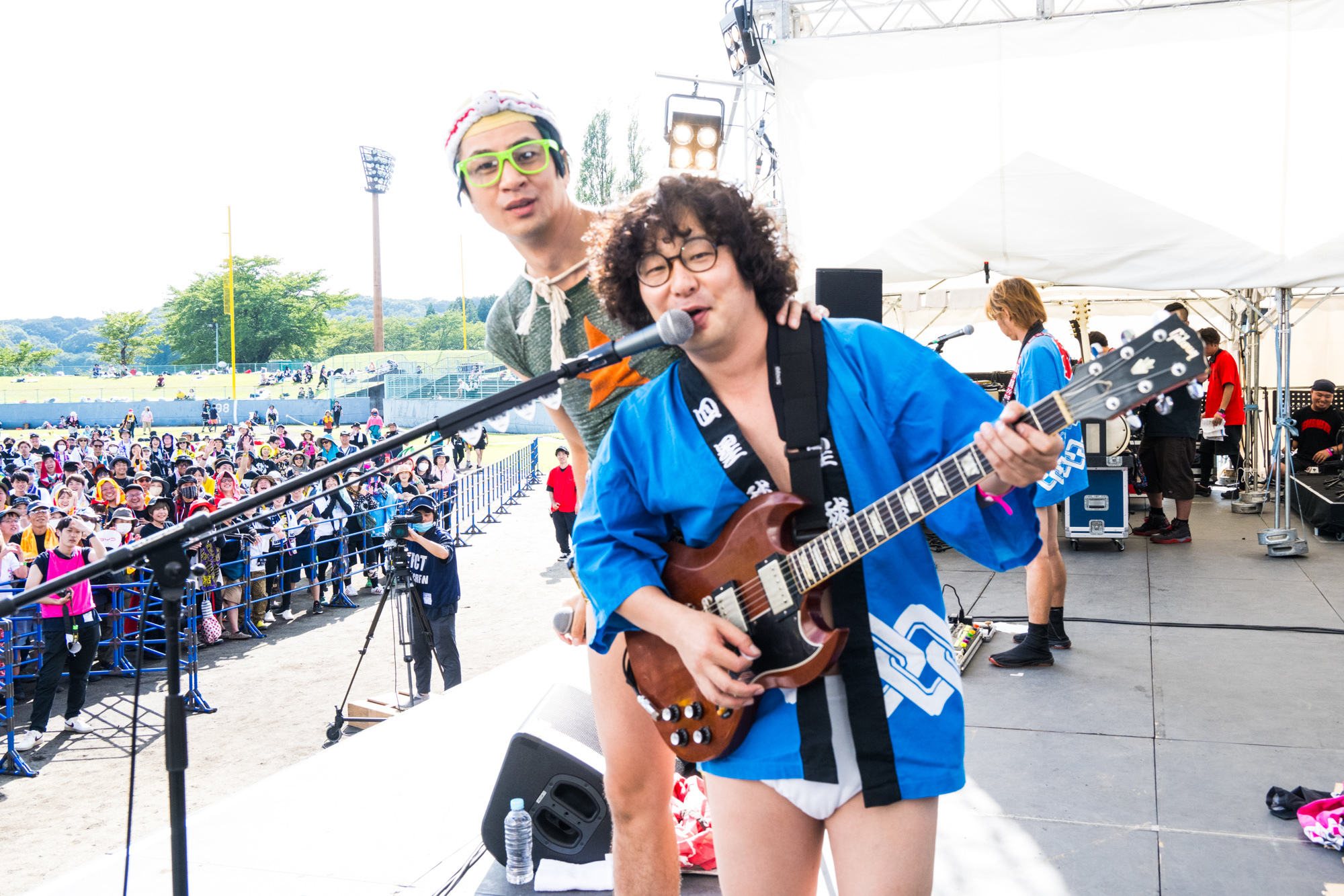 しかし、ハチャメチャさは或る意味、四星球の真骨頂。初っ端から、この日のトリであるTHE BACK HORNに扮して登場したりとやりたい放題だが、モッシュダイブは甘さもあり辛さもあり、まさしく甘辛いではないかと、市長のトンチンカンな回答を見事に伏線回収する北島康雄。また、普通のフェスは「やったるぞ!」だが、『風とロック芋煮会』は「楽しむぞ!」と分けた上で、「楽しむぞ!」だとヌルくなってしまうこそ「楽しむぞをやったるぞ!」だと、これまた見事に宣言していく康雄。相も変わらず天晴れな四星球。ライブ終わり、撤収作業を済ませ、「ろっくんろーる横丁」の横を通りながら、グリーンスタジアム横の楽屋エリアに戻っていくが、先程までライブを観ていた観客たちが普通に話しかけてくる。演者と観客の距離が普通のフェスでは有り得ないくらいに近いが、それが村祭りの良さであろう。