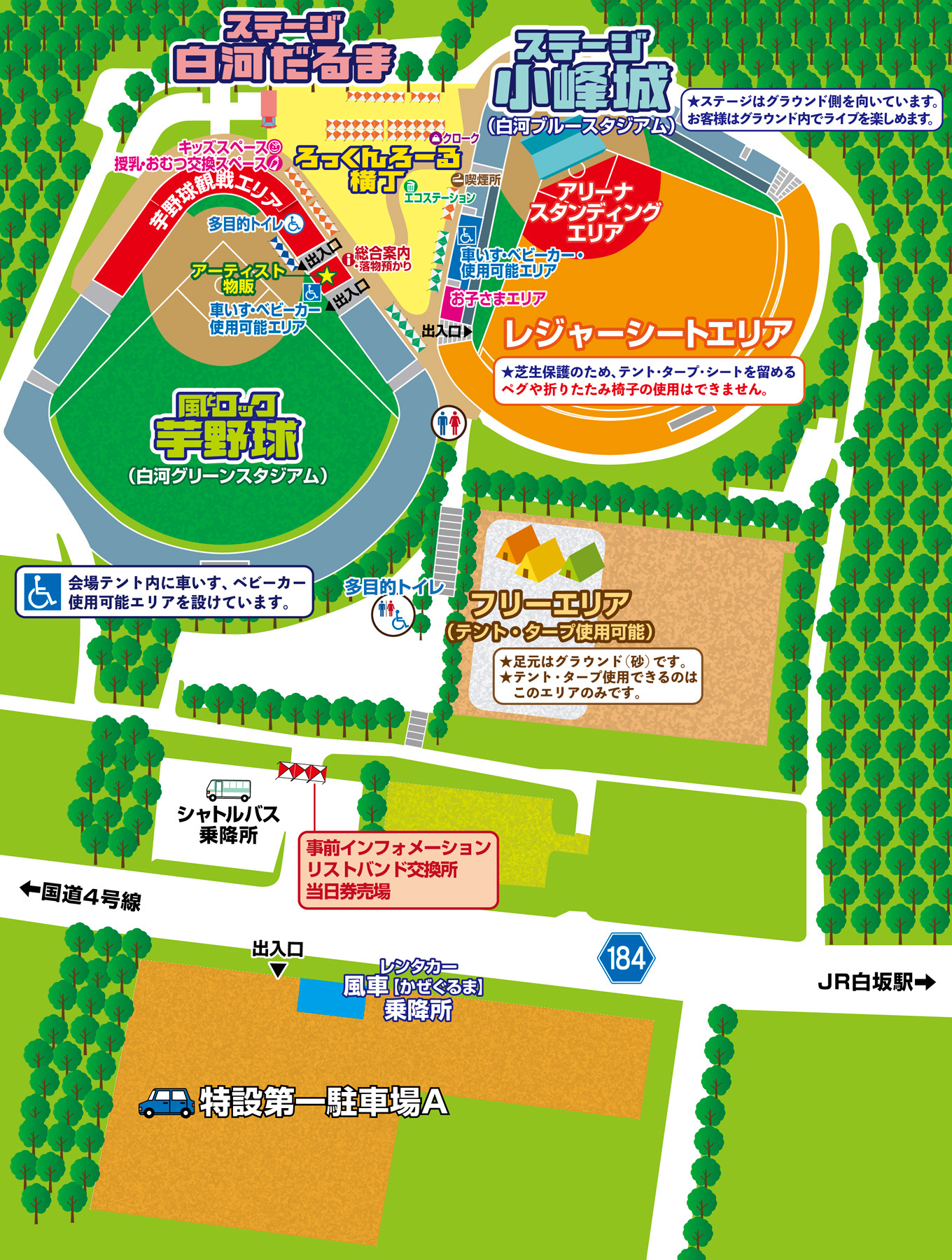 会場入りして驚いたのは、その会場の成り立ち。しらさかの森スポーツ公園内にあるふたつの野球場を軸にしているのだが、「ステージ小峰城」と名付けられた白河ブルースタジアムでライブが行われて、憩いの広場という広場を抜けると白河グリーンスタジアムがあり、夕方からは、そこで芋野球が開催される。芋野球の説明は後に置いといてだが、憩いの広場は「ろっくんろーる横丁」と名付けられて、約45店舗が設置されている。もりそば・ぶっかけそば、白ご飯、ラーメンなど地元の特産品ブースから、箭内と関係性があるグリコ・ダンロップ・花王・日産・JTといったスポンサーブース、公式フォトグラファーであり東北を撮り続ける石井麻木のブース、福島県南相馬で開催される「騎馬武者ロックフェス」ブースから、地元の県広報課や商工会や高校のブースや音楽番組まで、ありとあらゆるブースが並んでいた。ポッキー型の長い風船が配られていたり、ストラックアウト、だるま絵付け体験などなど、ちゃんとした大人たちもたくさん関わっているはずなのに、緩やかで穏やかな村祭り感は一切失われていない。その「ろっくんろーる横丁」には「ステージ白河だるま」というミニステージもあり、アコースティックライブを中心とした催し物が目白押しである。今年は、その場所で夜9時から後夜祭的に「おばんですパーク」なるものも初開催されるが、これも後程に。