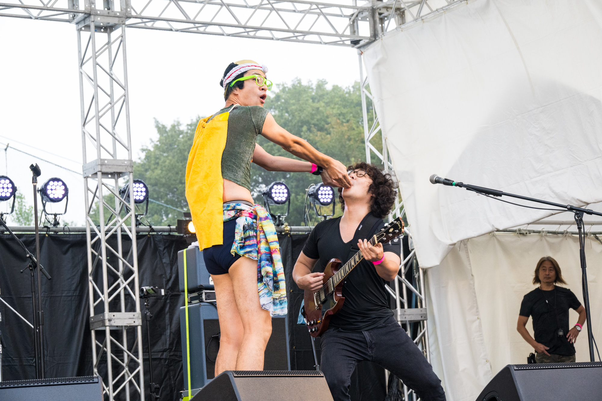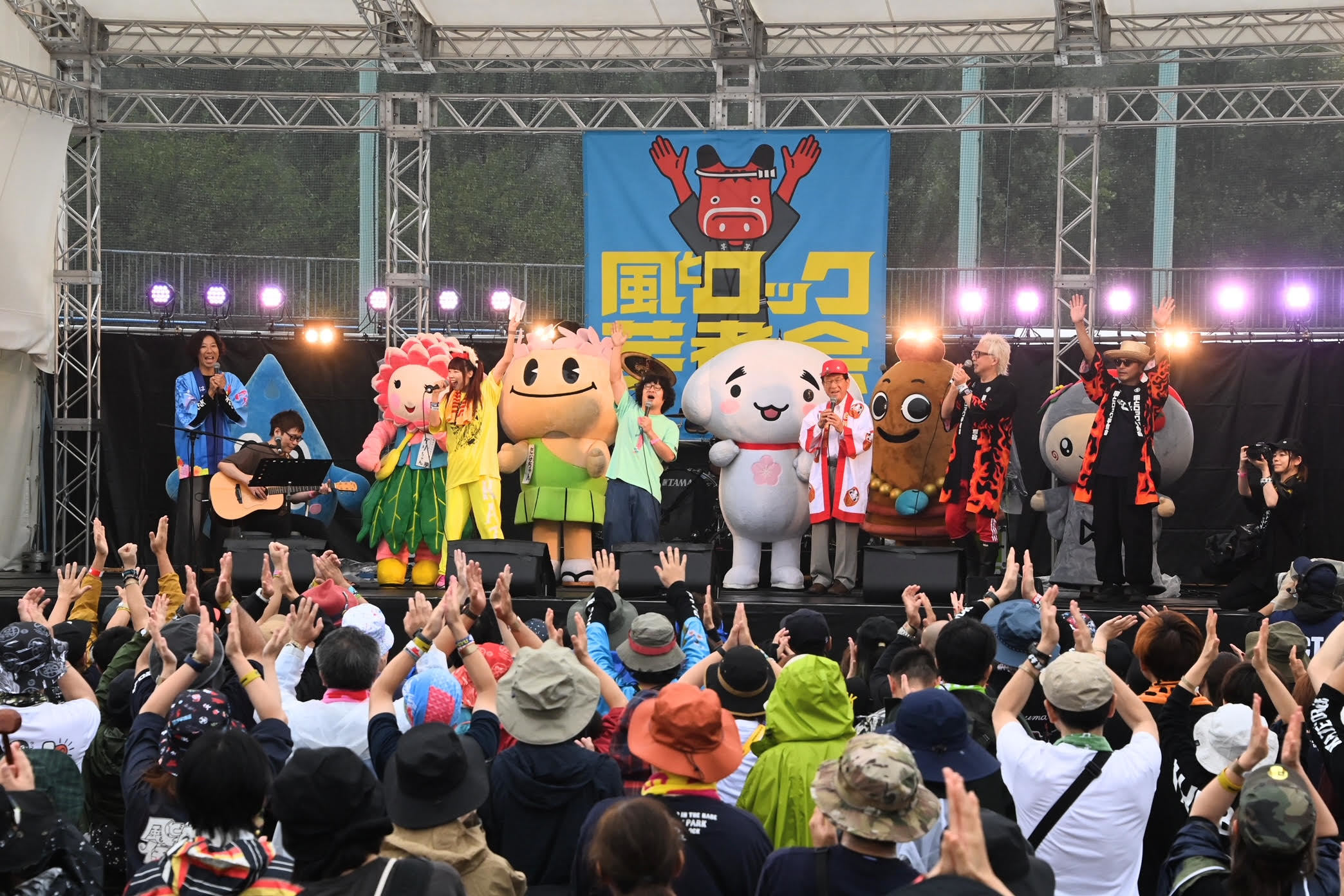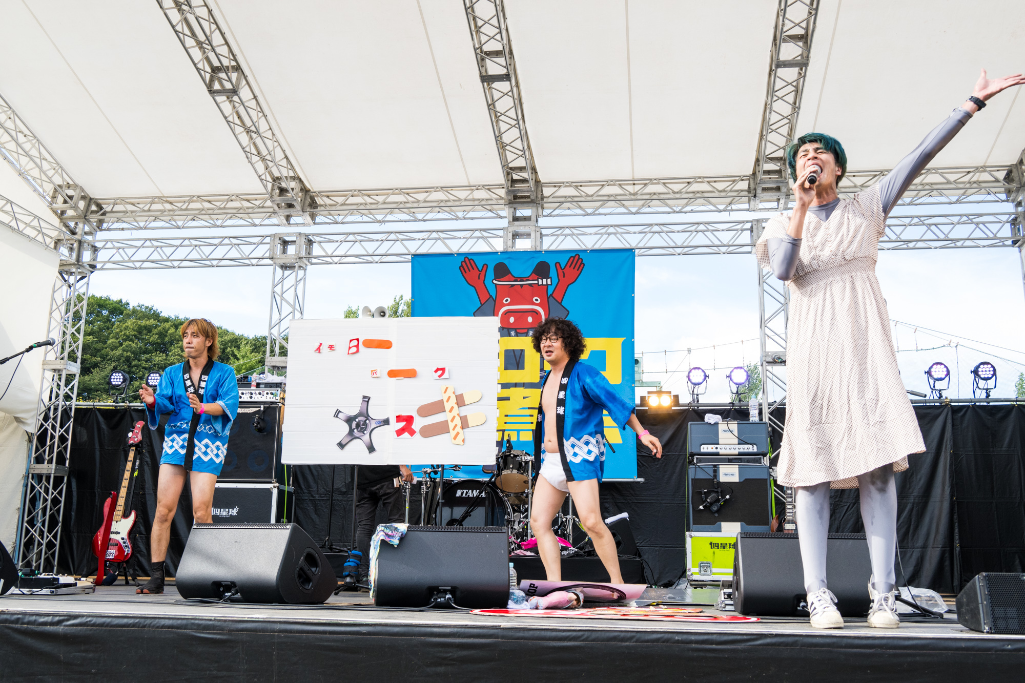 そこから箭内は市長に市井のことも知った方が良いという無茶苦茶な理由から、モッシュダイブについて市長に尋ねて、チンプンカンプンな市長からは「甘辛い食べ物?」という珍答が返ってくる。気が付いたら、箭内はゆるきゃらたちにマイクを押し付けて喋らそうとしているし、のんびりほのぼの緩やか穏やかながらもアナーキーパンキッシュさも感じ取られて、早朝から何を25分も観させられているんだと思わず笑ってしまう。っていうか、笑うしかない。何故か途中からステージに上げられた四星球のギターまさやんが9時55分までステージ上にいさせられたりとハチャメチャ!