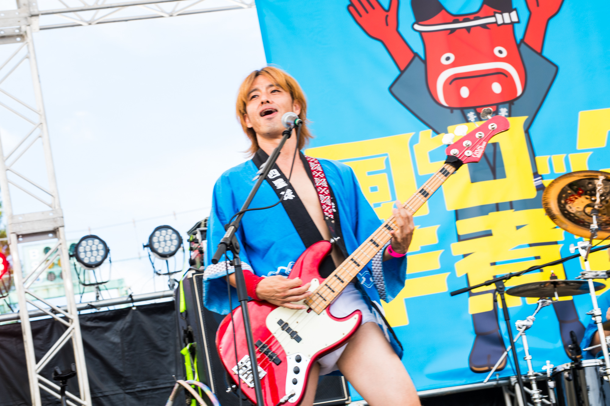 あぁ~、もう、それしか無いわ……というキラーフレーズ&パンチライン。村祭りは村祭りでも、”TOP OF THE 村祭り”である奇祭なのだ。それならば全てが成立する。夜8時には芋野球は終わり、四星球チームはホテルに帰るというが、奇祭とわかった以上は夜9時からの「おばんですパーク」を最後まで絶対的に見届けたいし、何よりもハシリコミーズを観たいので、ひとり残ることに。まさやんも渡辺、藤井、LOW IQ 01が出場する歌パートに急遽緊急出場するという。タイムテーブル以外の事が起きても、何も驚かなくなった、だって奇祭なんだから! 本来は東京に帰るはずのTHE BACK HORN・山田将司も、それこそ急遽緊急スケジュールを変更して残り、歌うことに。奇祭は良い意味で人を狂わす! 夜11時ハシリコミーズの出番がくる。編成は昼間と同じだが、夜の部は3人とも座りながらの演奏。