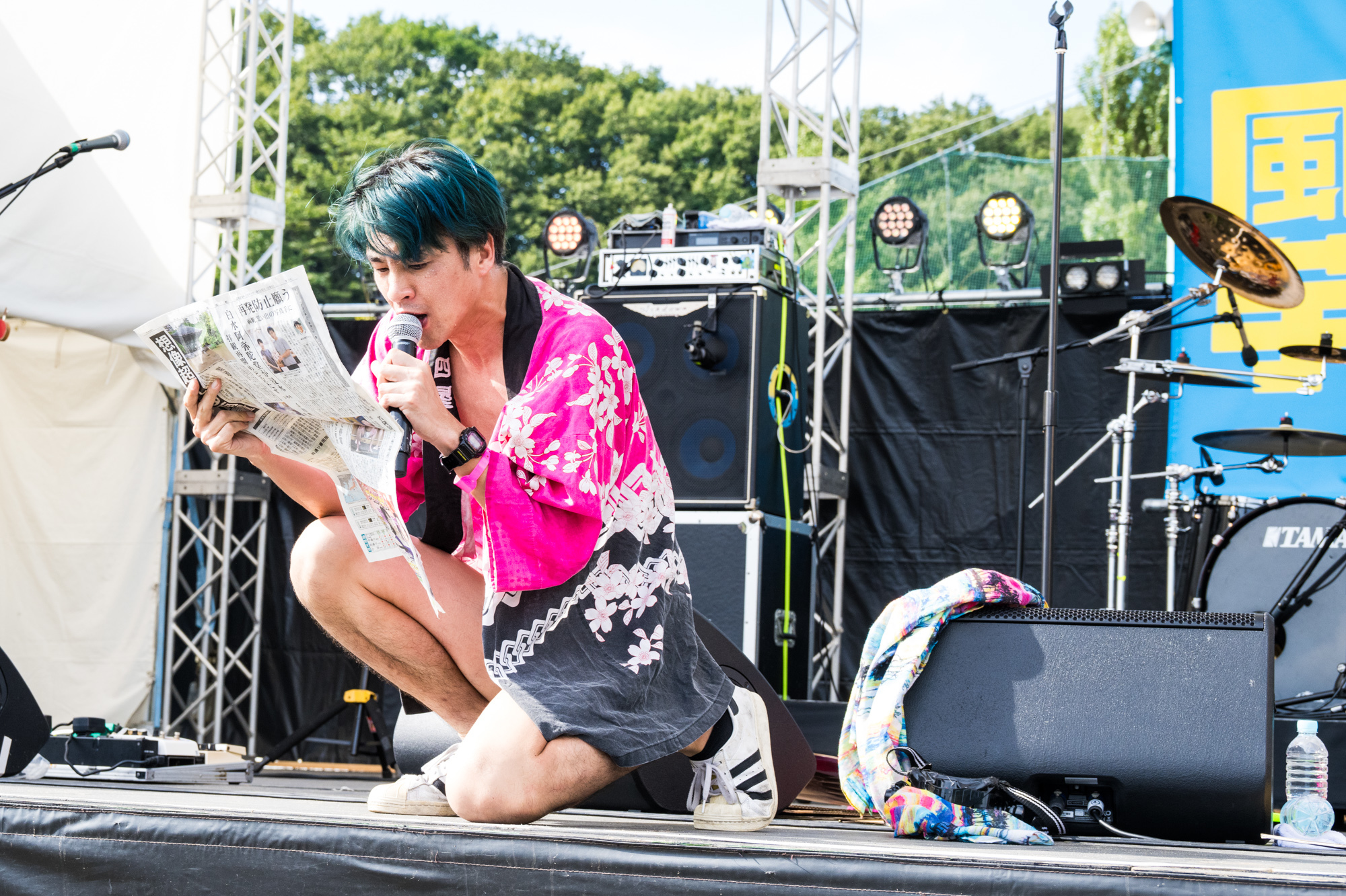 「ステージ白河だるま」朝11時15分、すーしんちゅう。四星球のアコースティックライブだが、初日「ステージ小峰城」でのライブを再現するという。決して一筋縄にはいかないところが、彼らの良きところ。ミニステージにも関わらず、朝っぱらから人垣が出来ている。初っ端から康雄は、福島民報の記事に四星球が掲載されていないことをグチグチ言っている。明るく楽しくイジっているとはいえ、この康雄の根の持ち方は個人的に大好きである。さて、終盤、観客からリクエストを募り、そのリクエストに沿った小道具を3分で作るという、まさやんが! リクエストのお玉を3分以上かかりながらも、まさやんが必死に作り、そのお玉を巡って観客が争奪じゃんけん大会をする。ところが、康雄によく似ていると噂される謎のヒーローであるちょんまげマンが出現して、そのお玉を完膚なきまでにブッ壊してしまう。ステージ横の関係者エリアでは渡辺が腹を抱えて爆笑している。本当に良い光景だった。そんな超ハチャメチャちょんまげマンが最後に言い残した言葉は……。