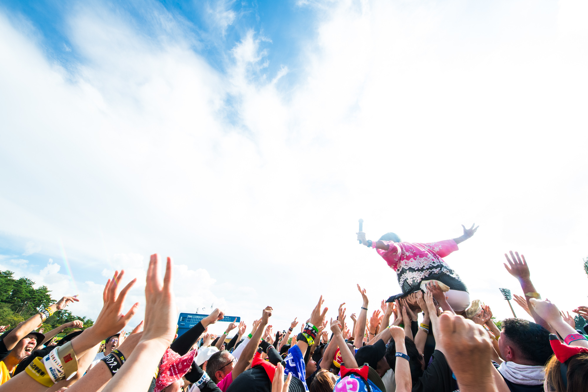 さて時計の針を朝9時35分開園式に戻すが、一番手四星球出番10時であり、25分も必要なのだろうかと思っていたが、とっても盛りだくさんな開園式であった。箭内と松田という実行委員長副委員長ふたりに加えて、常連メンバーである音速ラインの藤井敬之、元でんぱ組.incえいたそこと成瀬瑛美という全員福島県出身の演者たちと福島県県南ゆるきゃらたちプラス、何と白河市長まで登場する。共催で白河市が参加していることもあるが、本当に地元を挙げての祭なのだ。前日の台風による被害で福島県いわき市が交通止めとなり、会場に来れない人もいるという切実な話も明かされた。そして、今年はモッシュダイブ禁止という話もされたが、いわゆる有名フェスにおけるシリアスな議論ではなくて、単純に財政難により鉄柵が用意できず、プラスチック柵になったからというシンプルな理由であり、ついついほのぼのしてしまう。