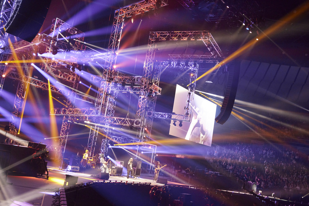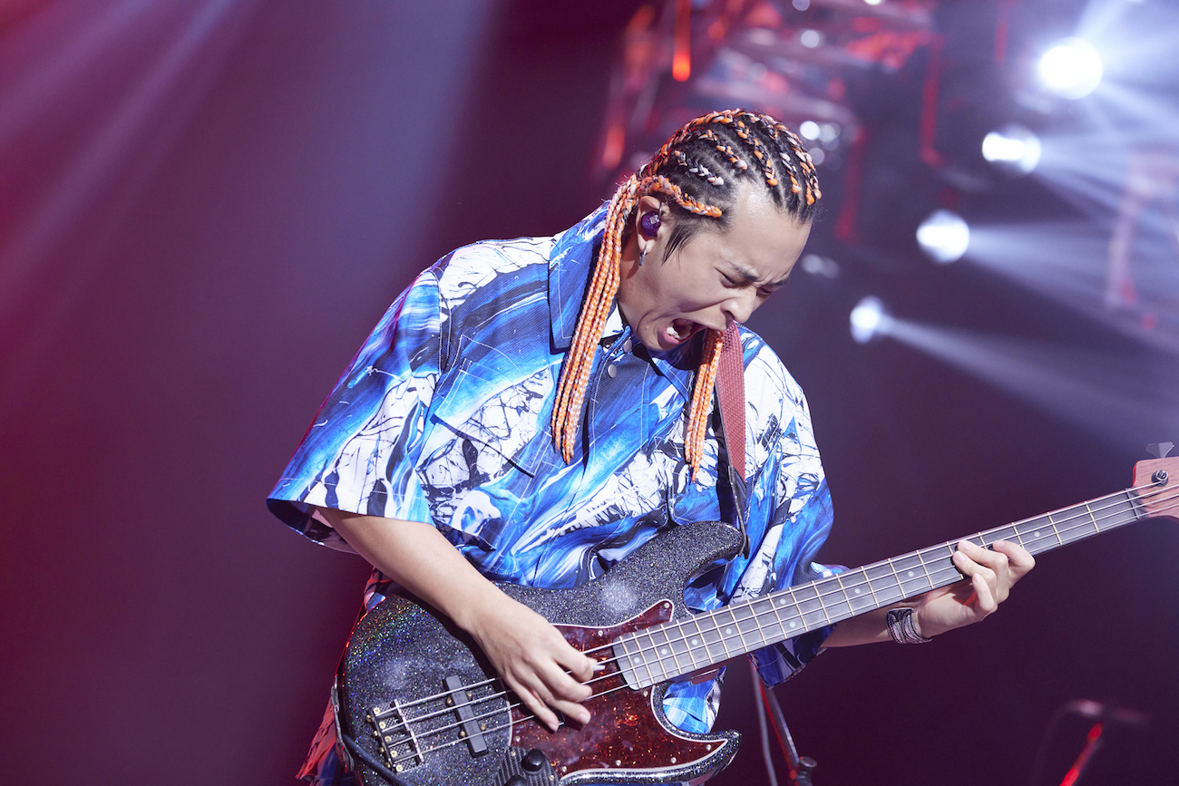 トップバッターを務めたのは7人組オルタナティブ歌謡舞踊集団の龍宮城。プロデュースは前日(Day2)に出演した女王蜂のアヴちゃん。メンバーがセンターで円になって始まったのは、プレ・デビュー曲の「RONDO」。キレのあるアグレッシブなダンスで客席を圧倒。場内もサイリウム・ペンライトが一斉に点灯され、ダンスに合わせて揺れる。「Mr.FORTUNE」では、龍宮城ライブでのお約束"ジョジョ立ち"も披露し客席を沸かせる。3曲立て続けに演奏されたあと、最上段スタンドまでぎっしり埋まった場内を見回してRayは『初めてみたライブ会場が横浜アリーナでした。今度はワンマンで戻って来たいと思います!』と横アリ・ワンマン宣言。