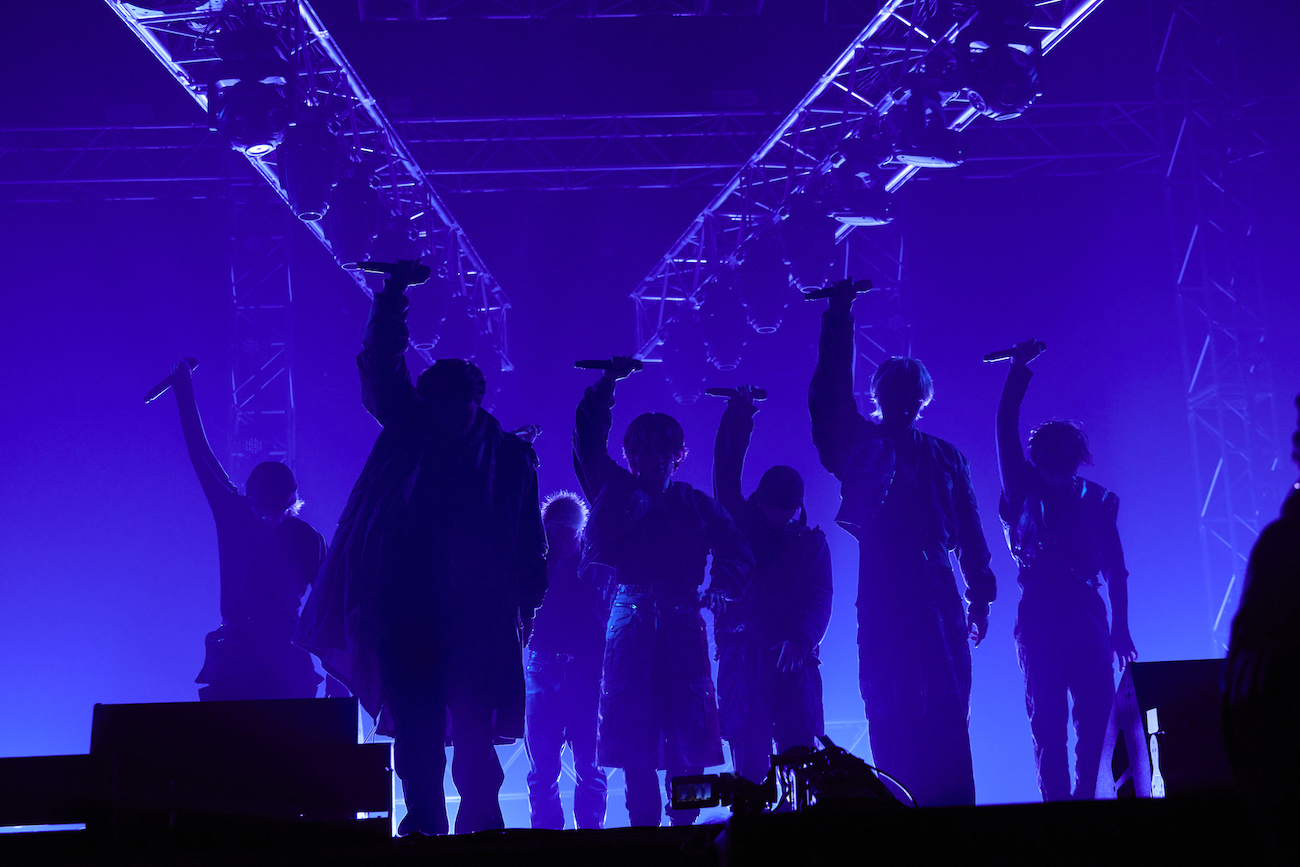 「ネクスト・アーティスト!」とスクリーンに写真が映し出されや、場内が騒然とする。3組目は2021年以来、バズリズム LIVE 2回目の登場となるBE:FIRSTの7人。重量級のヒップホップ・ナンバー「Boom Boom Back」で幕を開け、続く「Milli-Billi」ではメンバー全員でラップをマイク・リレーで披露。立て続けにアップ・チューンを披露したあとは、一転してR&Bテイスト漂うミディアム・テンポナンバー。曲調に合わせスピーディにポジションを入れ替わるコレオグラフが美しく、オーディエンスもうっとりと見つめる。続いては再びアップチューンの「Brave Generation」になだれ込む。中盤には左右の花道いっぱいに広がりオーディエンスに最接近。もちろん観客は大喜び。メンバーもこれに応えるように大きく手を振り、ステージと客席が幸せなオーラに包まれ一体化する。