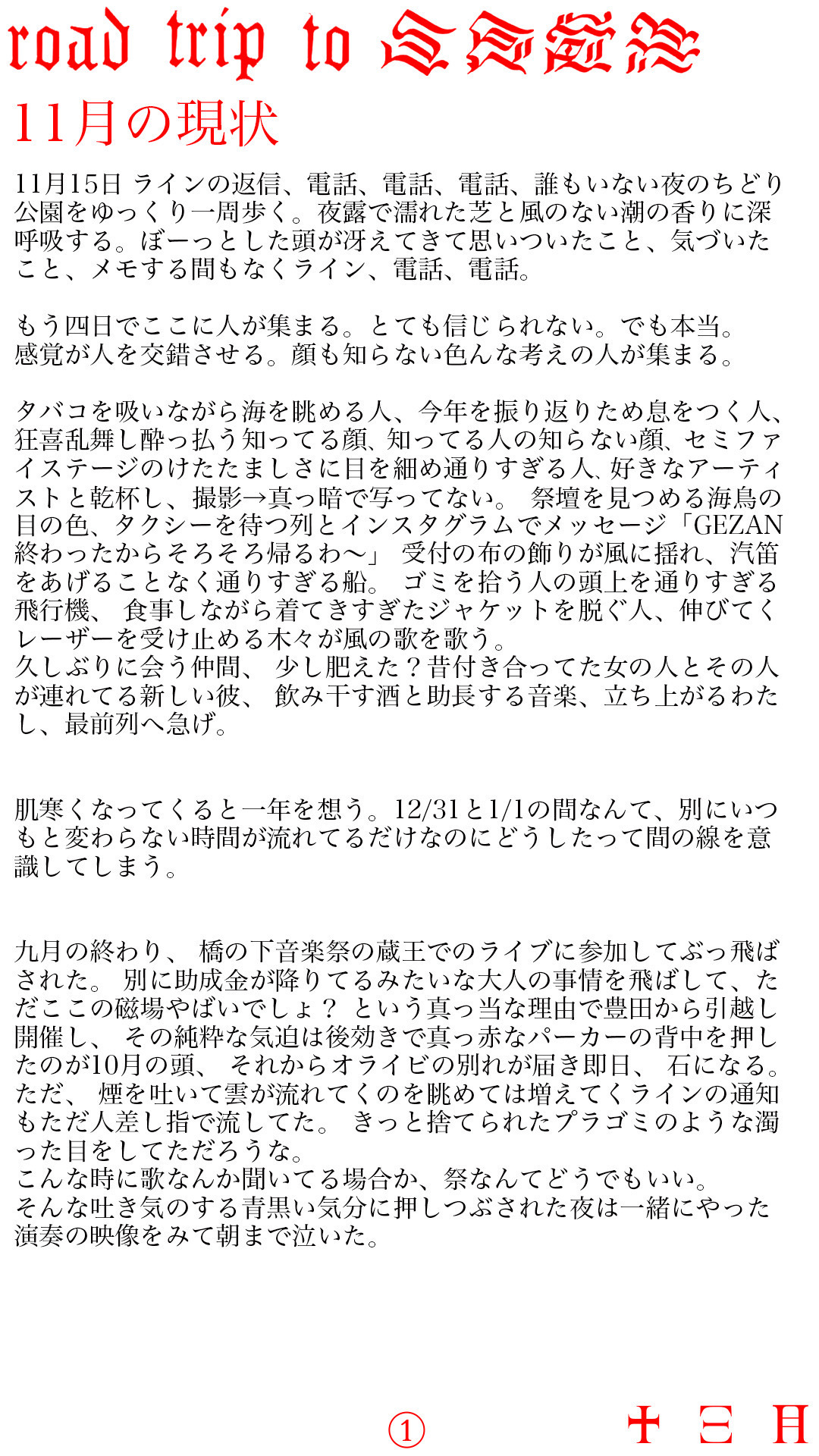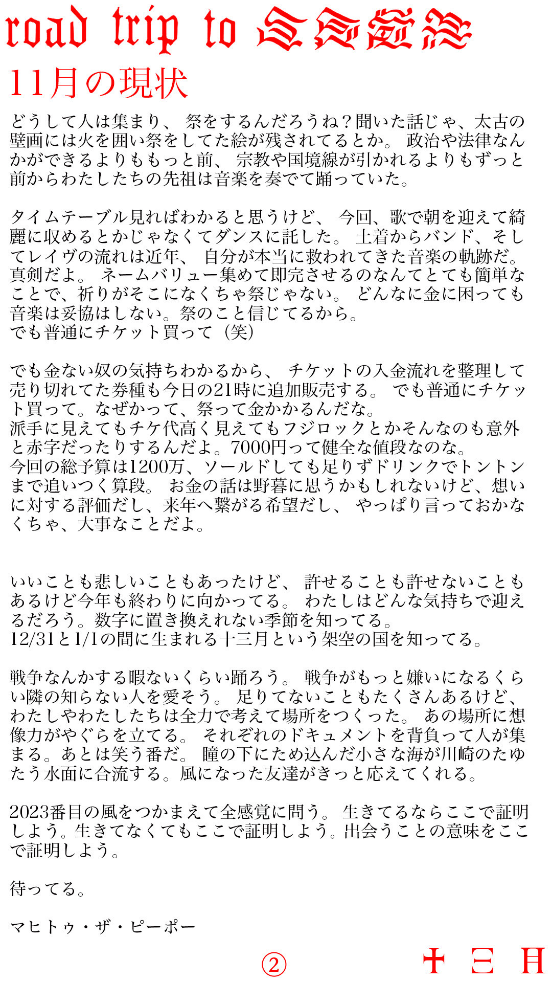GEZAN主宰レーベル・十三月が今週末11月18日(土)深夜に開催する野外イベント『Road Trip To 全感覚祭』のタイムテーブルとステージ割りが発表された。併せて、マヒトゥ・ザ・ピーポーからのコメントも到着した。