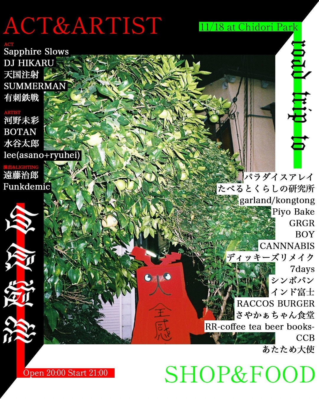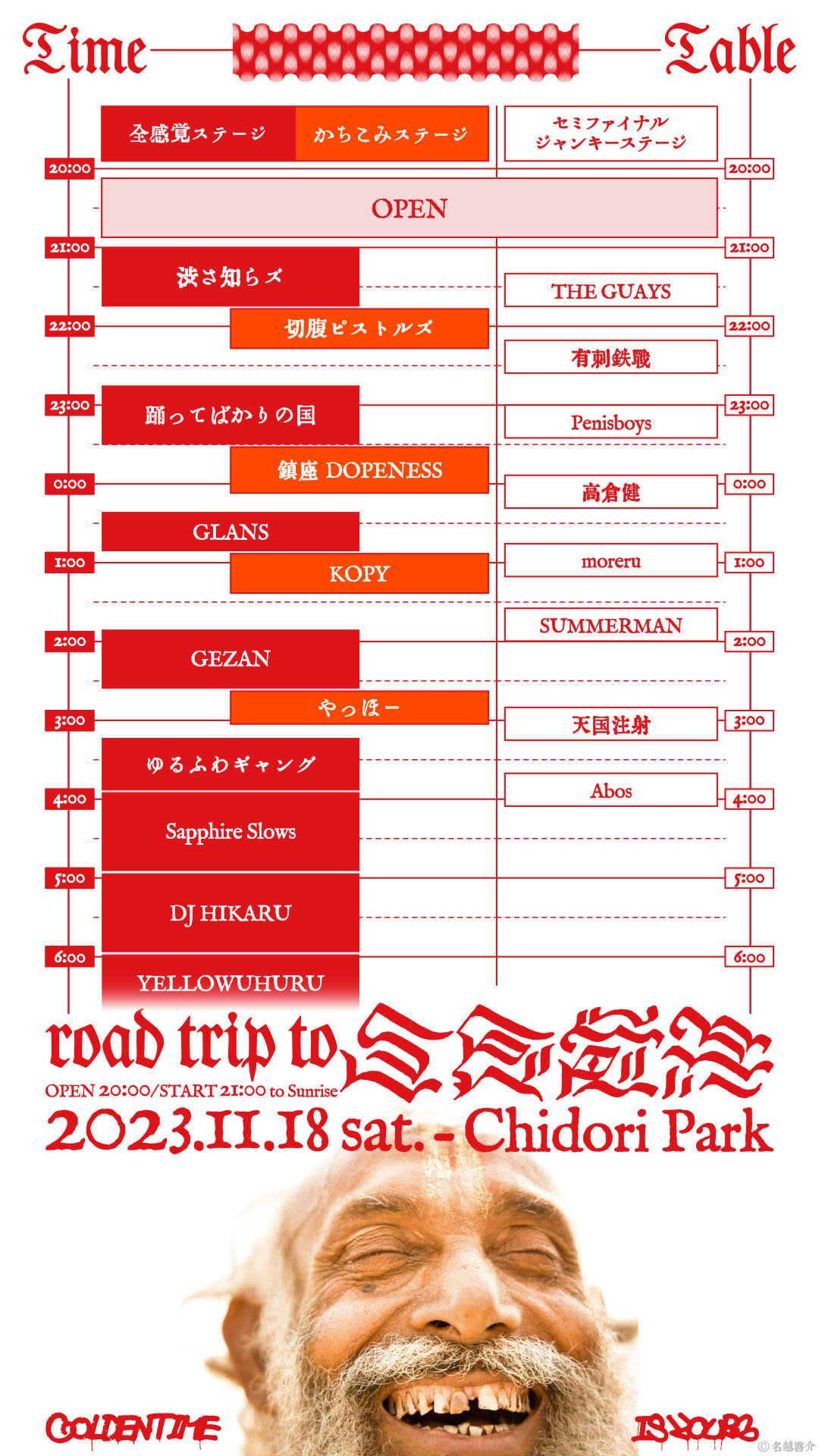 『全感覚祭』は十三月が “面白さの価値は自分で決めてほしい” というコンセプトで開催してきた野外フェス。2019年以来、コロナ禍を経て久々となる今回は『Road Trip To 全感覚祭』と題して、全感覚祭では初となる川崎・ちどり公園にて開催。「全感覚ステージ」、「かちこみステージ」、「セミファイナルジャンキーステージ」と銘打たれた3つのステージに、全感覚祭ならではの濃厚/強力なラインナップが明け方まで展開される。
