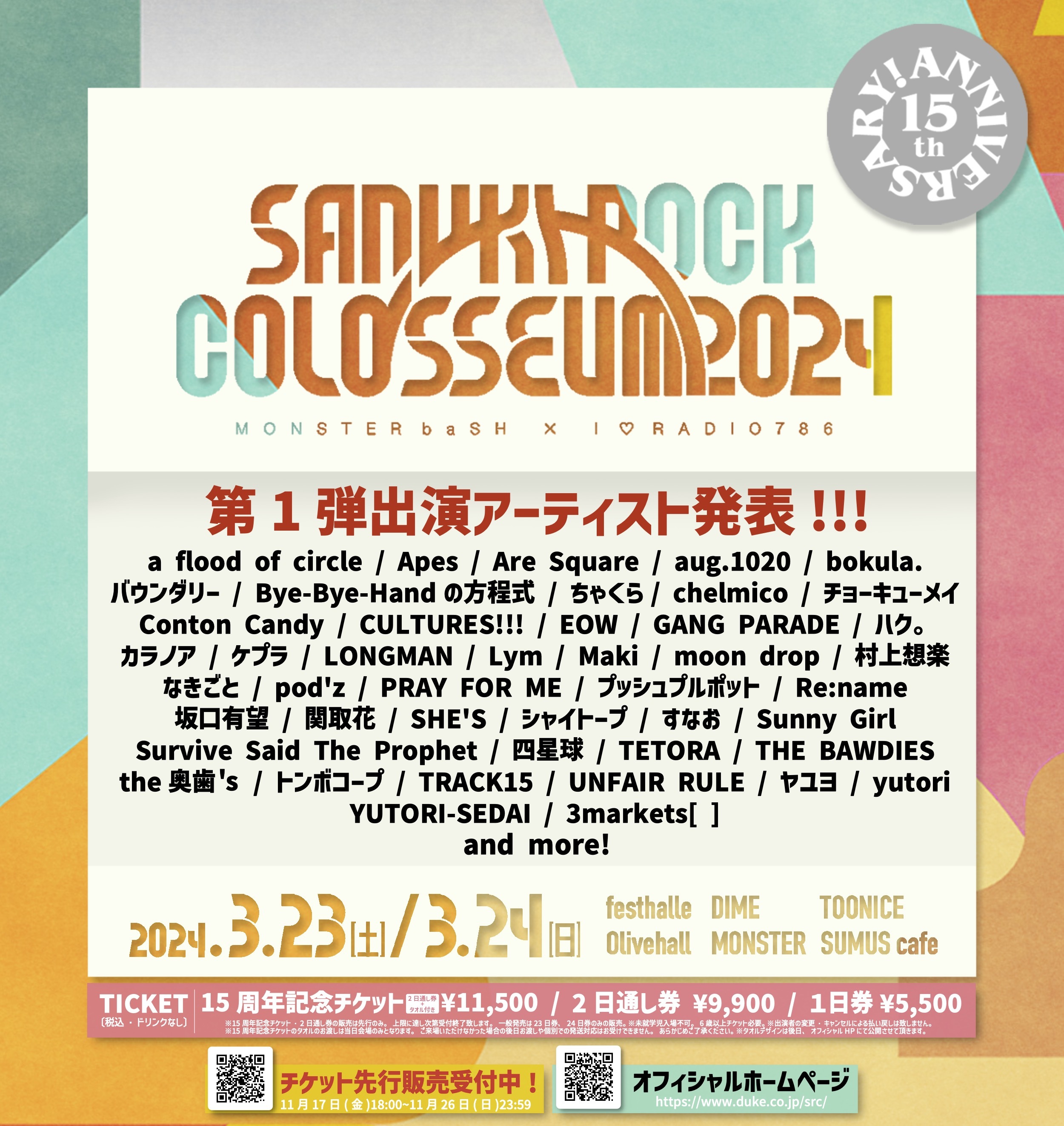 2024年3月23日(土)、24日(日)の2日間、香川・高松市内にて開催される街ごとライブサーキット『15th Anniversary SANUKI ROCK COLOSSEUM 2024 』の第1弾出演アーティストが発表された。