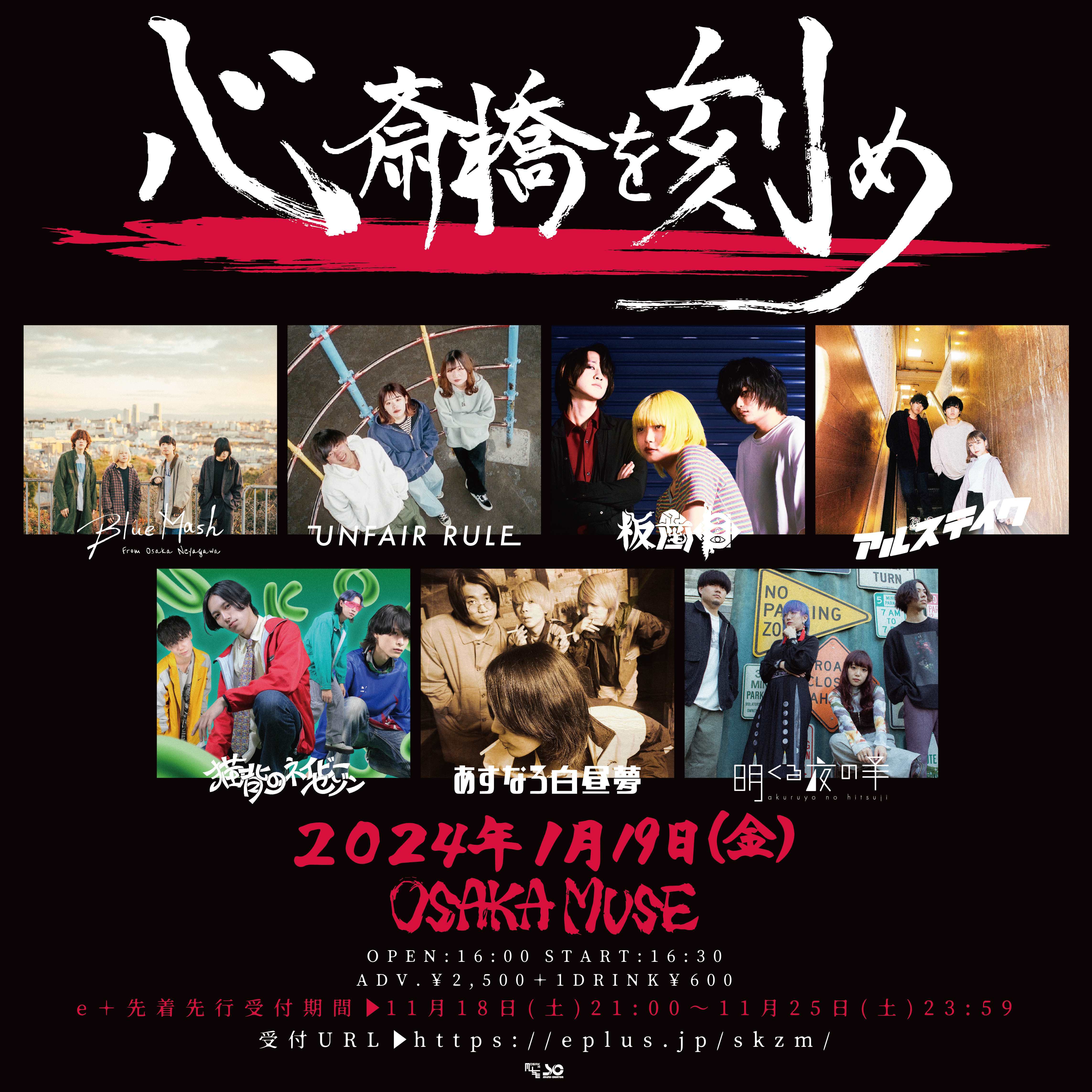 2024年1月19日(金)に、大阪のOSAKA MUSEにてライブイベント『心斎橋を刻め』が開催され、Blue Mashなど7組が出演することが決定した。