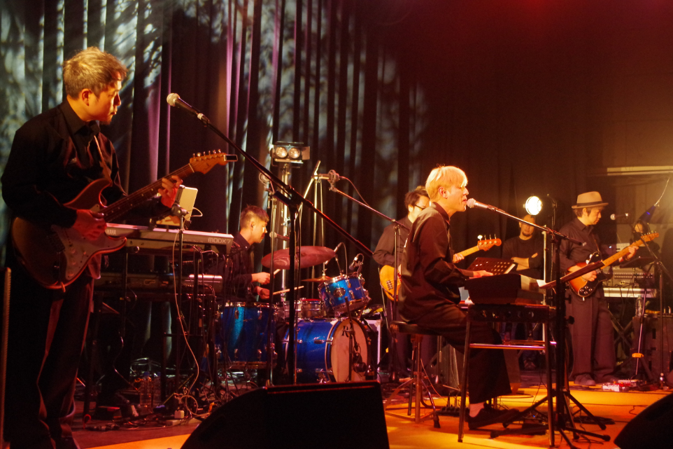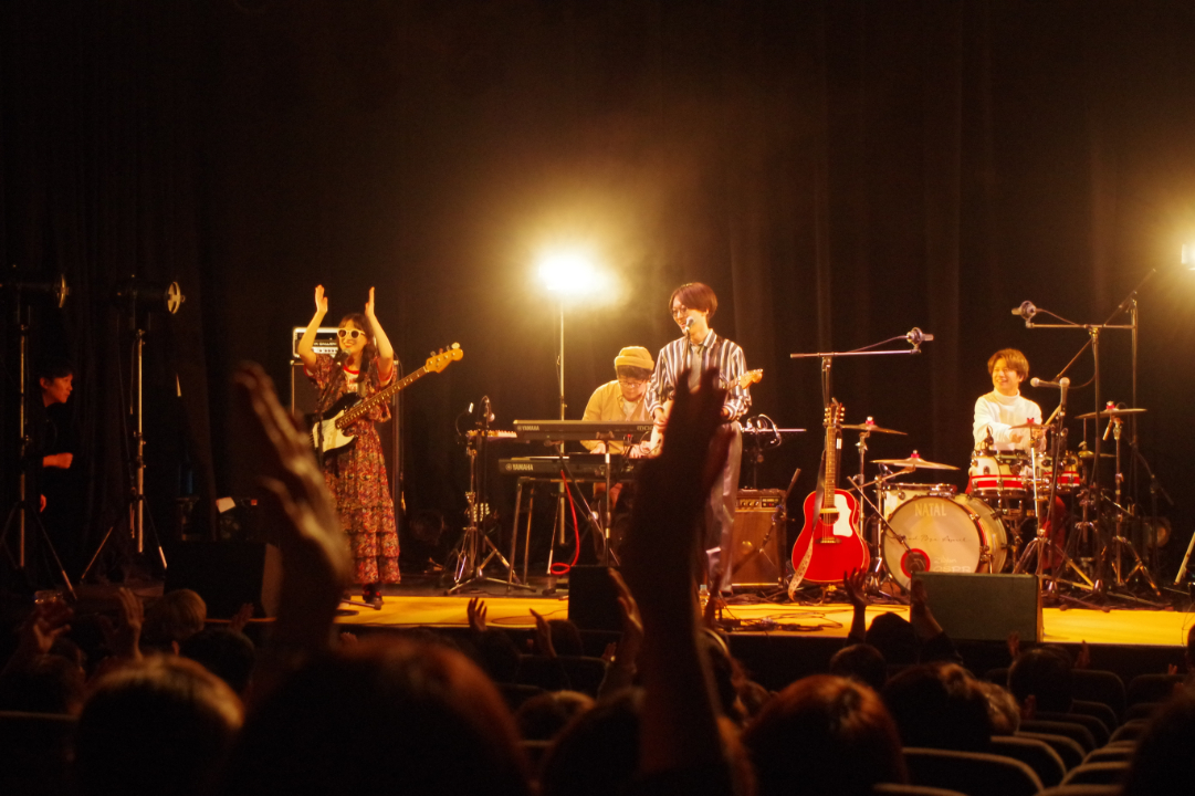 まず、キンモクセイがステージに登場し、「手の鳴る方へ」でライブがスタート。イントロと共に自然と手拍子が巻き起こり、伊藤俊吾(Vo&Key)の伸びやかな歌声がバンドのアンサンブルと共に心地よく会場を満たしていく。「二人のアカボシ」「車線変更25時」では、佐々木良(Gt&Cho)との圧倒的コーラスワーク、それを支える後藤秀人(Gt)と張替智広(Dr)のバンドアンサンブルで魅了し、25年のキャリアで培ったキンモクセイならではのハーモニーを響かせる。