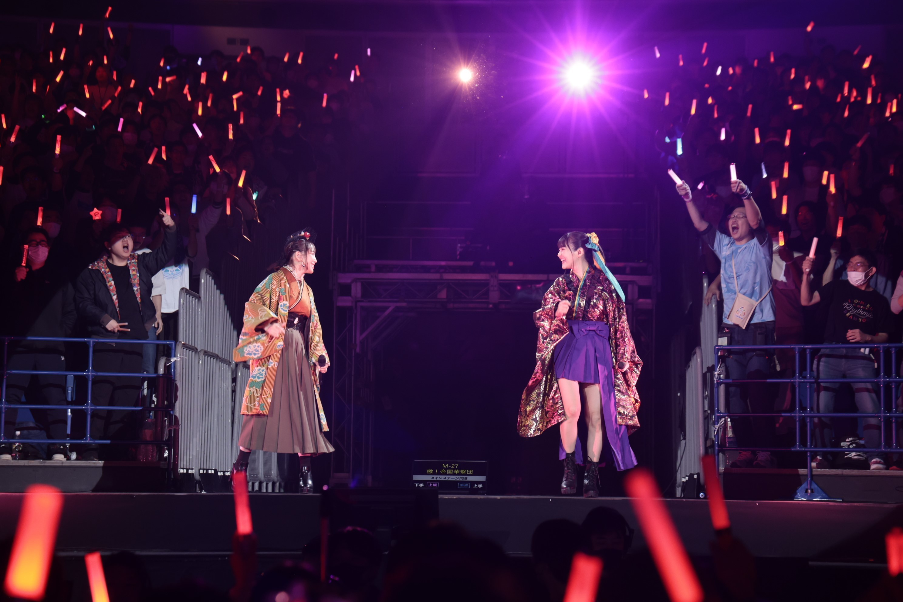 そしてこのコーナーの最後は、袴姿風の衣装をまとった上坂すみれ×南條愛乃が後方ステージに登場し、TVアニメ『サクラ大戦』OPテーマ「ゲキテイ(檄!帝国華撃団)」を披露。舞いのような仕草を交えた振り付けで声援に応え、おなじみの名乗りもしっかりと再現。ラストは二人で背中を合わせてのキメポーズに、場内からは大歓声が巻き起こった。