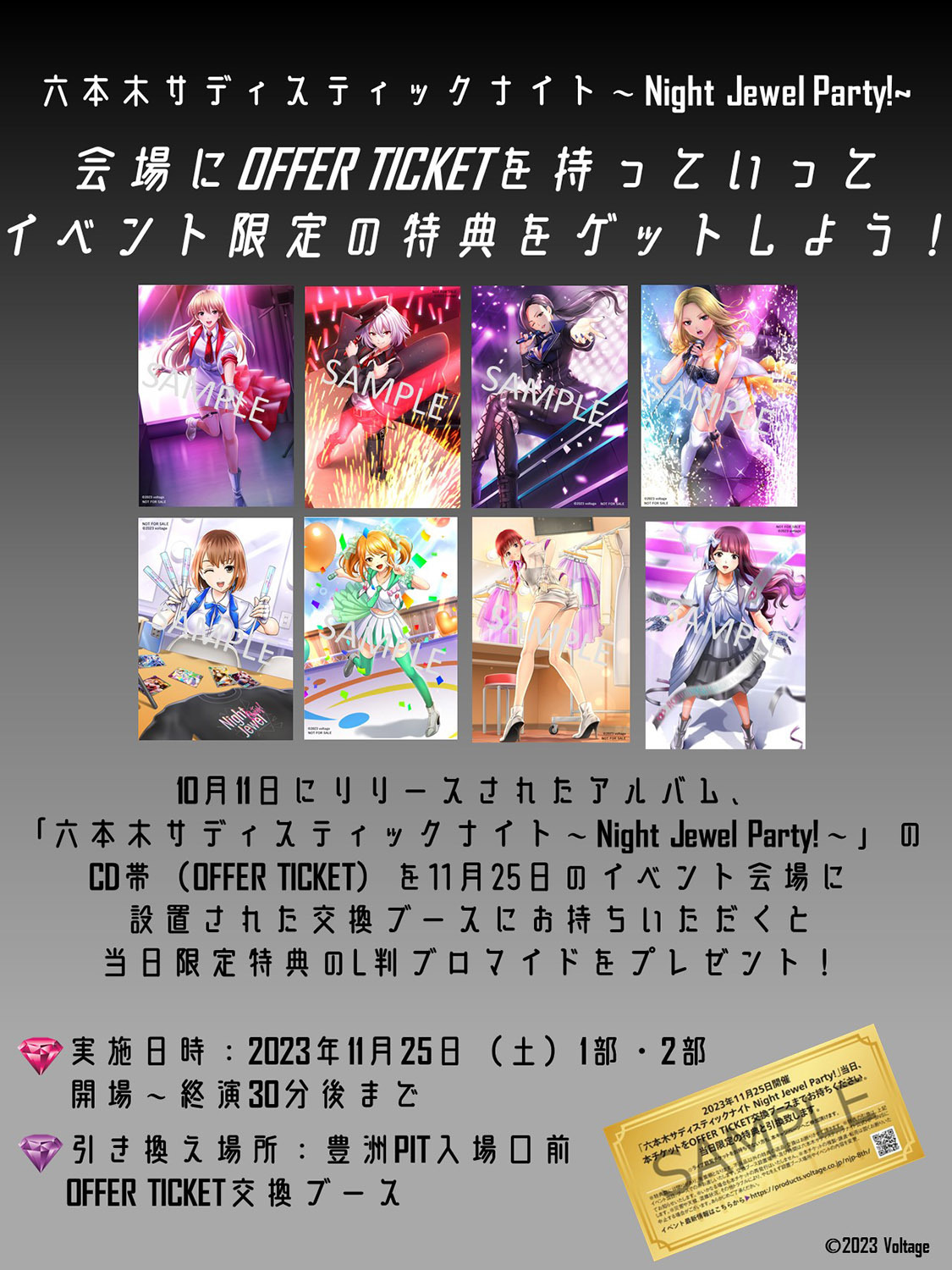 また10月11日に発売された1stアルバム『六本木サディスティックナイト~Night Jewel Party!~』との連動施策として、CDの帯の裏面に印字された(OFFER TICKET)を当日会場内の交換ブースに持参すると、もれなくイベント会場限定のブロマイドがプレゼントされる。ここでしかゲットできない特典になるのでぜひ手に入れておきたい。