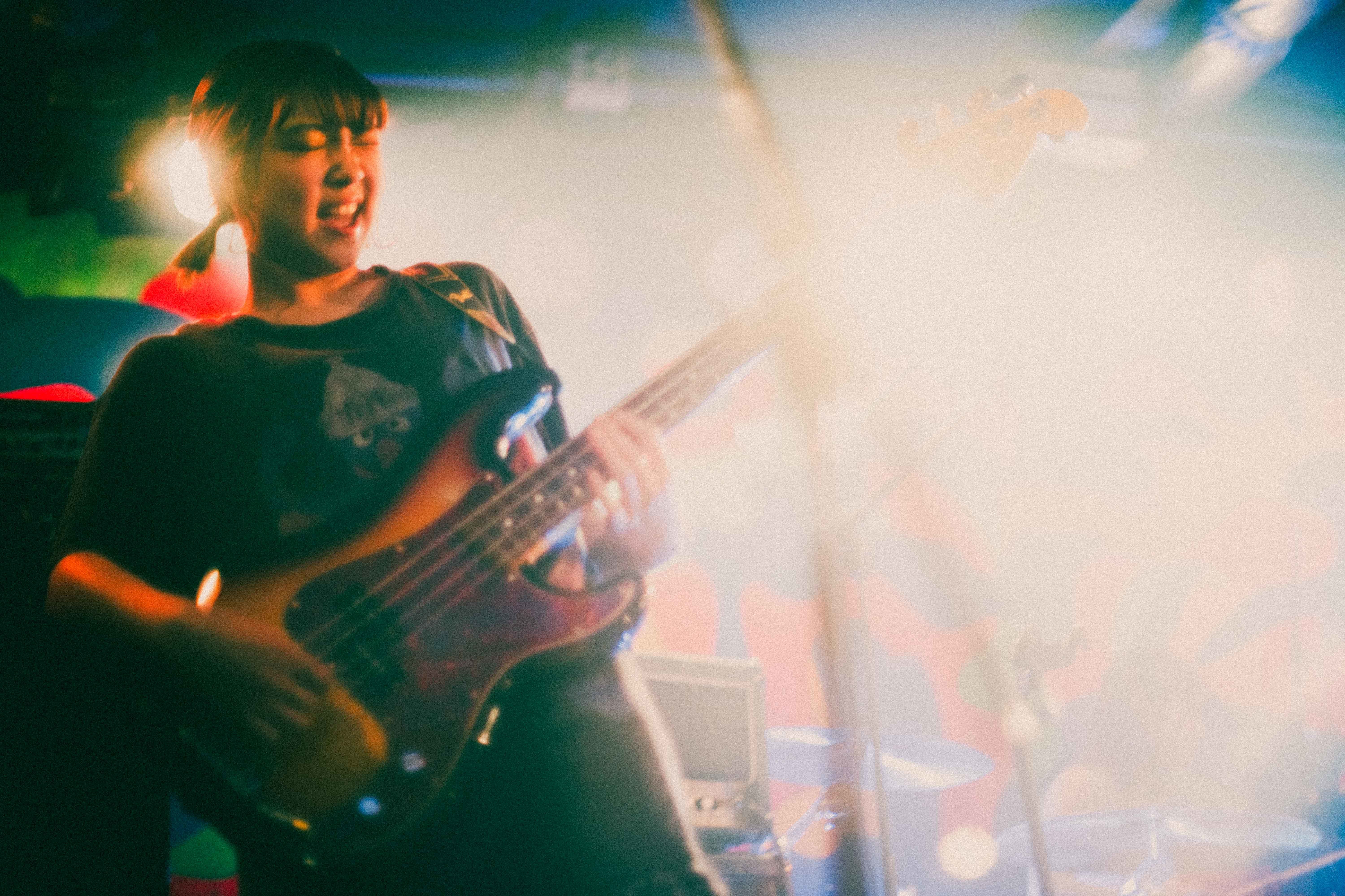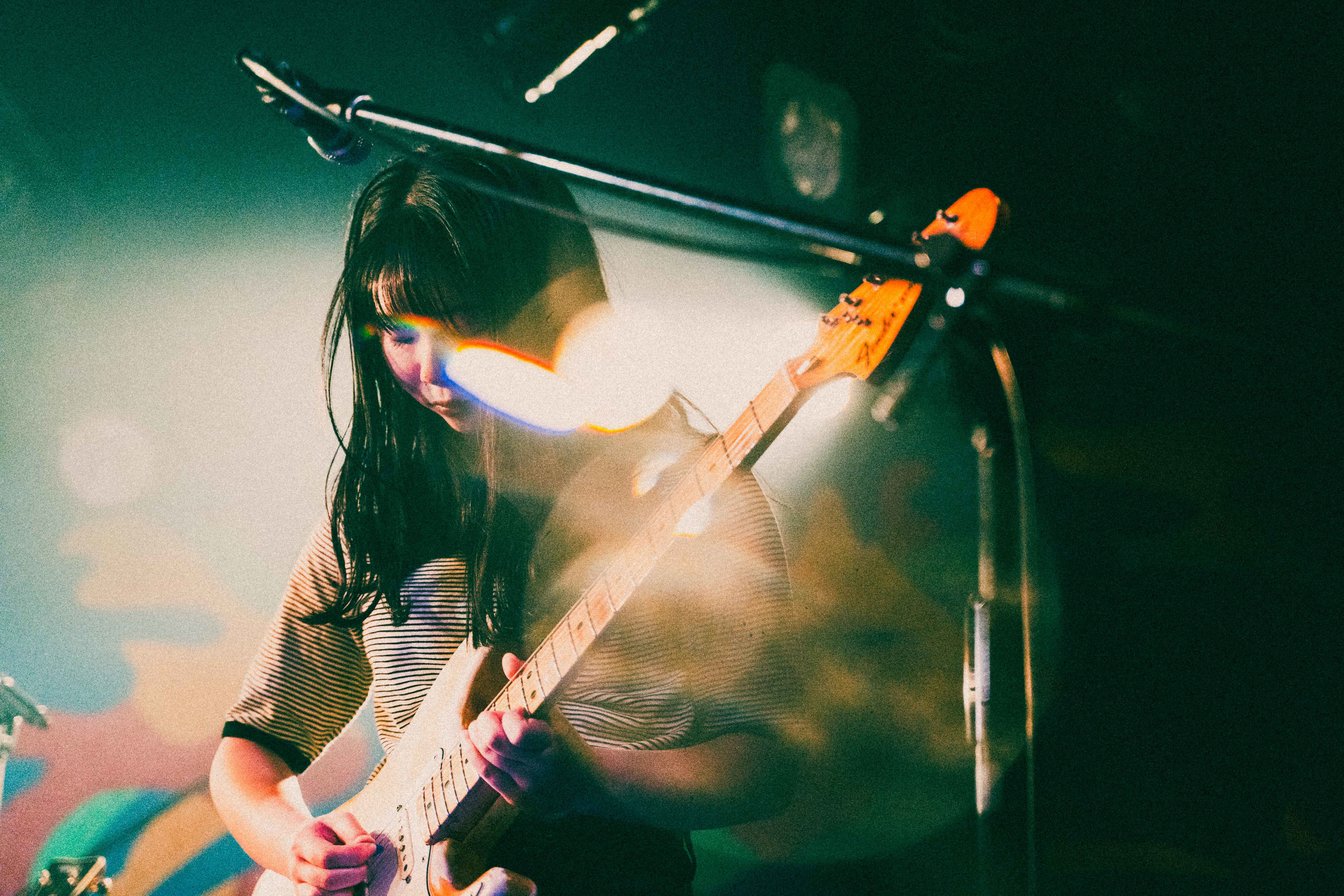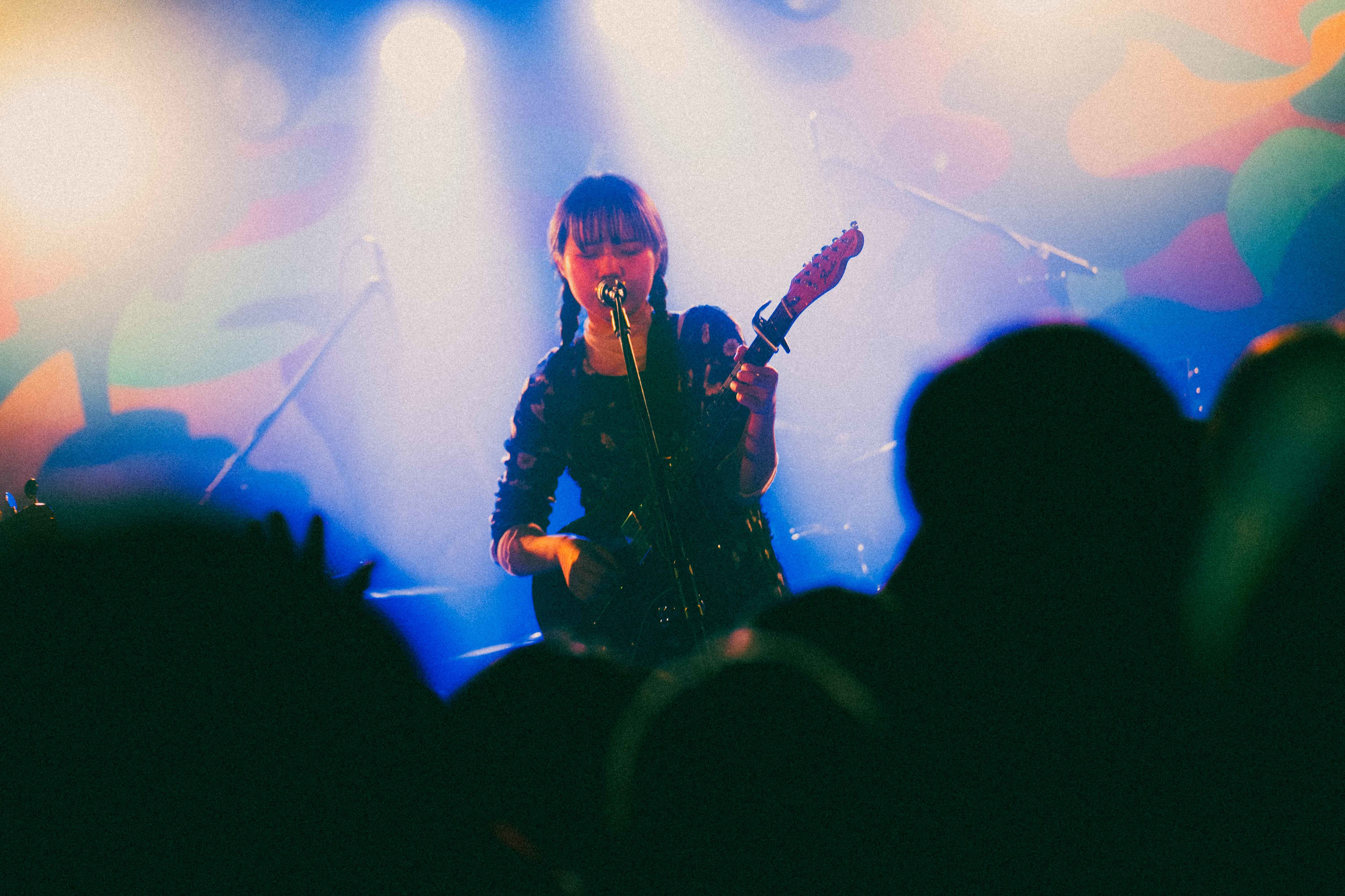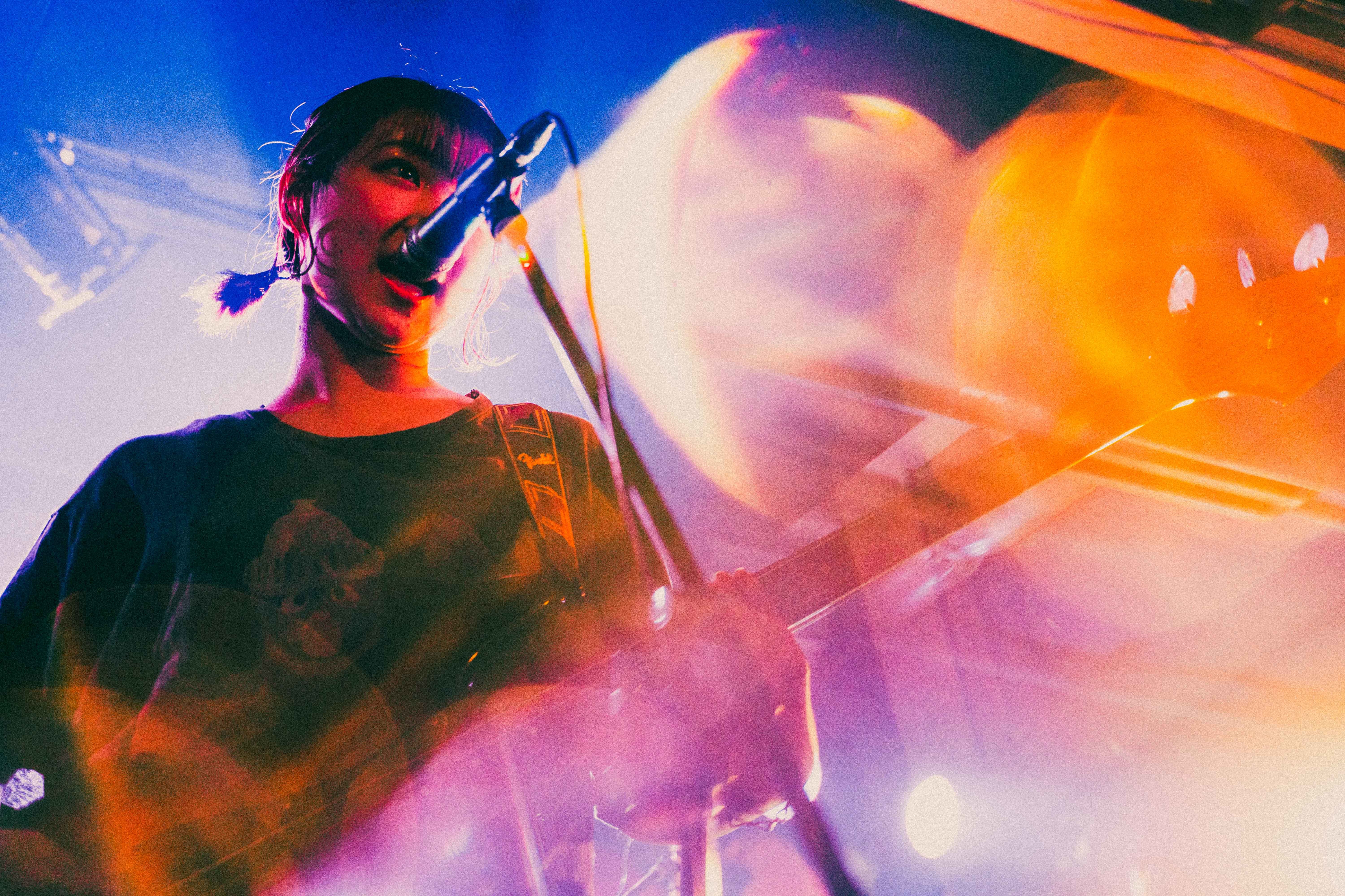 中盤を越えたあたりでの「なつ」は、今までと毛色が違うリズムで刺激あるスパイス的な役割を果たす。音源で聴いた時に感じた格好良さとはまた違うライブならではの生々しさがあり、90年代UKロック的なダイナミズムを感じた。しかし、ここでハプニングが起きる。ほんの瞬刻だが、あいが歌詞を飛ばす。が、何事も無かったかのようにラララというハミングで乗り切る。当の本人は焦ったに違いないが、この動じないショーマストゴーオン精神は、彼女の成長とタフさを感じることができた。