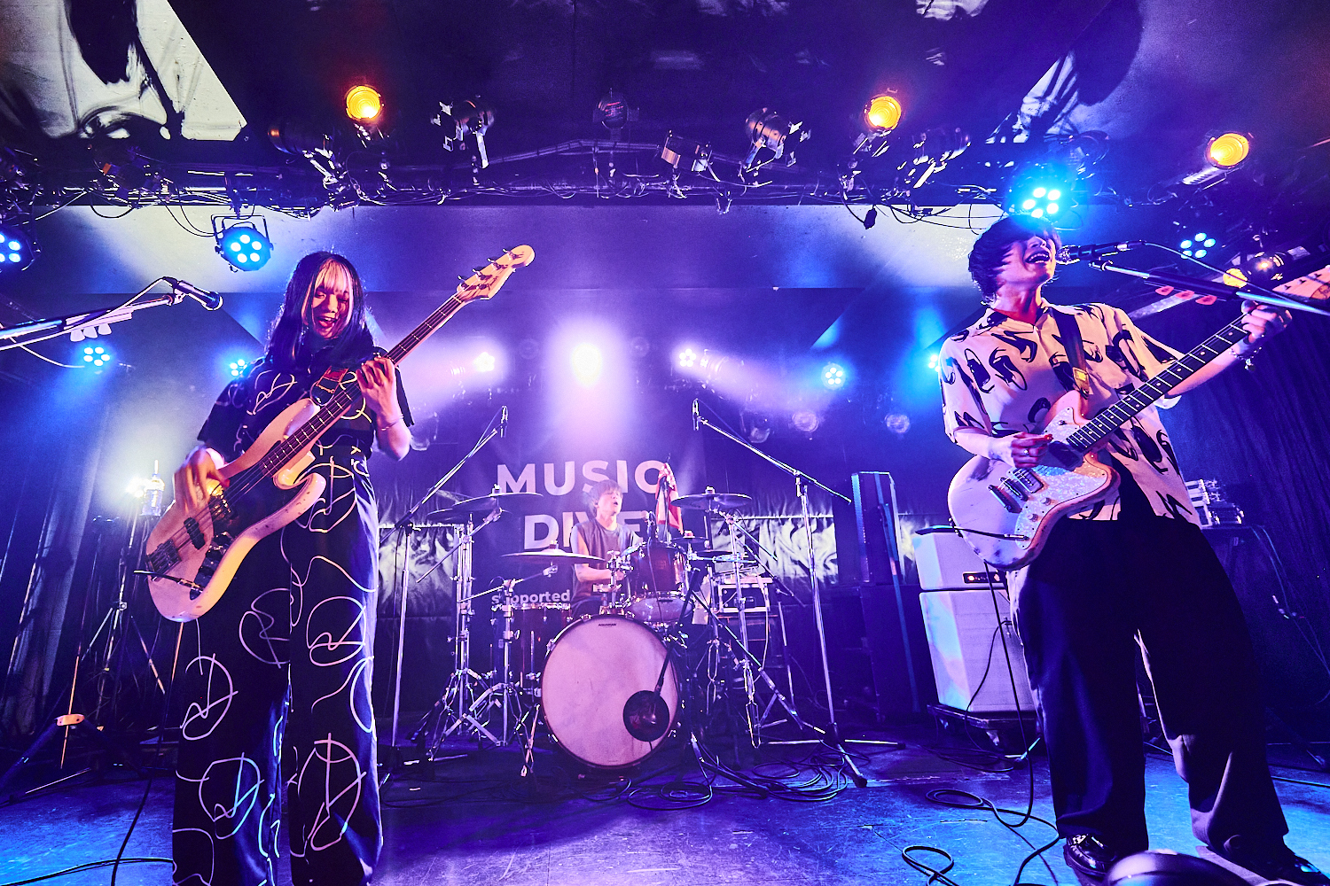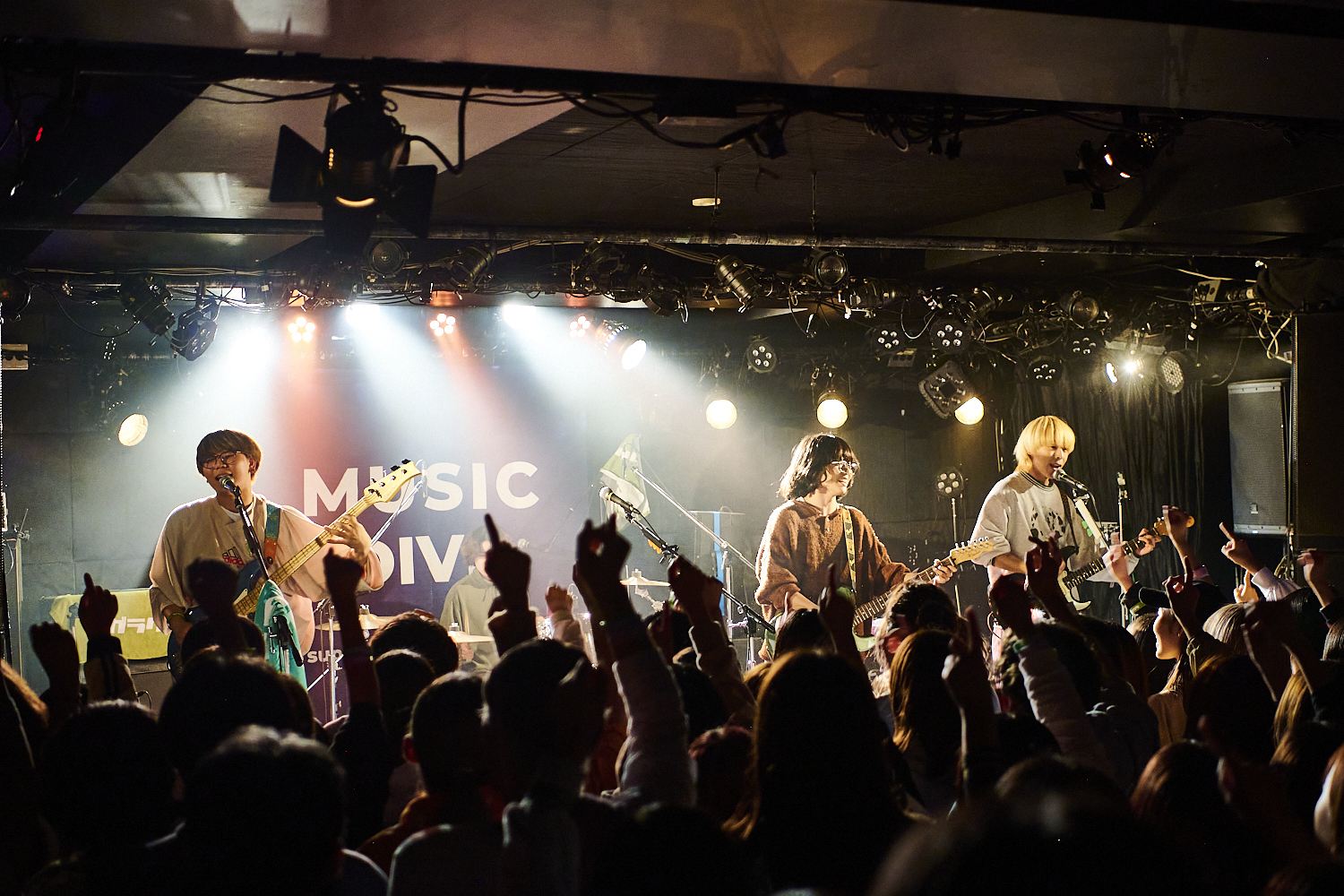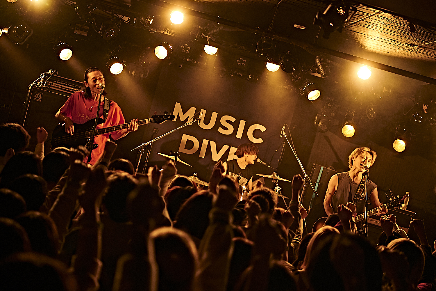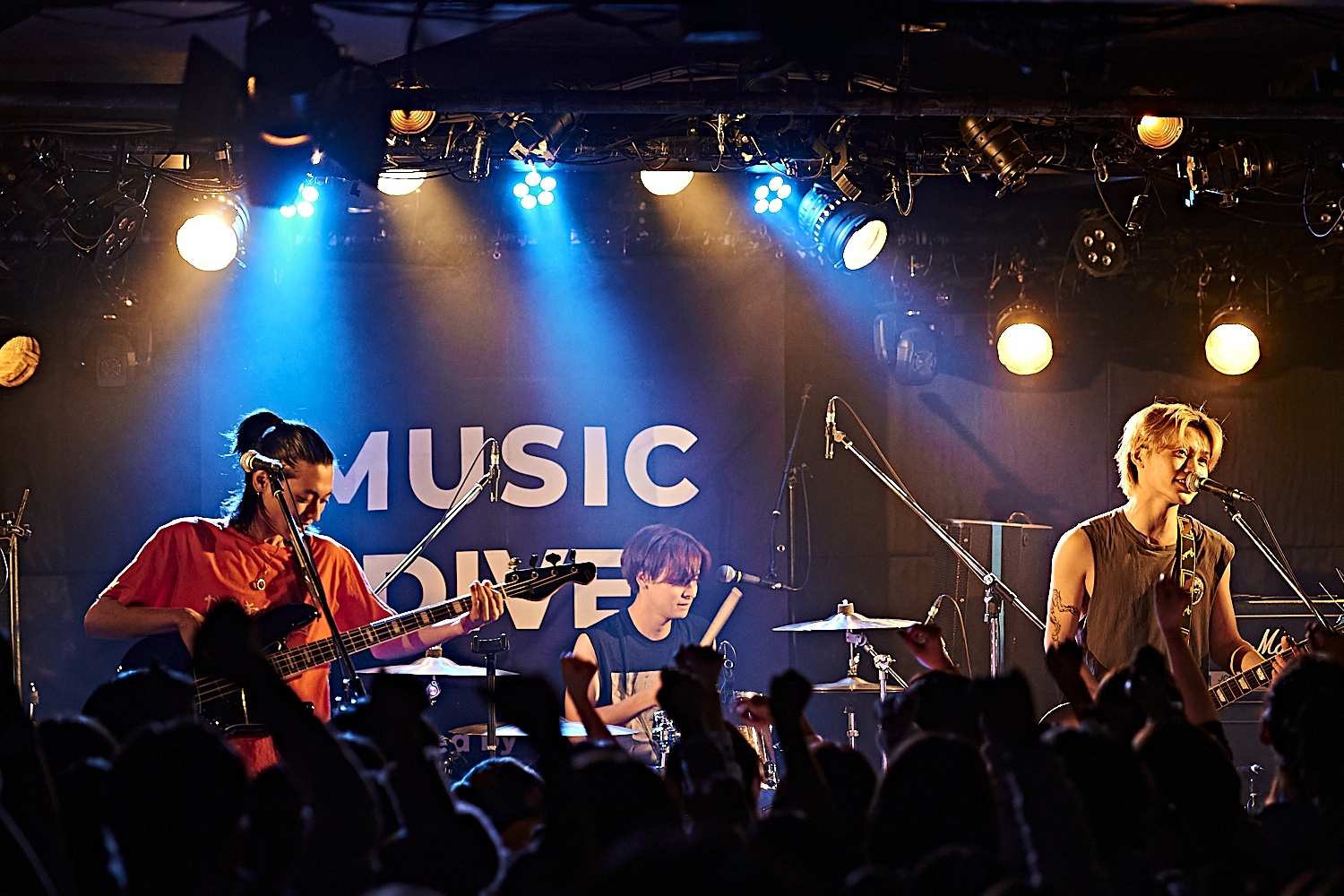 MCで「今夜、新曲をリリースします!」とホリウチが告げ、「人を愛することに臆病になった夜に、俺と同じようなヤツがいたら寄り添ってあげたいなと思って書きました」と始まったのは、新曲「さよなら恋人、おかえり恋心」。エモーショナルな歌声と悲痛なファルセットが胸を締めつけるバラードソングで観客を魅了すると、ラストは代表曲と言える「カシスオレンジ」で、彼らの音楽の奥深くまで観客をダイヴさせると、「最後までありがとうございました! 『MUSIC DIVE』、あなたと音楽ができてよかったです。またライブハウスで会いましょう」と言って3人が深く頭を下げて、ライブは終演。“バンドとリスナー、バンドとバンド、そしてリスナーとリスナーを繋ぎ、「MUSIC」に「DIVE」する”という『MUSIC DIVE』のコンセプトに相応しいラストとなった。