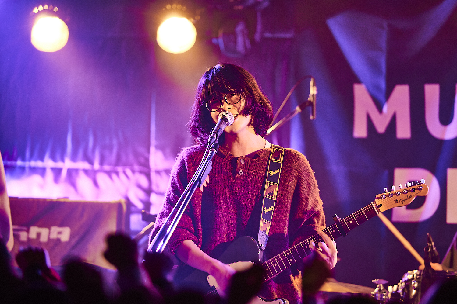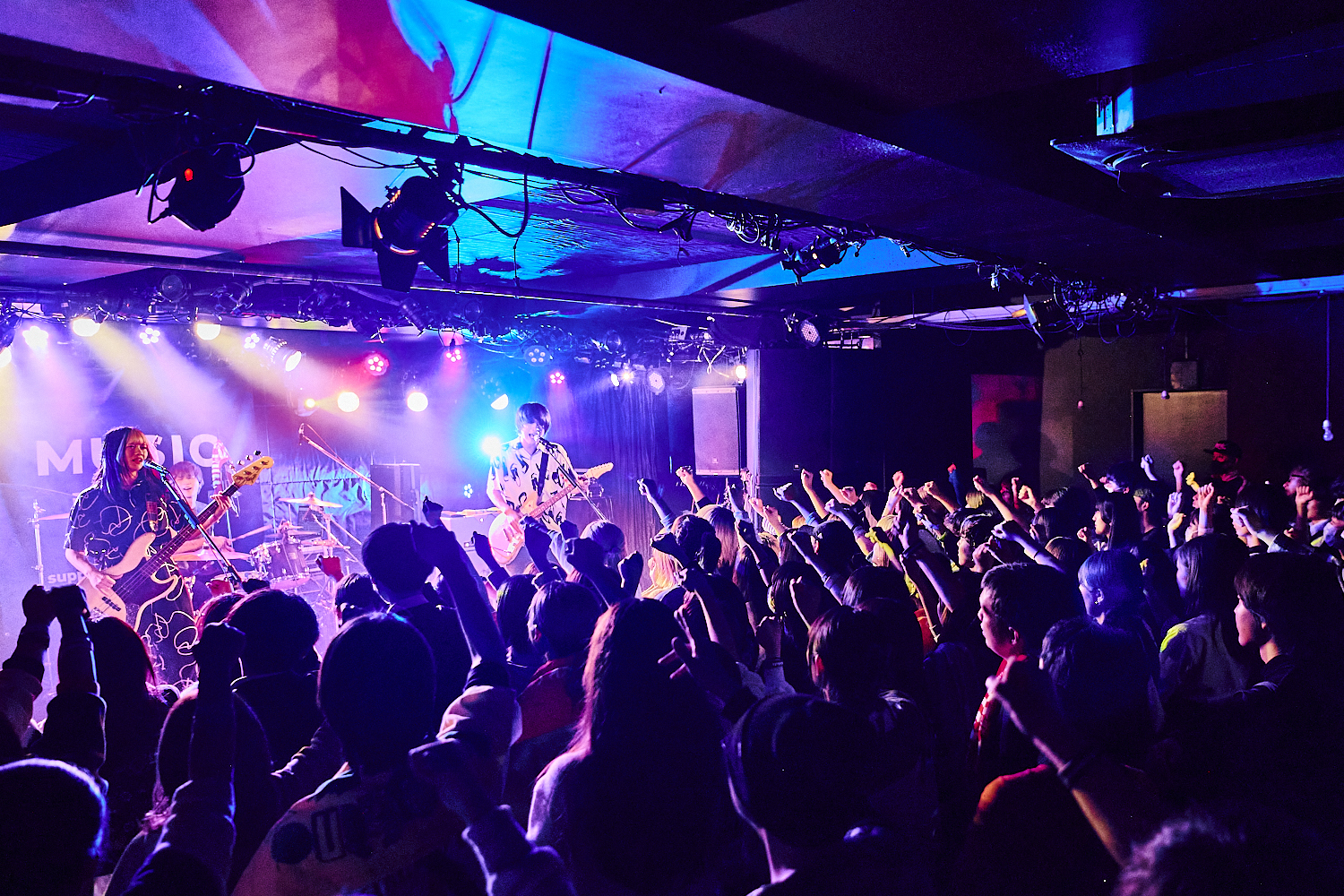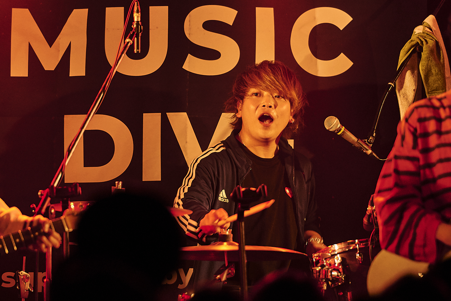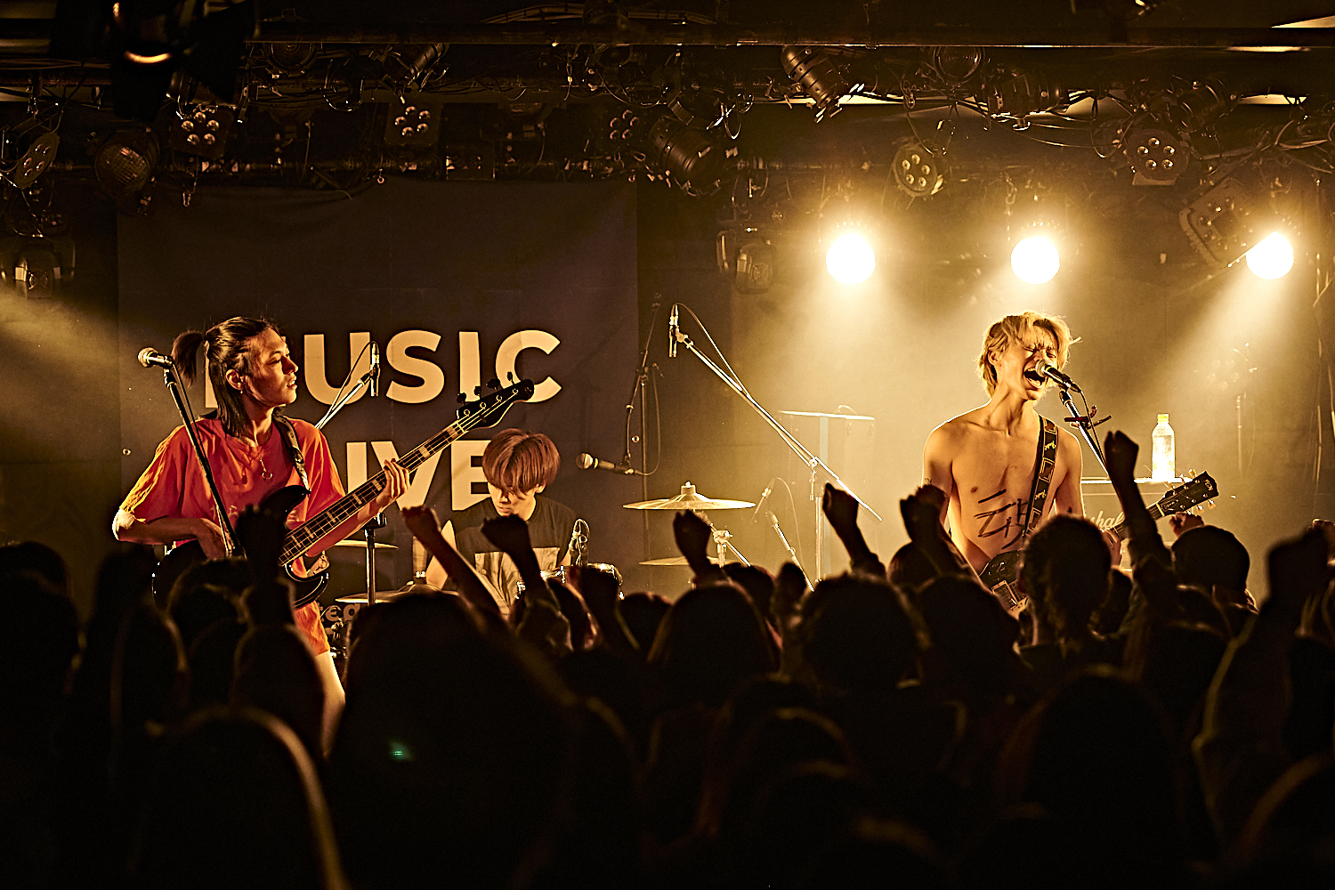この日のトッパーを務めたのは、からあげ弁当。「『MUSIC DIVE』東京編、ブチアゲて帰るだけ! ストレート・ロックンロール!! 俺たちがからあげ弁当だ!!!」と焼きそば(Vo,Gt)が叫び、気合い十分に始まった「チキン野郎」で勢いよくライブの幕を開ける。こーたろー(Dr)のパワフルに突き上げるビート、バンドサウンドを重低音でどっしり支える春貴(Ba)のベース、そしてアグレッシブな歌とギターでバンドをリードする焼きそば。間髪入れずに新曲「バカ野郎」へ続き、三位一体となった音塊とエネルギーをぶっ放すと、フロアがどんどん熱を帯びていく。