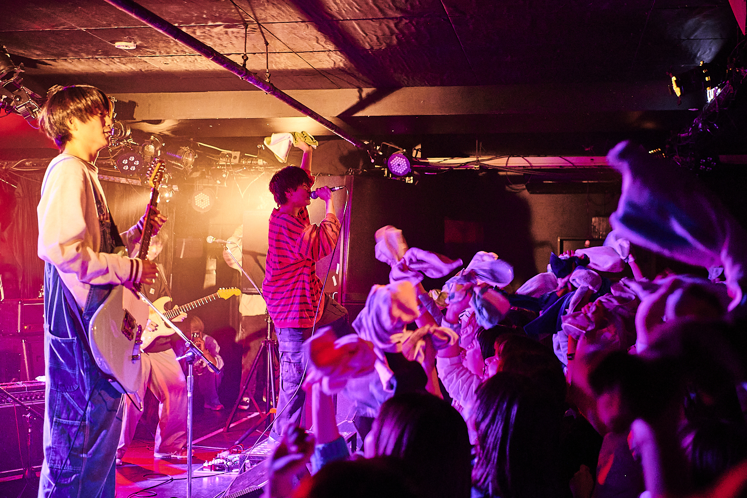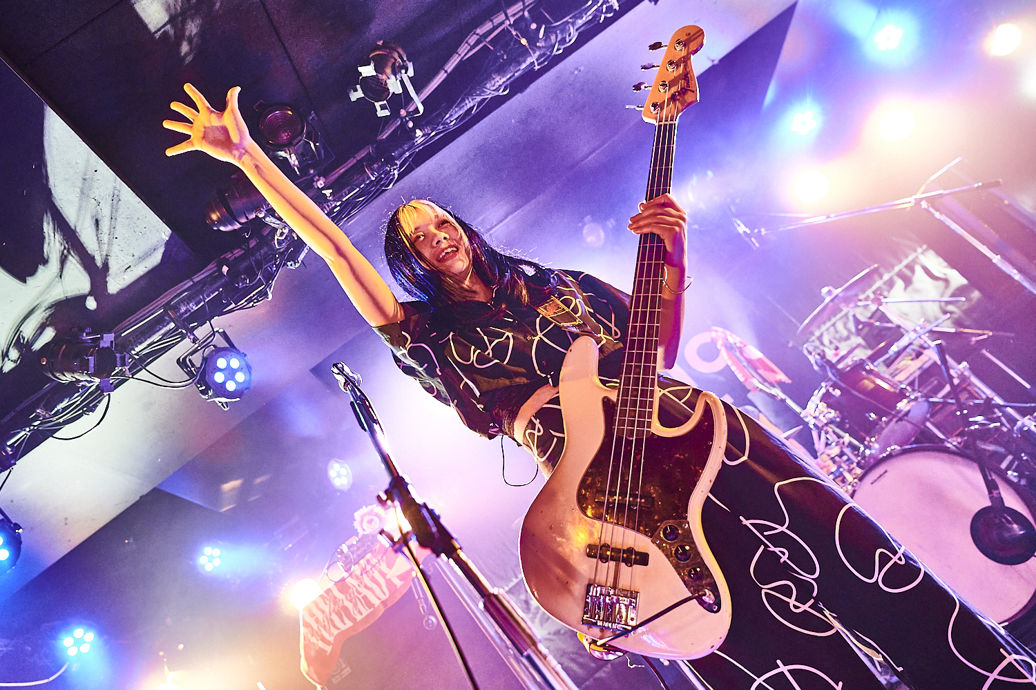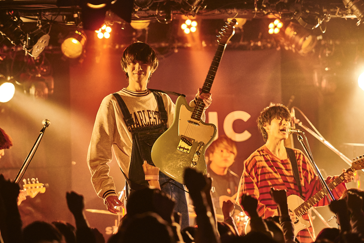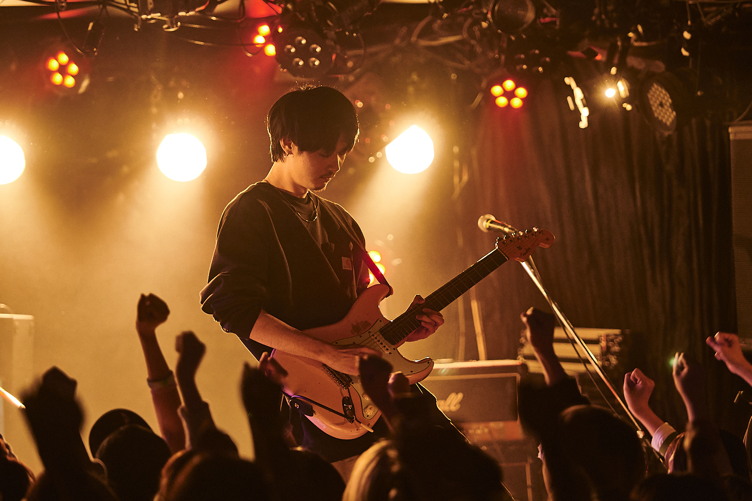 さらに『MUSIC DIVE』大阪編で音が出なくなったトラブルについて話すと、「焦ったんですけど、生のライブってええな、バンドってええなと思って。本当に思ってしまって。これからもそんな空間を大事にしていくんで、お互いに大事にしていきましょう」と告げ、「乾杯をしよう」へ。観客の手拍子に生のライブの良さを噛みしめるように歌ったこの曲から、「先週の借りを返します!」と始まった「美々」で熱のこもった歌と演奏を聴かせると、ライブはクライマックスへ。