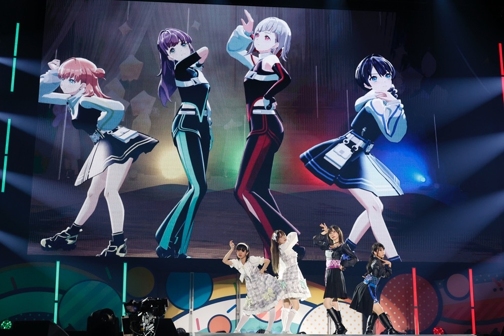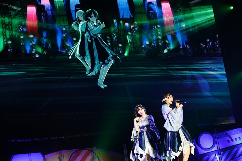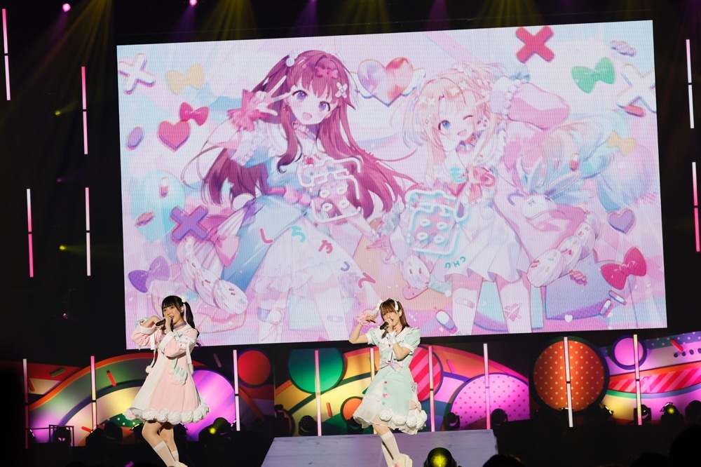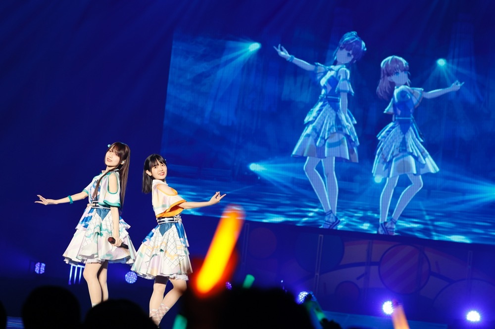 ここで一度、幕間映像で転換を挟み、6人が夏らしいデニムのホットパンツの衣装に着替えて「夏めきペイン」、スリーズブーケの2人で「素顔のピクセル」を披露。この流れで聴くと「素顔のピクセル」もサマーチューンのような、爽快感と清涼感があって、これは発見かもしれない。遅れを取り戻すように、みらくらぱーく!は「アイデンティティ」「ココン東西」を披露。「ココン東西」ではトロッコに飛び乗り、まさに東奔西走。2人の声質の相性もそうだけど、2人の性格と楽曲自体のライブとの相性も抜群で、どの曲も楽しいからみらくらが出てくるだけで盛り上がるし嬉しい。