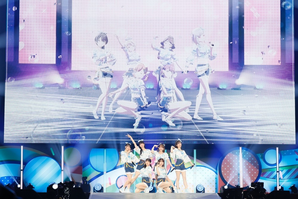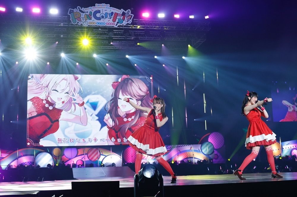 夏制服にまたお着替えしたスリーズブーケが再び登場。「謳歌爛漫」は和モノっぽいサウンドで、”謳歌”と”桜花”をかけて桜の花びらが舞い散るキャラのライブ映像を背負って、同じ振り付けをステージで踊っている。キャラとリアルのリンク。これこそがラブライブの良さであることを再実感させられた。「Holiday∞Holiday」の2Aでは手を繋ぎ、大歓声の中を花道を駆けてセンターステージへ。サウンドとしてのメロディアスさとキャッチーさの中にスリーズブーケの魅力が詰め込まれている曲だ。