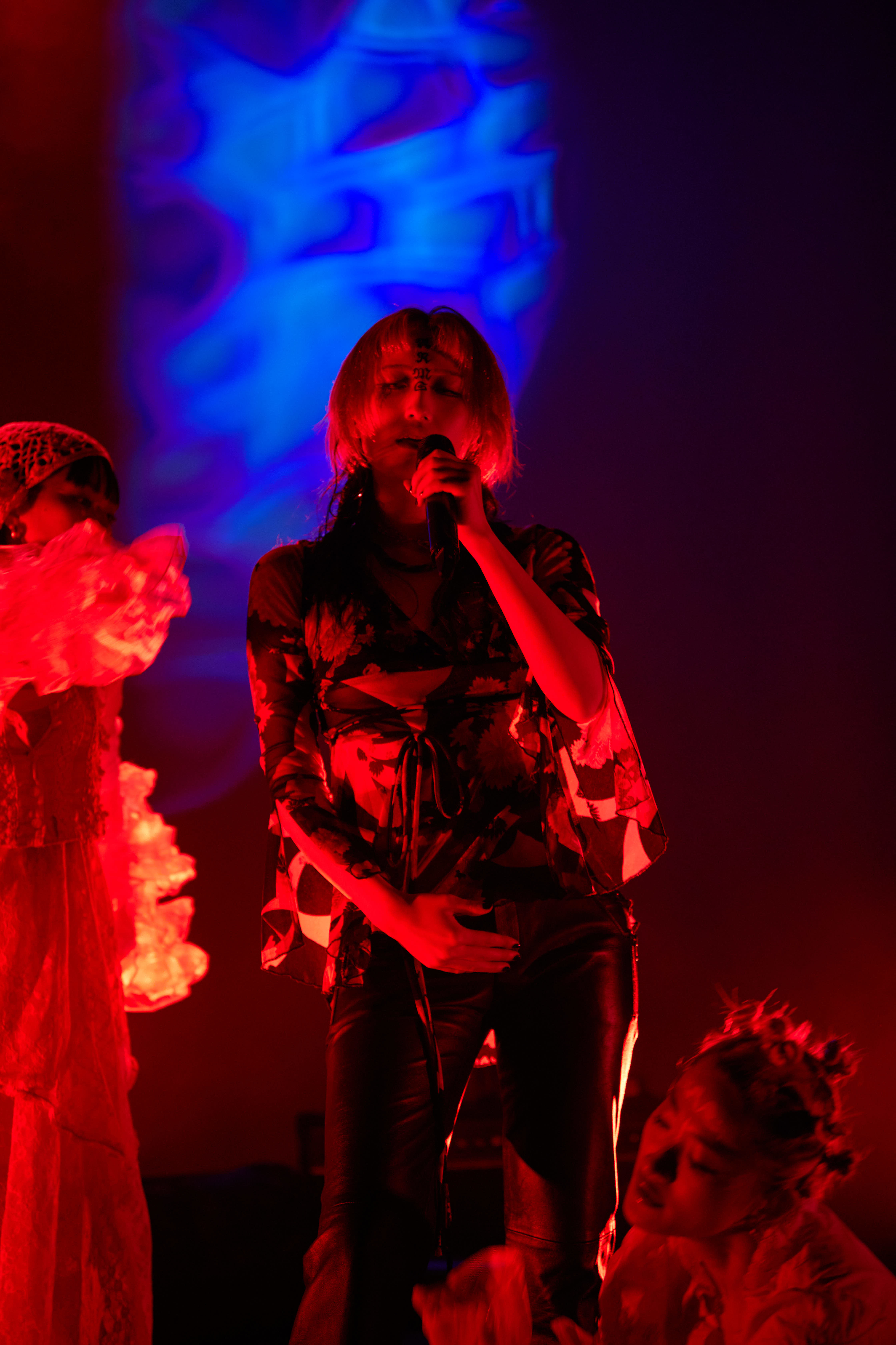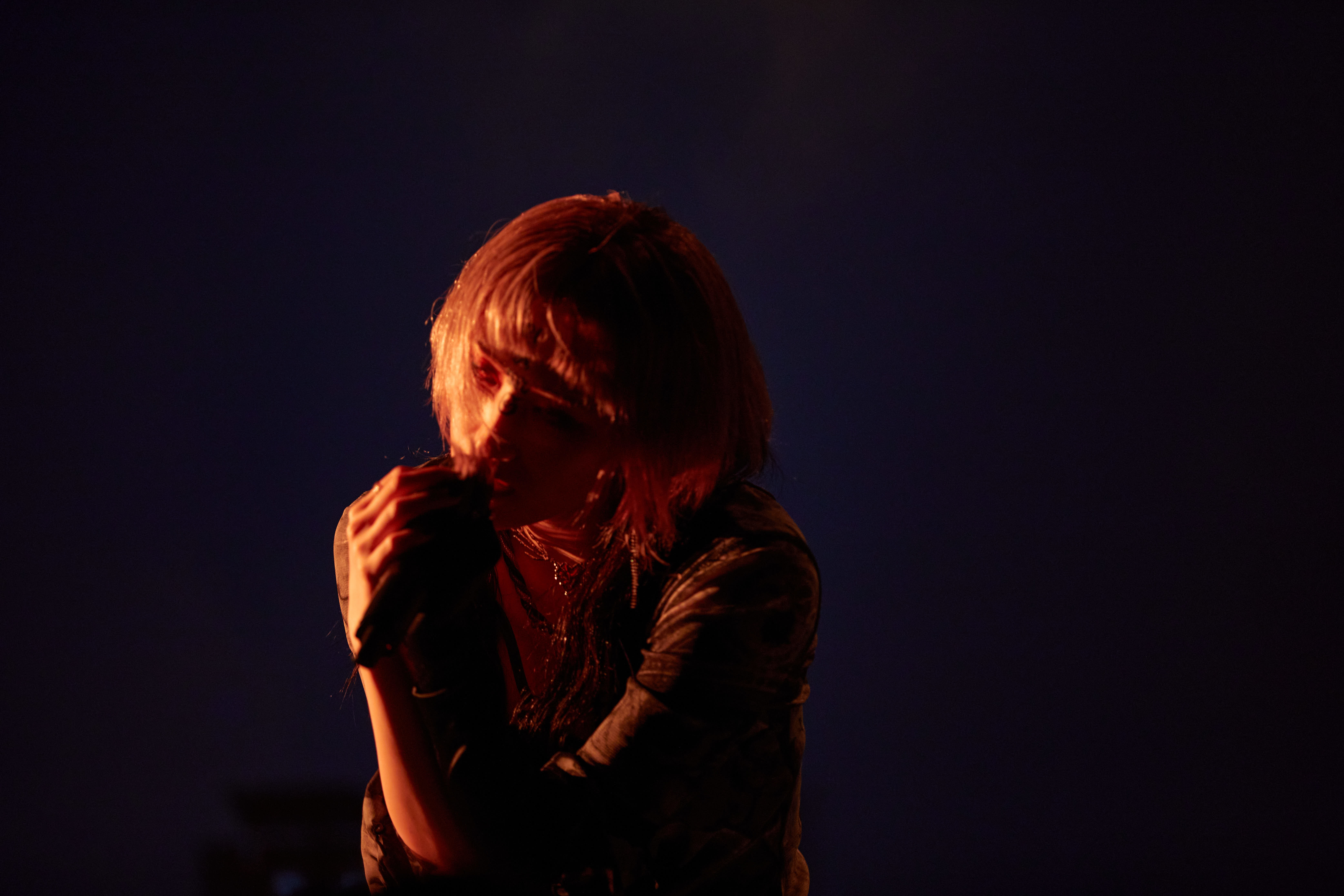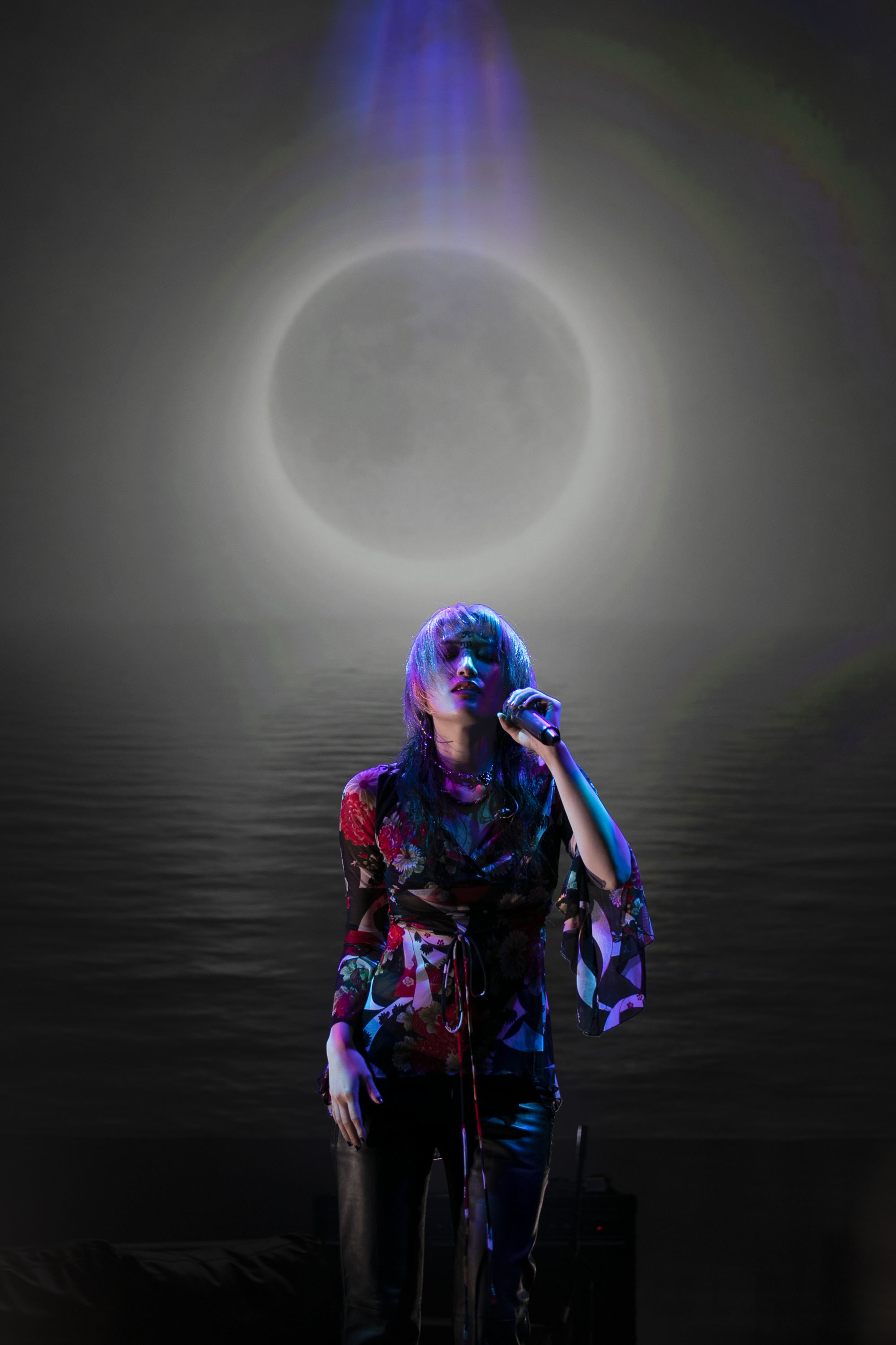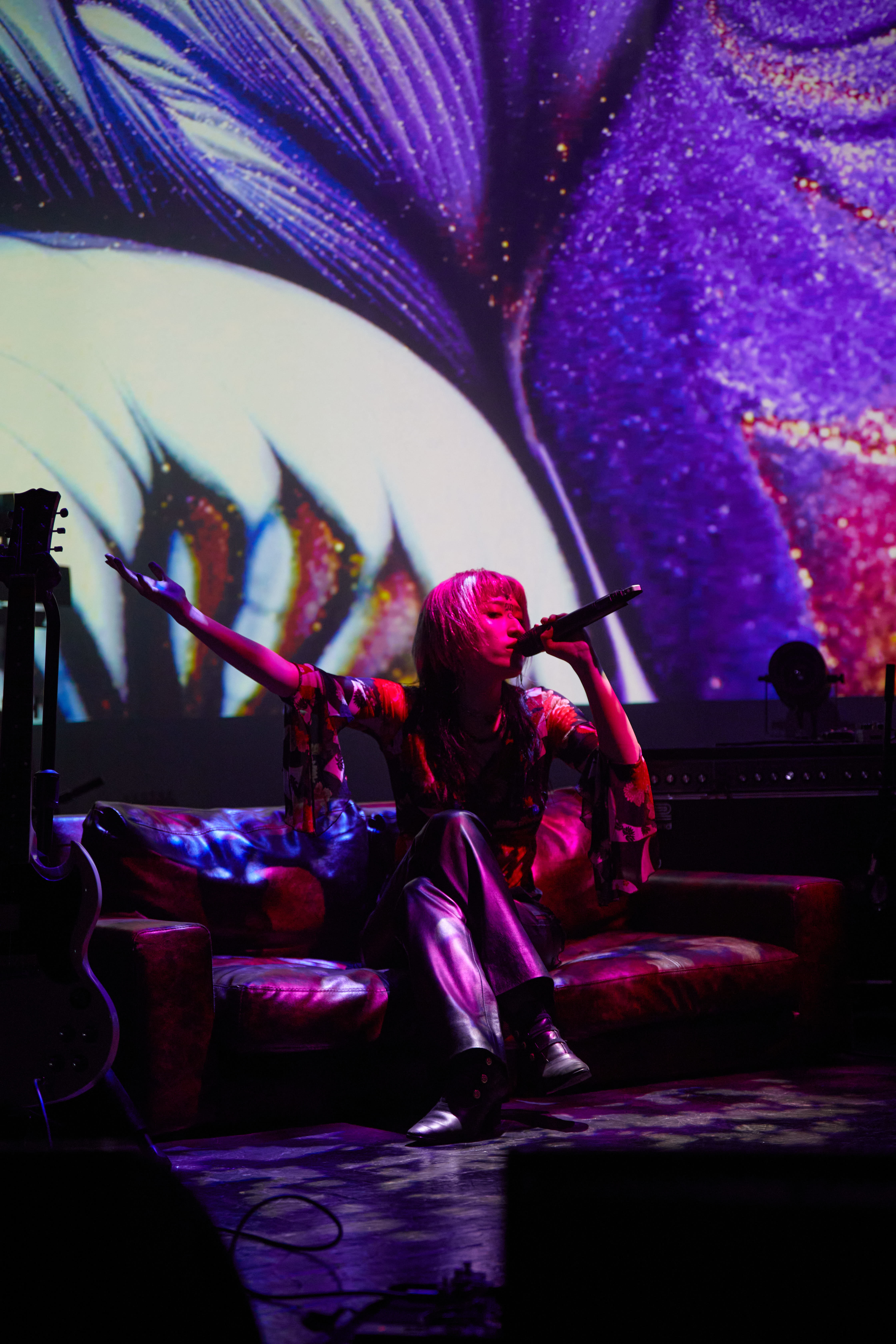 この日最初のMCの内容は重いものだが、隣の席の人に話しかけるような柔らかな口調には、暗さだけではない優しさが見える。ここから始まる後半は、アブストラクトヒップホップ風の「He.」「incubus」から、徐々にテンションを上げて自らエレクトリックギターを弾くグラマラスなロックンロール「Choose for yourself」へ。グラムロックやパンクバンドのボーカルでも行けるだろう、彼女のボーカルの多彩な表現力には驚かされっぱなしだ。さらに「みんな、踊っていくよ!」と叫び、明るい四つ打ちのダンスチューン「PaBodance」で客席を挑発しながら盛り上げる、肝の据わったアクトレスぶりがかっこいい。そしてラストは「selfish REMIX」の幽玄なサウンドと祈りのようなハイトーンボイス、ビジョンに映る美しい月の映像が、温かく肯定的なムードで会場を包み込む。まるで一本の映画を見終えたような、深い余韻があとに残る。