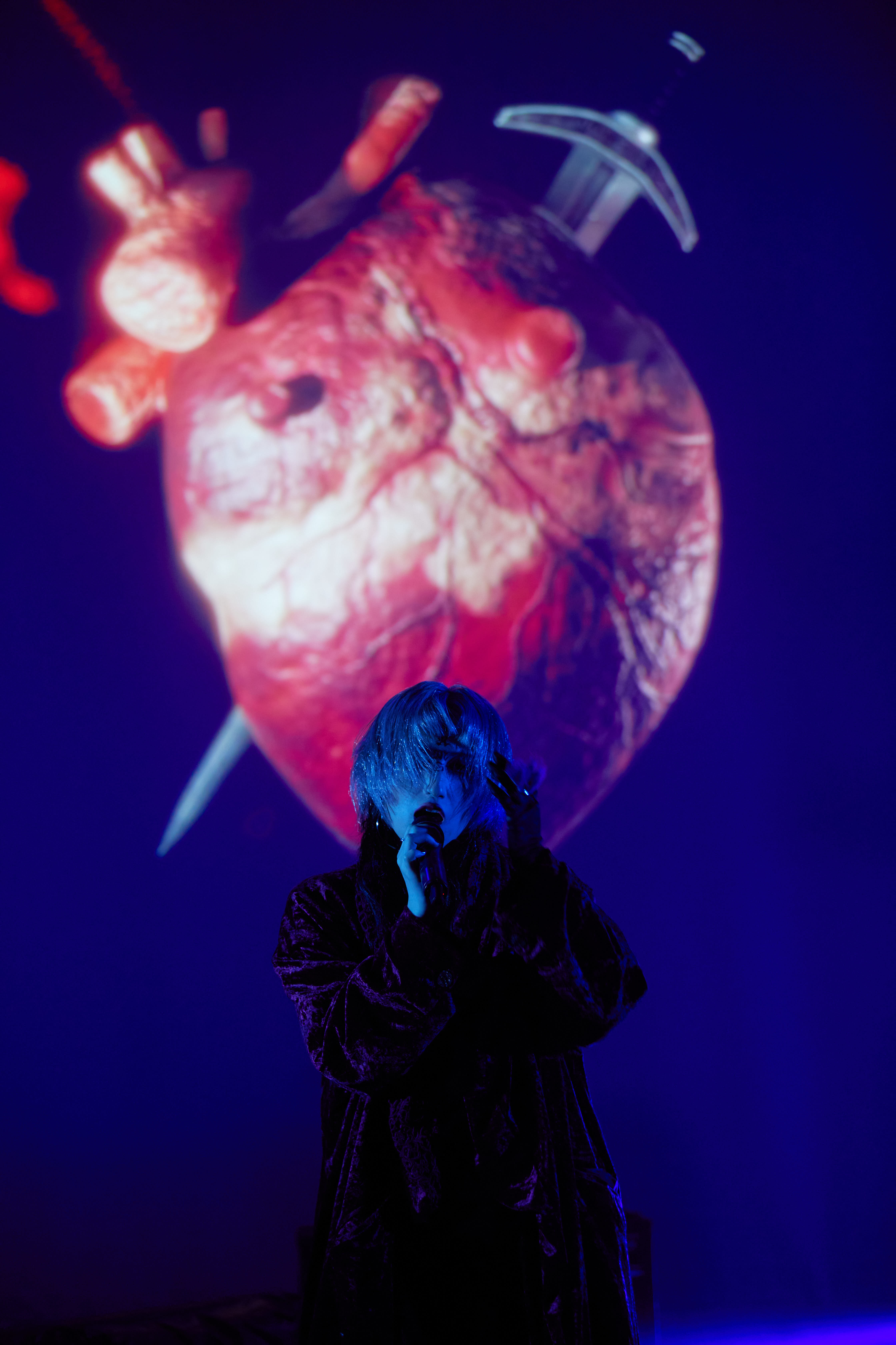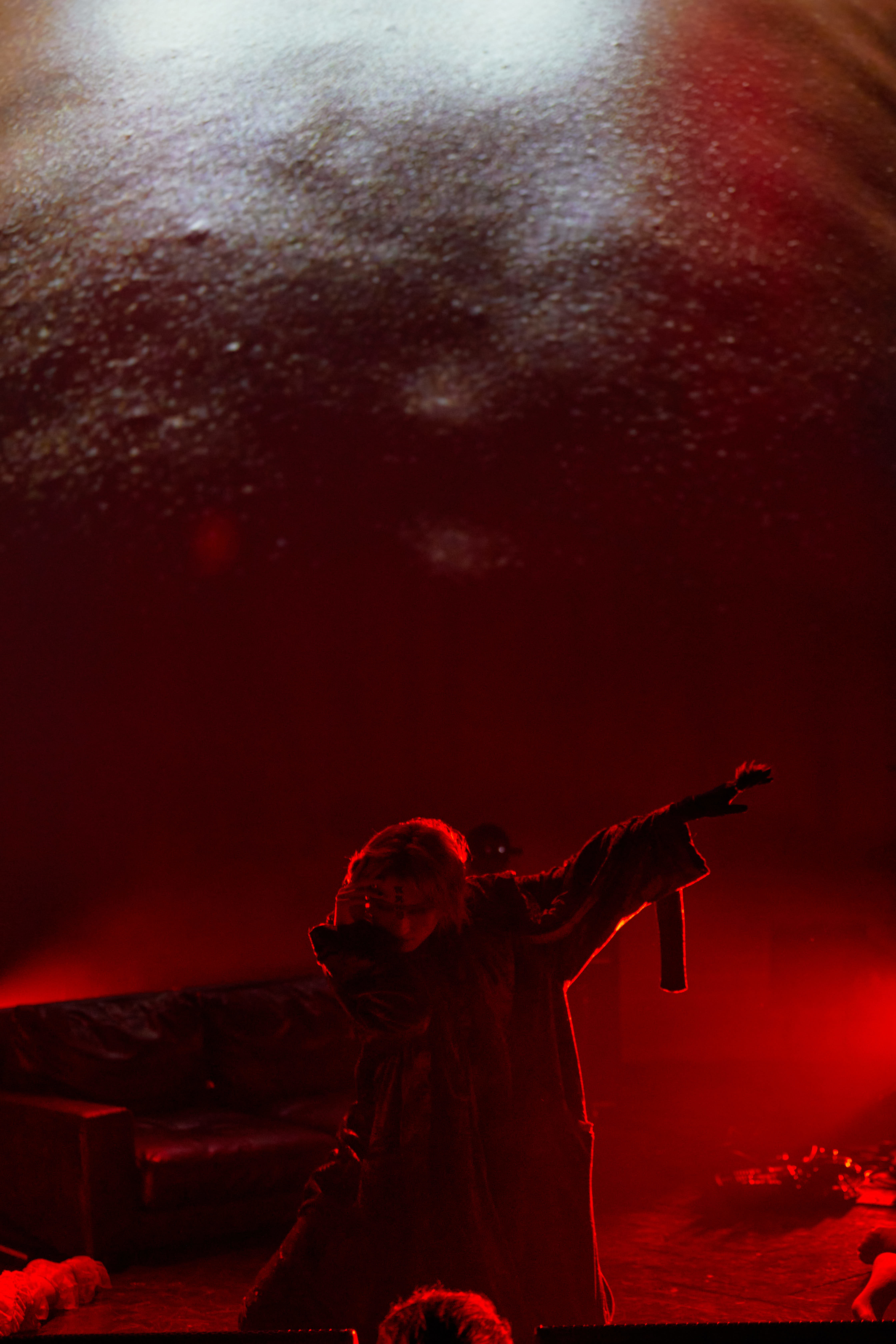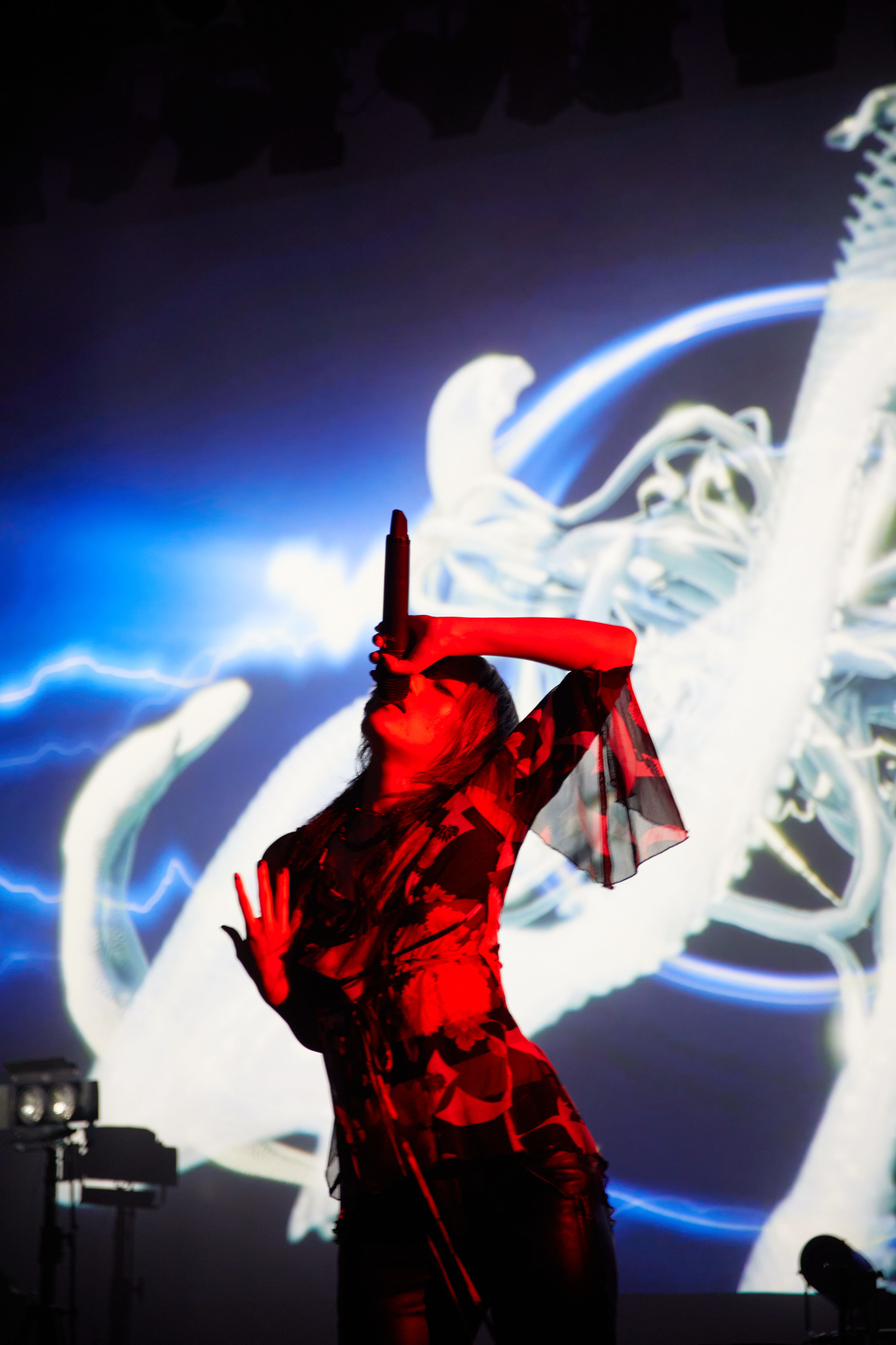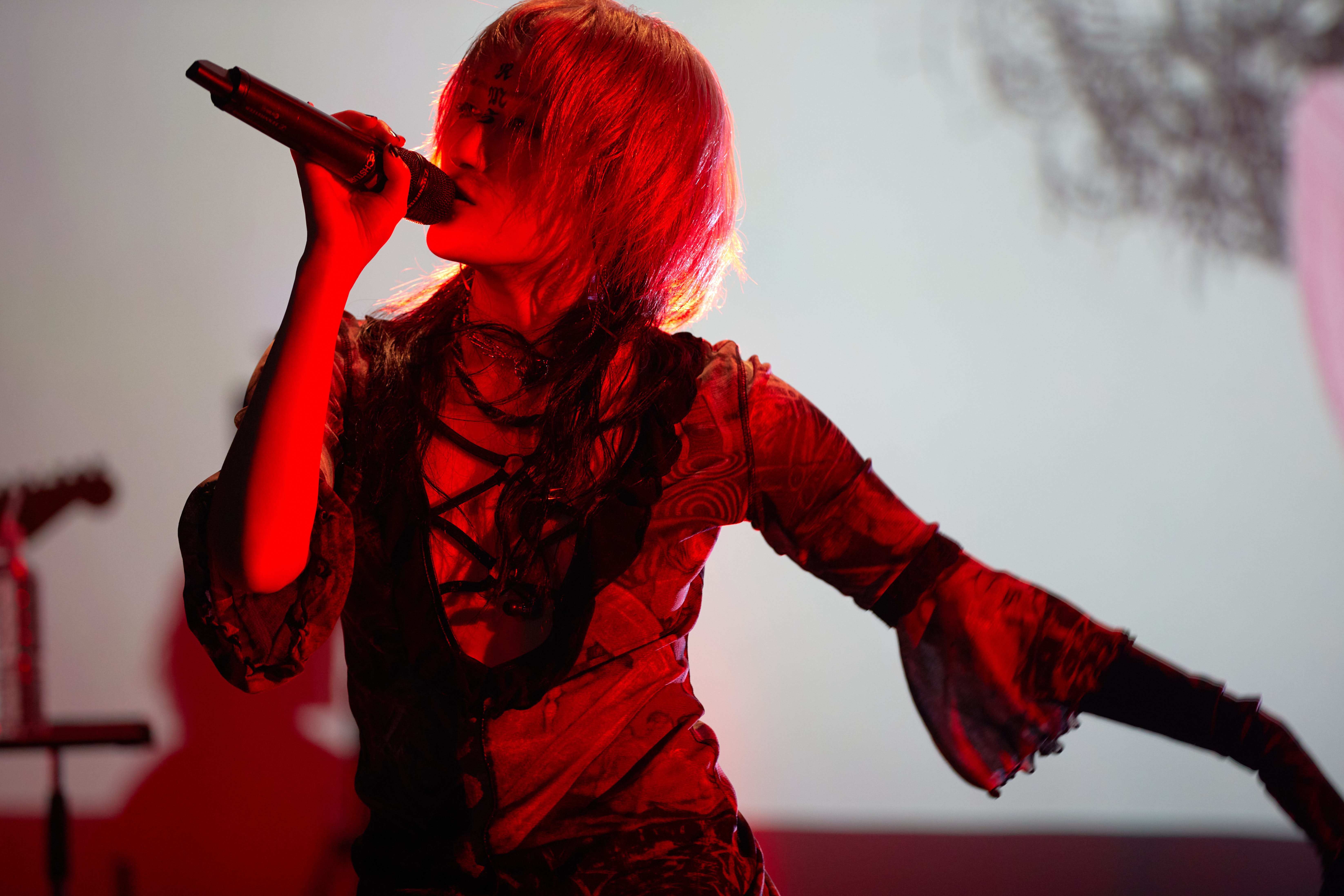 この日最初のMCの内容は重いものだが、隣の席の人に話しかけるような柔らかな口調には、暗さだけではない優しさが見える。ここから始まる後半は、アブストラクトヒップホップ風の「He.」「incubus」から、徐々にテンションを上げて自らエレクトリックギターを弾くグラマラスなロックンロール「Choose for yourself」へ。グラムロックやパンクバンドのボーカルでも行けるだろう、彼女のボーカルの多彩な表現力には驚かされっぱなしだ。さらに「みんな、踊っていくよ!」と叫び、明るい四つ打ちのダンスチューン「PaBodance」で客席を挑発しながら盛り上げる、肝の据わったアクトレスぶりがかっこいい。そしてラストは「selfish REMIX」の幽玄なサウンドと祈りのようなハイトーンボイス、ビジョンに映る美しい月の映像が、温かく肯定的なムードで会場を包み込む。まるで一本の映画を見終えたような、深い余韻があとに残る。
