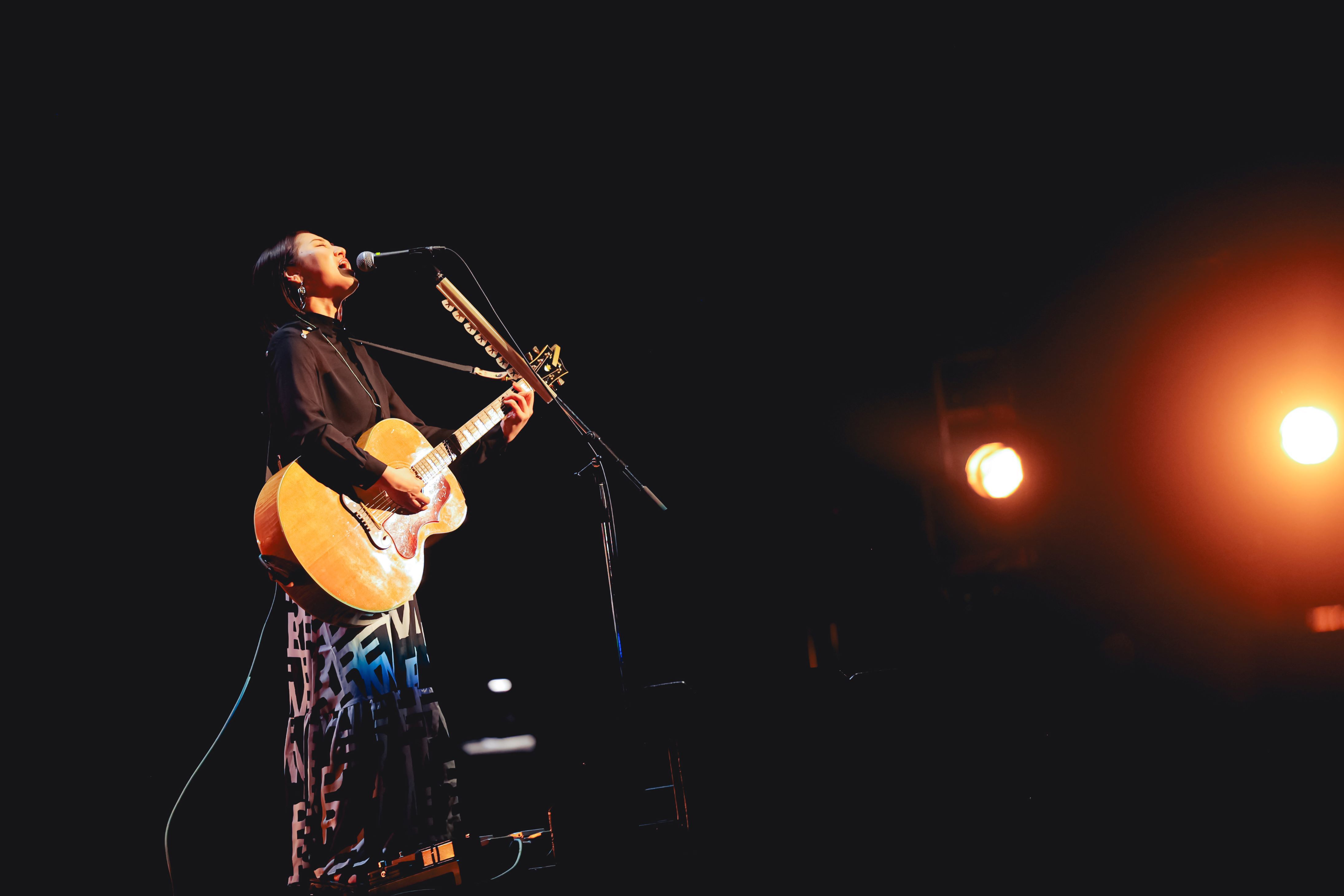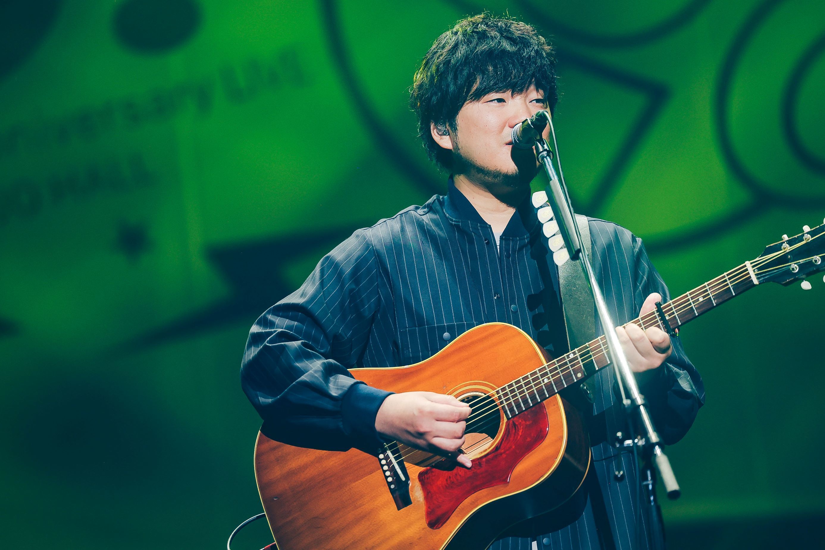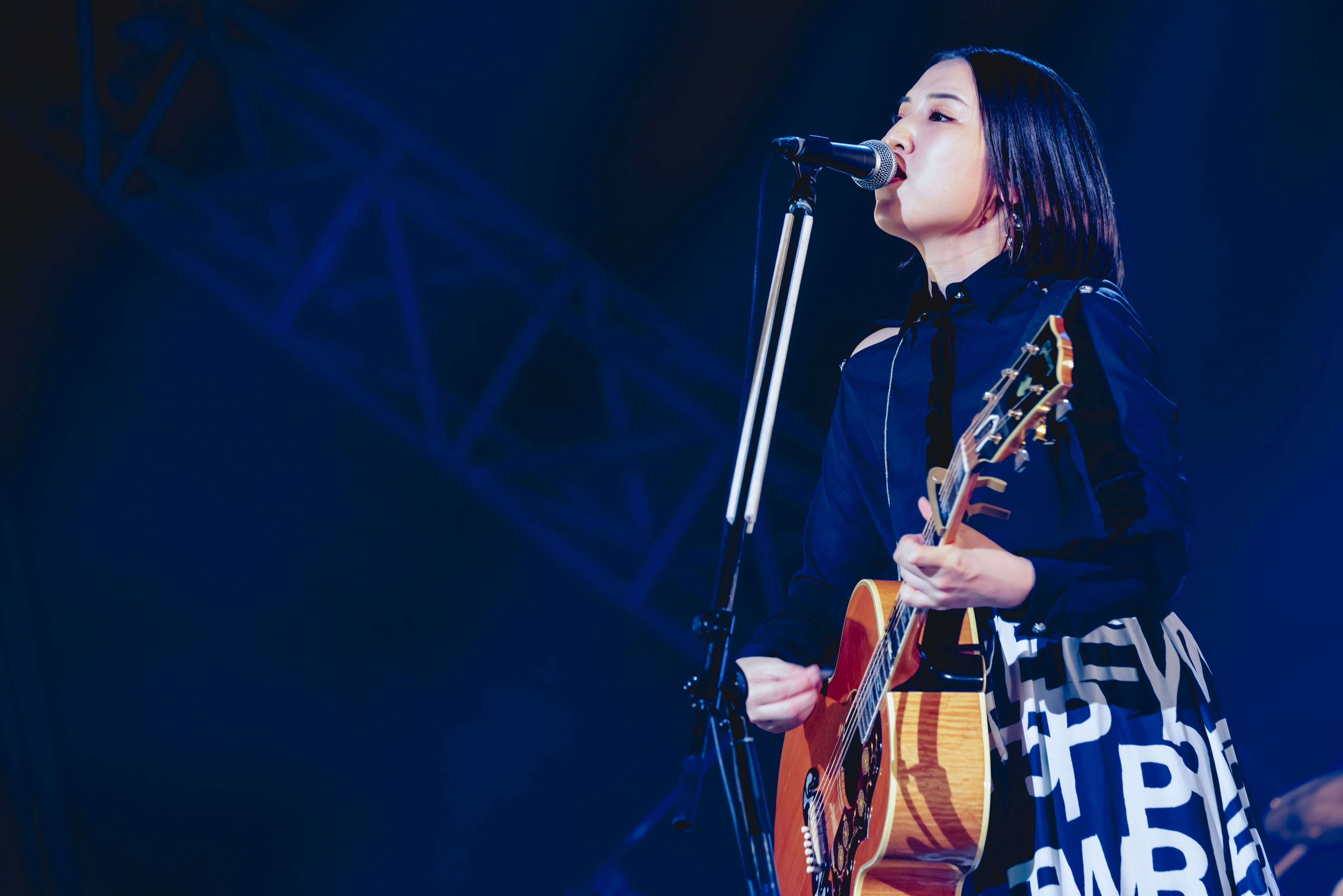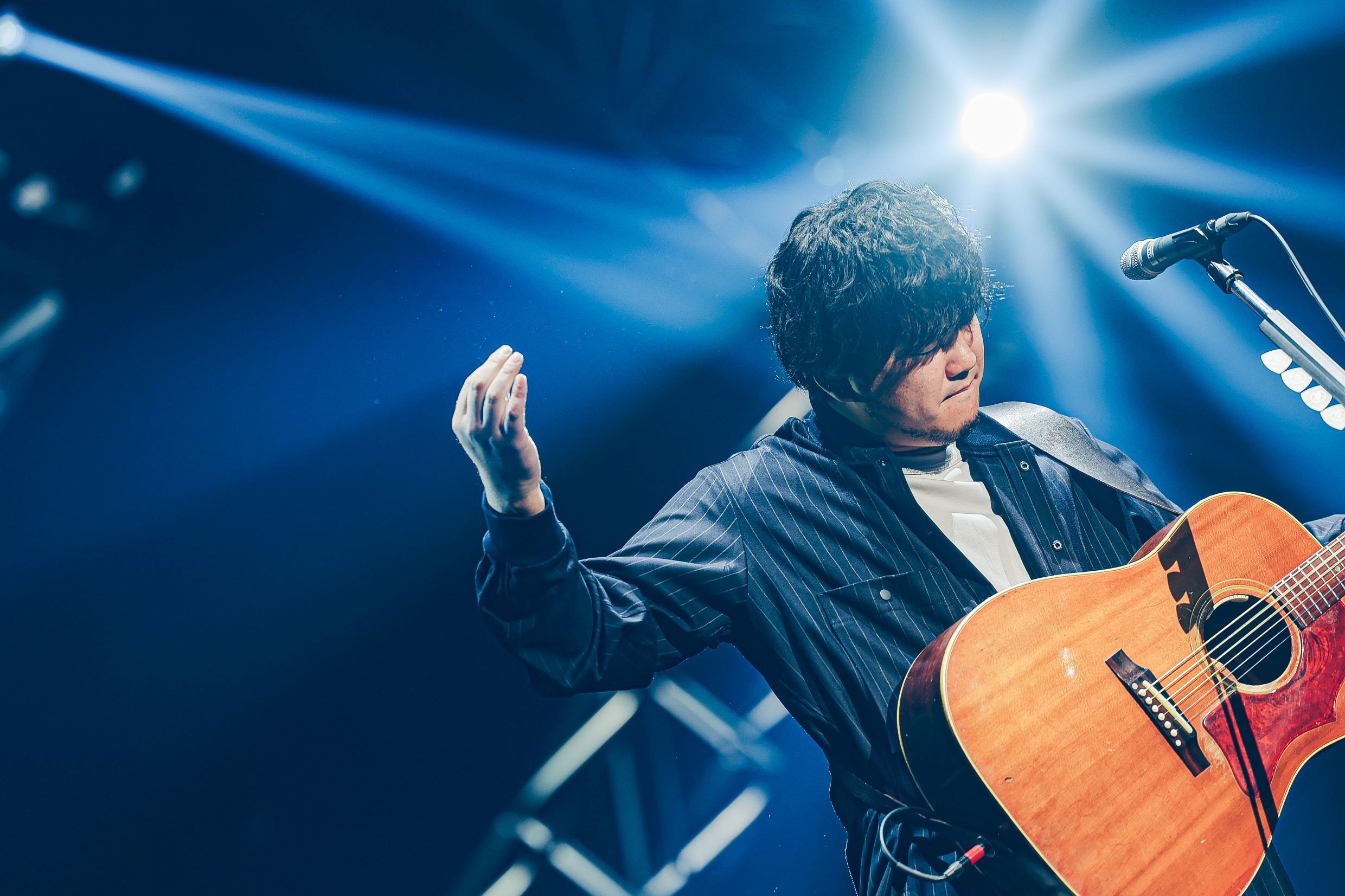 秦 基博のステージでは、アコースティックギターのリフだけで会場からわっと大きな歓声と拍手が沸き起こった。1曲目「ひまわりの約束」、真っ直ぐに前を見据え、ギター1本だけで唯一無二の世界を作り上げていく彼。素朴でいて心を締め付けて離さない唯一無二の歌声、じっくりと紡いでいく言葉、心震わすメロディに酔いしれ、観客たちは気持ちよさそうな表情を見せている。MCでは、「なんで僕がアシスタントMCじゃないんだろう…。」とレキシに嫉妬する秦。実は、秦と中島ヒロトは「秦サンタとヒロトナカイ」として、毎年クリスマスの時期にダブルDJで特別番組を担当する仲。それでもイベントに呼んでもらえてうれしいと感謝の気持ちを伝え、「鱗」へと続く。ギター1本で圧倒的な歌世界を作り上げ、ふくよかな歌声と多幸感いっぱいの詞世界でリスナーの心の奥底まで確かな印象を残していった。