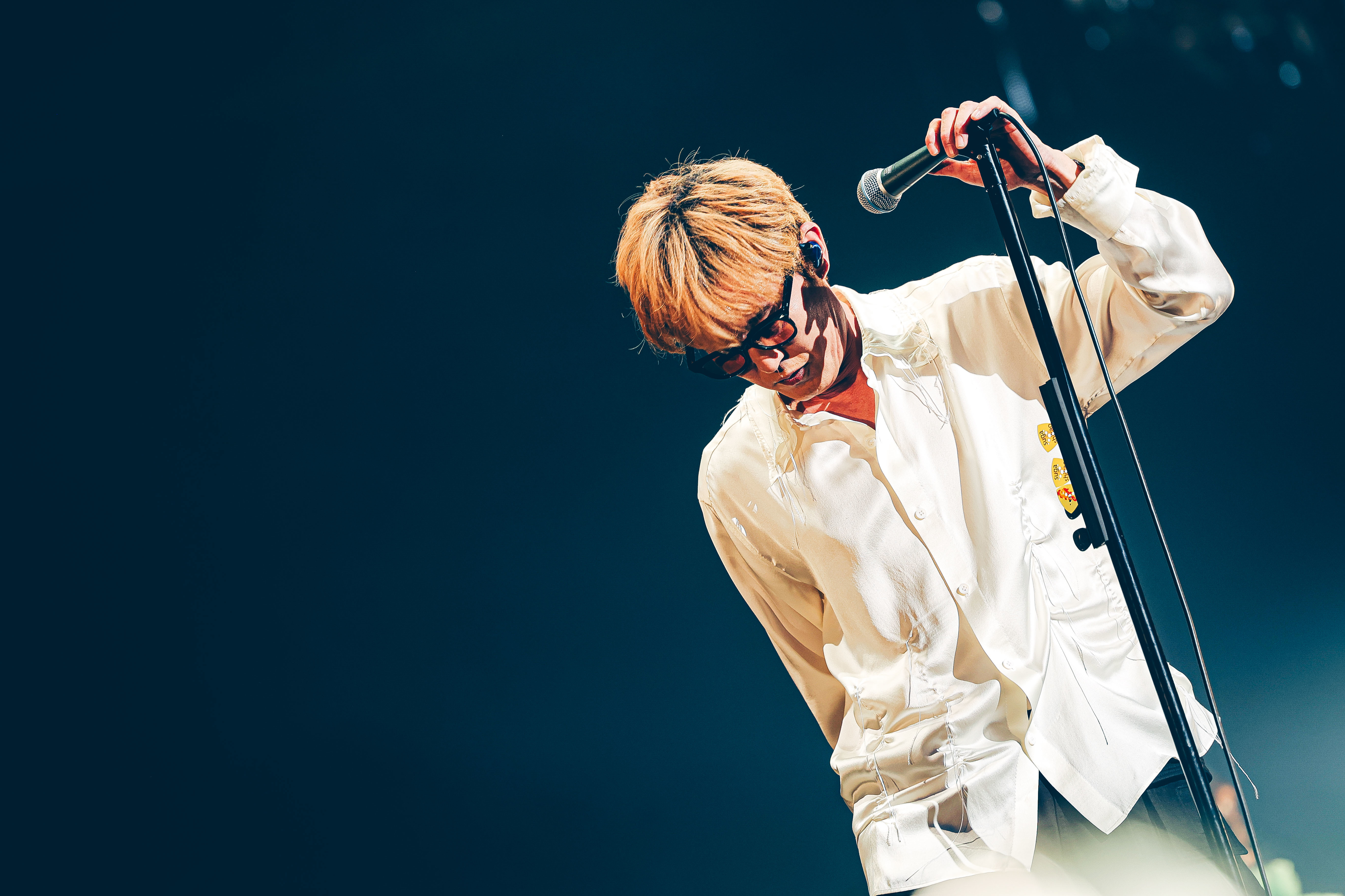 スガ シカオはハウスバンドとコラボしてのステージ。「ヒロト、55歳おめでとう!一生懸命歌うんで、みんなも楽しんで!」と1曲目「午後のパレード」へ。さっそくのキラーチューン、ギターリフが鳴り響くだけで会場は大盛り上がり。ギターをかき鳴らし、ご機嫌にステップを刻み、声を高めていくスガ。抜群のメロディセンスに誰もが夢中だ。バンドのビートもご機嫌度が増し、Reiの圧巻のギターソロにはスガも大喜び。今年でデビュー27年を迎えるというスガは、もちろん中島ヒロトとは長年の付き合いがある旧知の仲。「キャリアを積むと仕事に慣れて楽になると思っていたけれど、そんなことはない。プレッシャーとの闘い。こんなにも長くDJを続けていることをリスペクトしている」とエールを送る。そして「みんなそれぞれ自分の壁を少しずつクリアして生きていかないといかない。みんなに、あと一歩前に進もうという曲をプレゼントしたい」と、「Progress」へ。ギターリフだけで会場から歓声が沸き起こる名曲。思いが込められた言葉のパワー、それを伝えるメロディの存在感に圧倒され、観客はただじっと前を見据えて楽曲に世界観に没入していた。