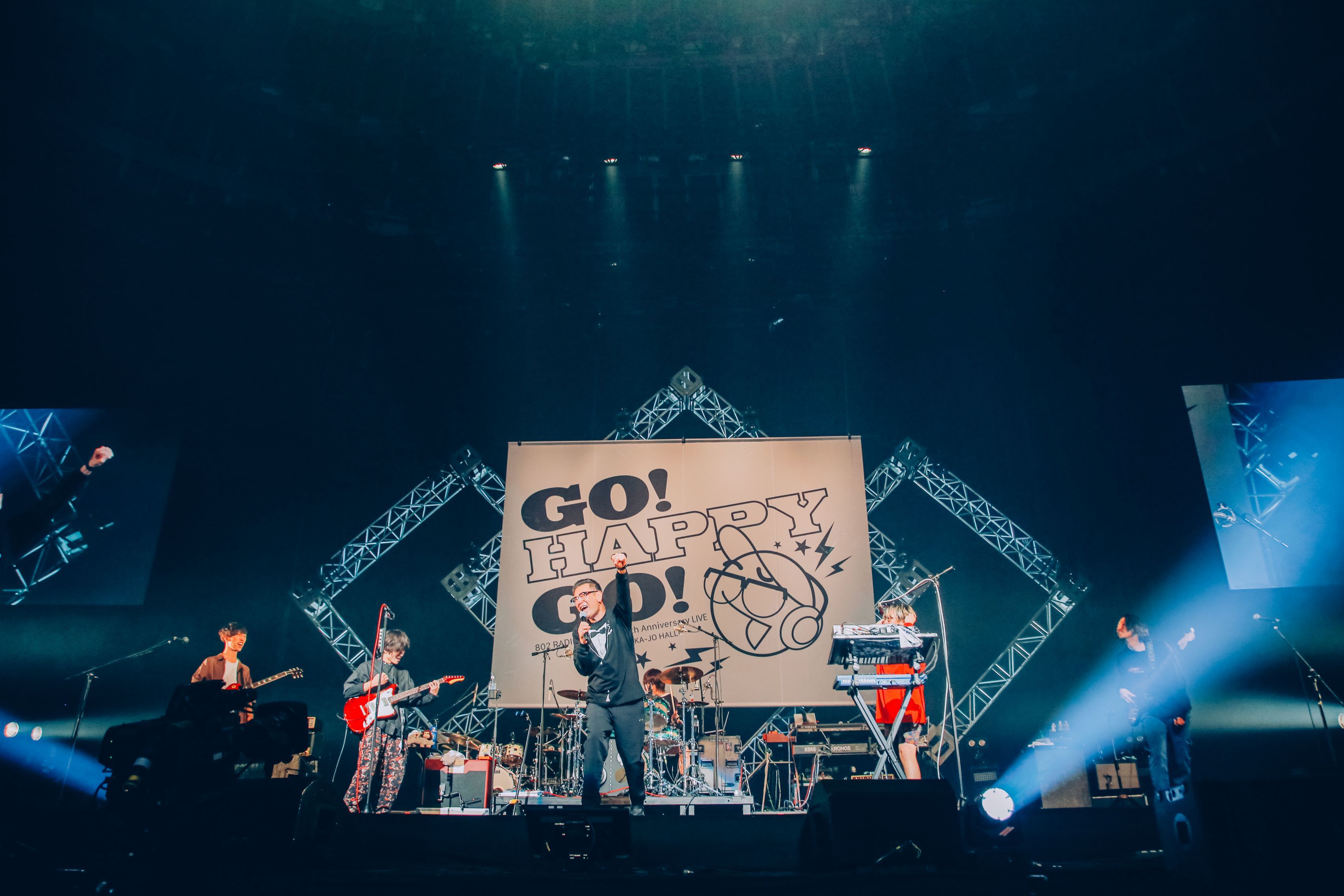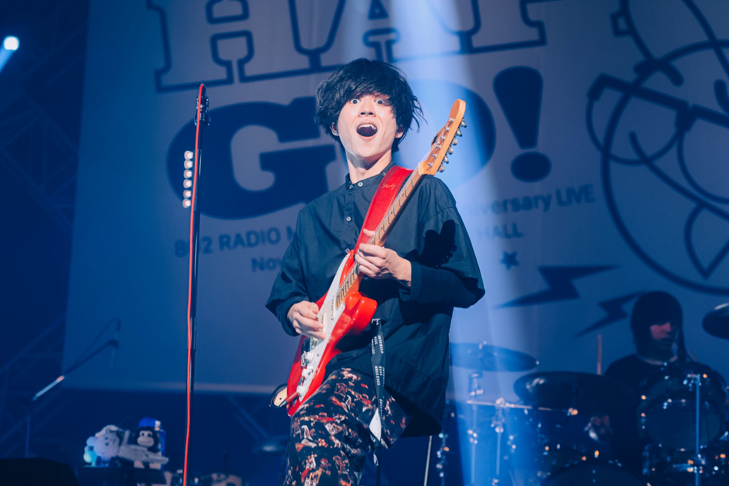 イベントの休憩時間中に行われたサウンドチェックでも、本番さながらに盛り上げたのがキュウソネコカミだ。本番のステージも「ビビった」から「ロックバンドと一緒にヒロトさんのお祝いしようぜ!」と、タフなバンドサウンドを響かせる。アッパーなロックサウンドに拳を突き上げ、高くジャンプでライブを満喫するリスナーたち。ショートすぎるアッパーチューン「家」では入場時のお土産として配布された手ぬぐいを振り回して会場をひとつに。中島ヒロトからは毎年お年玉をもらうというもはや“親戚のおじさん”並みに仲のよい彼ら。最終曲「ハッピーポンコツ」では曲フリを中島ヒロトが担当するコラボステージも展開。底抜けに楽しくなるロックサウンドで盛大に祝砲を上げ、最後の瞬間まで観客を楽しませ、ステージを後にした。