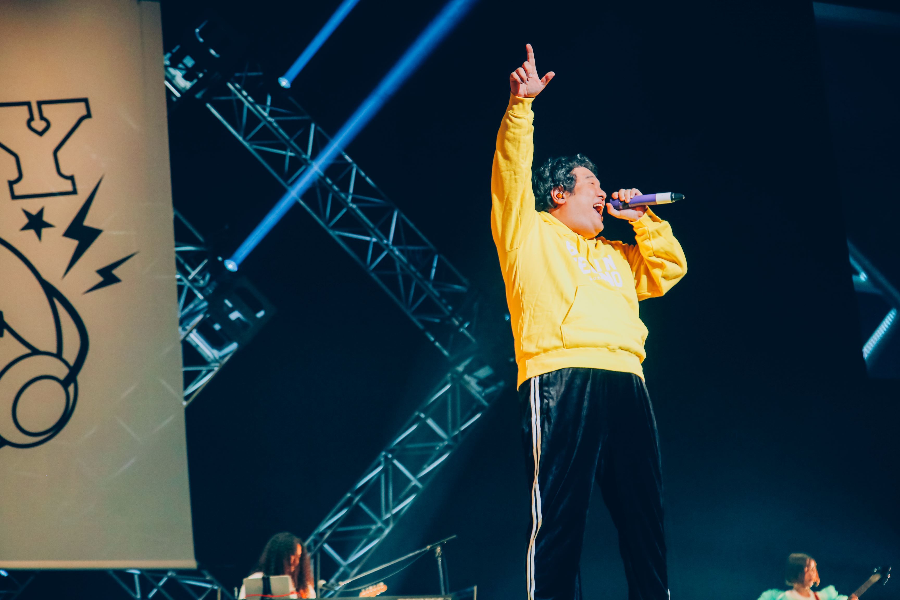 観客を盛大に巻き込み、笑いたっぷりのステージで盛り上げたのが岡崎体育。「Call on」でご機嫌なトラックに合わせて会場を盛り上げたと思いきや、無茶ぶりしまくりの複雑なハンズクラップ&コール&レスポンスを観客に要求するシーンも。「なにをやってもあかんわ」ではハウスバンドとともにスペシャルなステージを展開。会場をあっという間にポジティブオーラに変えてしまうキャッチーなサビに観客も一緒になって大合唱。締めはバンドで歌うならいつかやってみたかったと、ボーカルがかっこよく曲を締めるやつをやりたい!と、ハウスバンドを使って贅沢に遊ぶという、岡崎体育ならではのステージで楽しませてくれた。