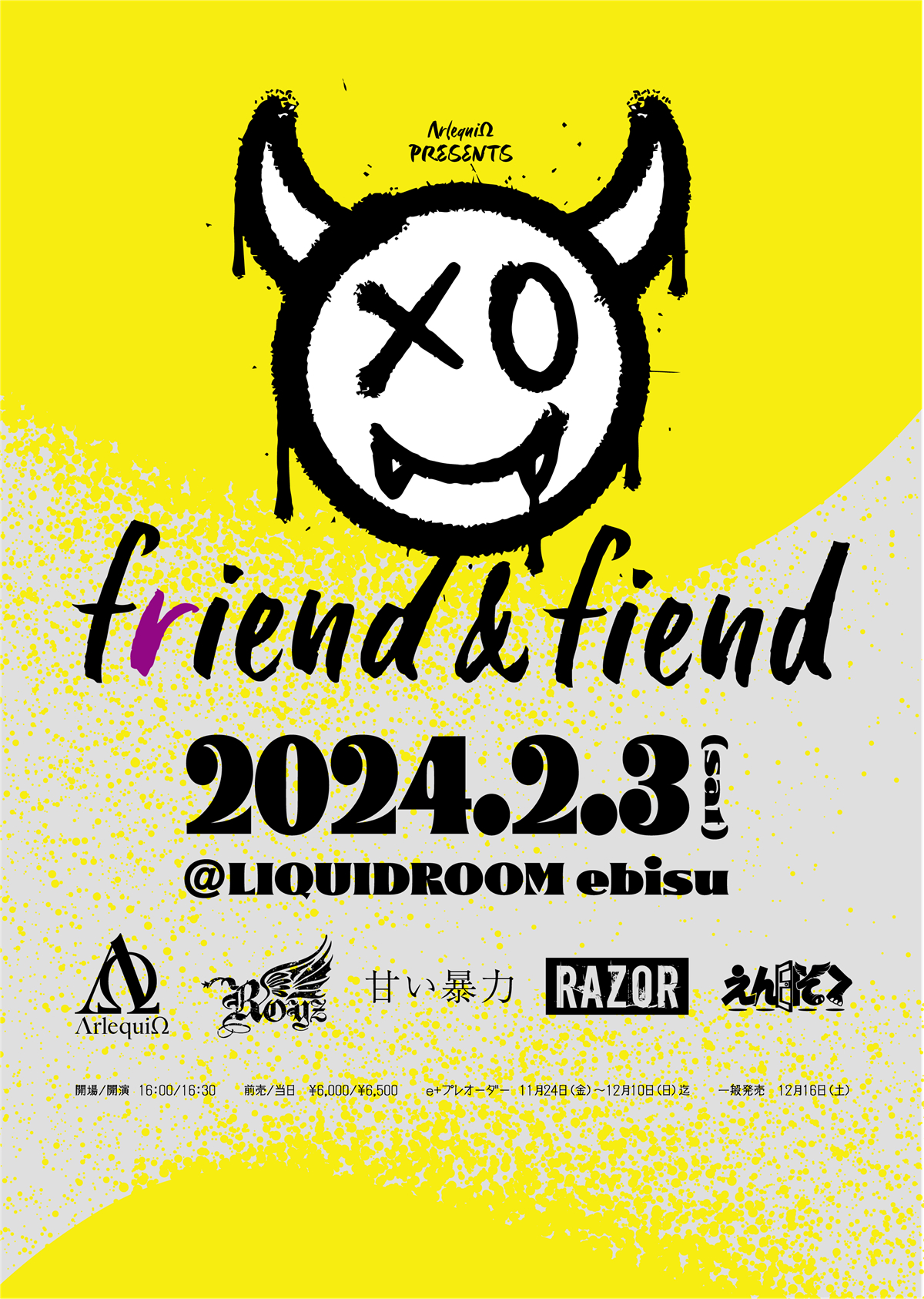 本公演は 「friend & fiend」という公演タイトルにもあるように、かねてより親交の深いRoyz、甘い暴力、RAZOR、えんそくの4バンドを迎えて開催。ヴィジュアル系シーンの中で、お互いを高め合い、共に成長し活動を展開した“戦友”たちでもある。チケットは、12月10日(日)23:59までイープラスにて先行受付中。