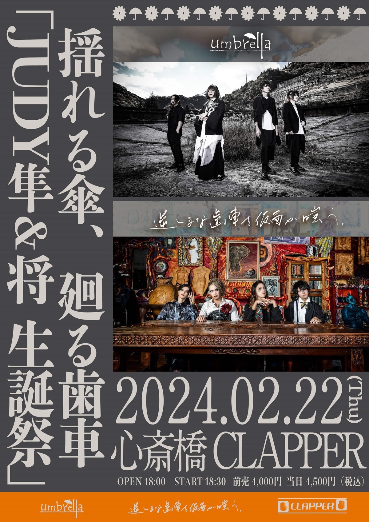 また将の生誕祭は心斎橋CLAPPERにて、結成当初より特に関係の深い、逆しまな歯車を仮面が嗤う。のJUDY 隼(Gt)との合同生誕祭ツーマンとなっている。将が逆しまな歯車を仮面が嗤う。のサポートドラムも担い、音楽性の異なる両バンドでのツーステージとなる。