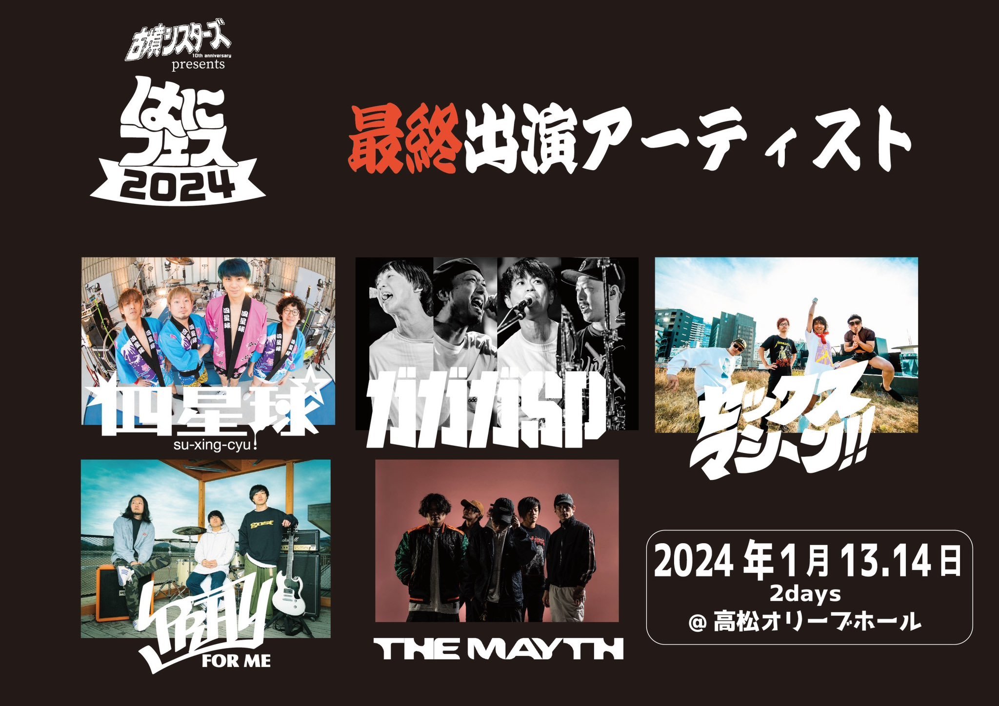 最終出演者として発表されたのは四星球、ガガガSP、セックスマシーン!!、PRAY FOR ME、THE MAYTHの5組。
