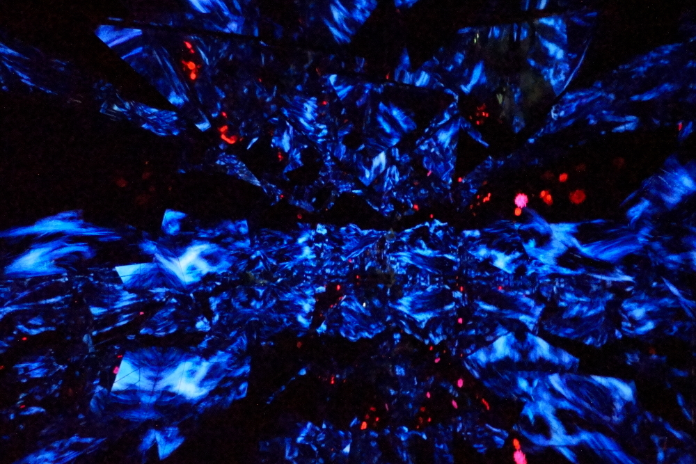 今回公開されたインスタレーションは2作品。どちらも世界初公開となる新作だ。まずは《Megalith Crystal Formation》と名付けられた空間へ。暗闇の中、誕生と死滅を繰り返す花々のデジタル映像が、上下左右に反射しては広がっていく。まるで万華鏡の中に入ったような感覚だ。