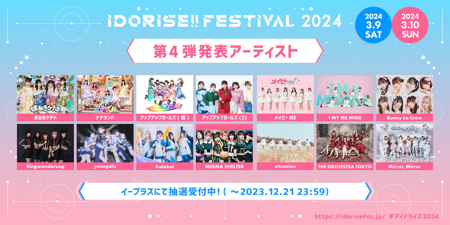 2024年3月9日(土)・10日(日)の2日間、東京・渋谷にて開催される『IDORISE!! FESTIVAL 2024』の第4弾出演アーティストが決定した。