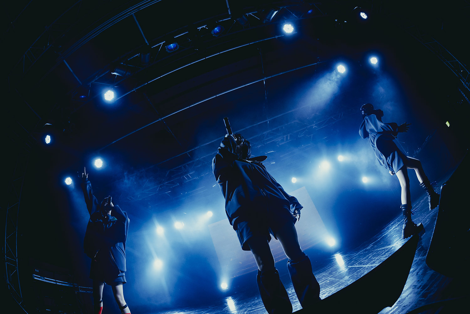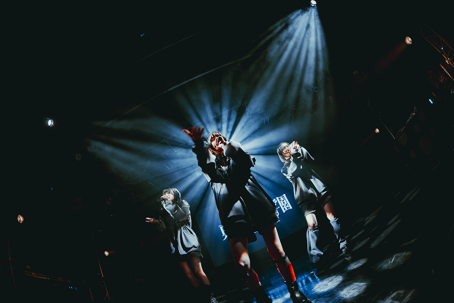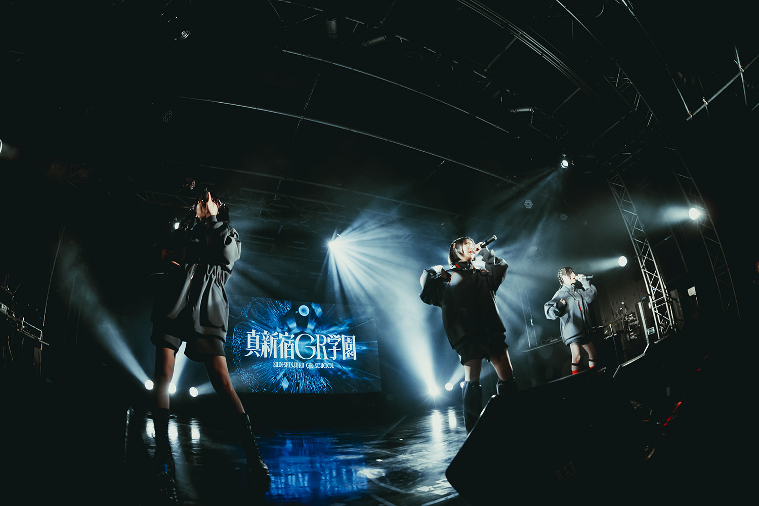 照明が消えたステージに3つの影が現れる。ステージに登場したのはチャコールグレーのパーカーに身を包んだ真新宿GR学園の3人。そこに新たなトラックが走り出す。1曲目に披露したのは新曲「Anti」。囁くように歌い出した3人、徐々にその歌声には力強さと仄暗さが加わっていき、会場をダークな空気で包み込む。さらにここにデビュー曲である「禁言」を続け、会場の空気を早々に掌握した。