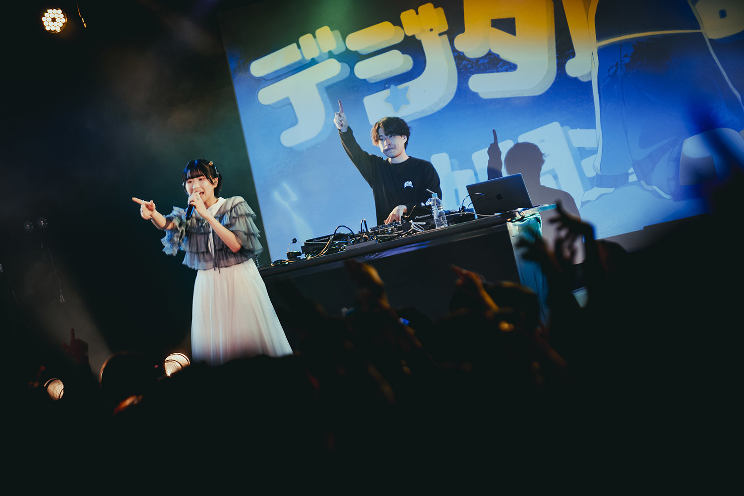 ここに更にトリッキーな事態が巻き起こる。なんと、ゲストとしてRINNEEE、SONOTAの2人をステージに呼び込んだのだ。3人で披露したのは電音部シブヤエリア・帝音国際学院の楽曲「爆裂タウマゼイン」。巻き起こる大歓声の中、オーディエンスにマイクパスして共に歌うといったパフォーマンスも見せる。会場は激しい熱気に包まれずにはいなかった。