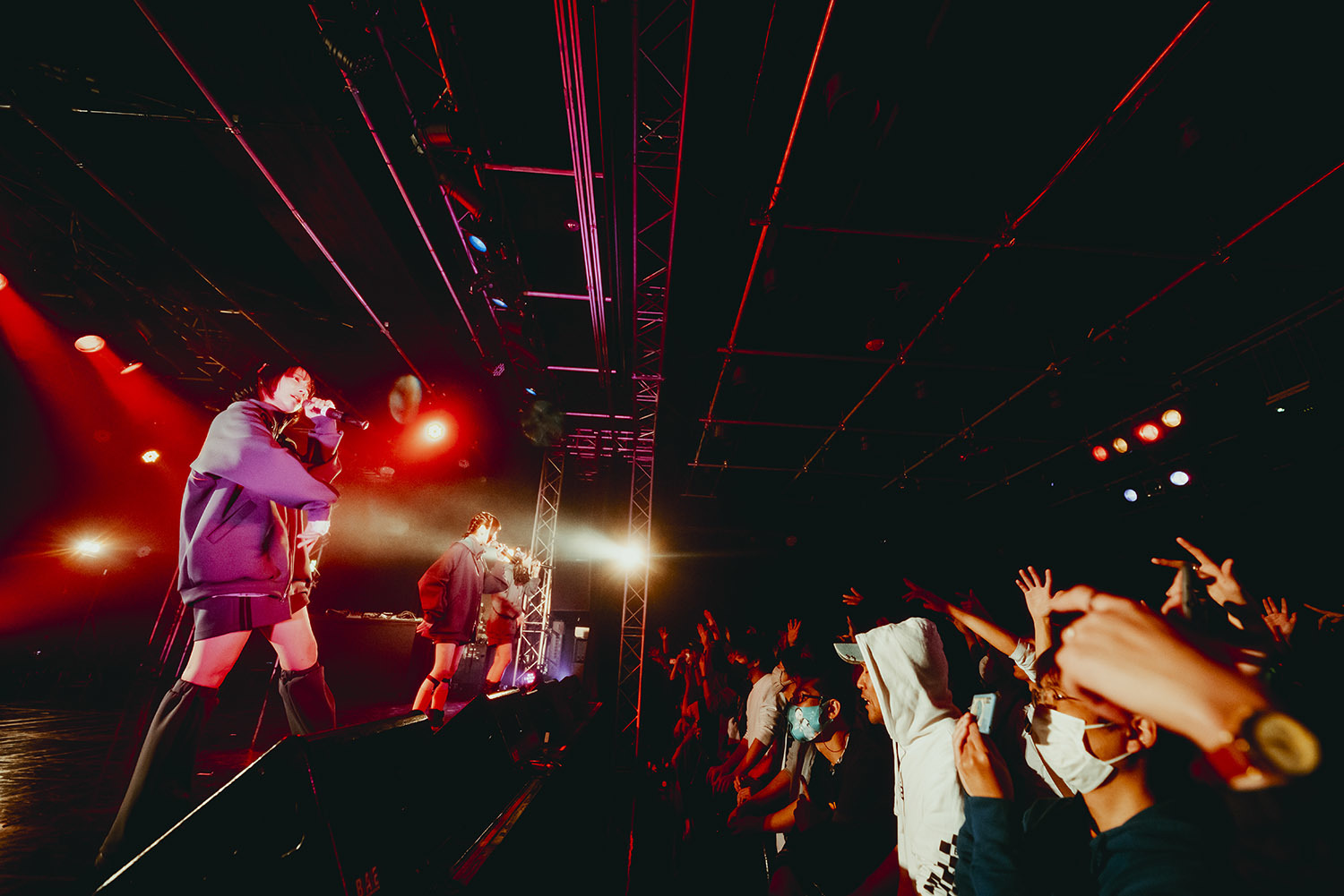 続いて登場したのはSONOTAだ。シンセサイザーのサウンドにビートが乗り、さらに彼女の挑発的な声が加わる。一曲目に披露したのは「かわちい」、そのサウンドに乗せて観客全員が跳ね回る。ここにメロディアスなサウンドが魅力の楽曲「甘ったるいサイダー」を続け、ルードな歌声で観客を心地よく酔わせる。サビでは手を天に掲げ左右に降るオーディエンスの姿も見ることができた。その盛り上がり視覚的にも明らかなものだった。