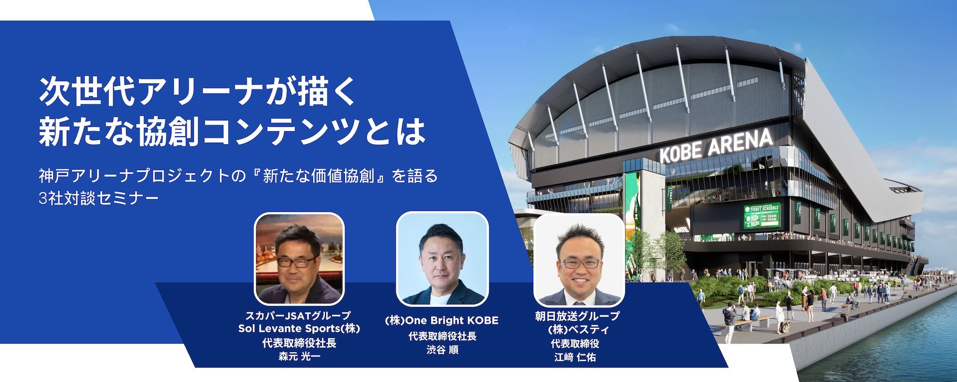 2025年4月に開業が予定されている日本初の270度海に囲まれた水辺のアリーナ・神戸アリーナ(仮称)。11月28日(火)、同アリーナに関する対談セミナーがオンラインで開催され、神戸アリーナプロジェクトを推進する株式会社One Bright KOBEからは代表取締役社長の渋谷順氏、朝日放送グループ株式会社ベスティ代表取締役 江﨑 仁祐氏、スカパーJSAT株式会社メディア事業部門経営企画部 兼 Sol Levante Sports株式会社代表取締役社長 森元 光一氏が登壇し、「次世代アリーナが描く新たな協創コンテンツとは」をテーマに今後の展望などについて語った。