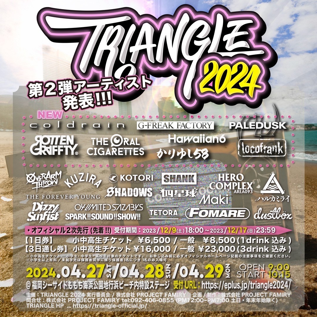 2024年4月27日(土)・28日(日)・29日(月祝)に、福岡・シーサイドももち海浜公園地行浜ビーチ内特設ステージにて開催される福岡の音楽フェス『TRIANGLE 2024』の第2弾出演アーティストが発表された。