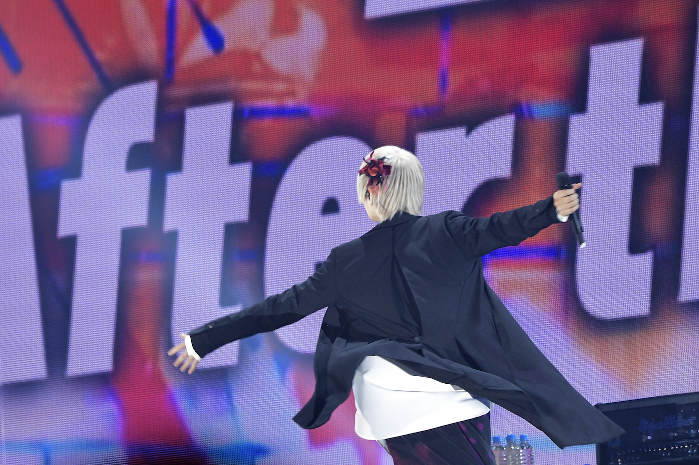 モノクロームな演出も虚しさ、やるせなさを際立たせた「ライア」からの、カラフルに<モノクロが彩られて>いった「ハロームジーカ」。バンド陣によるダイナミックな“コンティニュアム”をはさんでの、まふまふがエレキギターを弾きながら歌い、そらるがオーディエンスを煽った「ナイトクローラー」。行き場を失った想いを歌声に託した「レム」。After the Rainのライブは、『アイムユアヒーロー』の曲たちは、あまりにも情緒が忙しい。