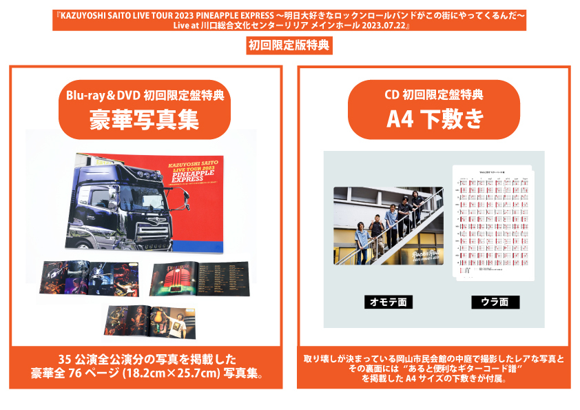 本作のBlu-rayとDVDの初回限定盤には35公演全公演分の写真を掲載した全76ページ(18.2cm×25.7cm)写真集付。CD初回限定盤には取り壊しが決まっている岡山市民会館の中庭で撮影したレアな写真とその裏面には“あると便利なギターコード譜”を掲載したA4サイズの下敷きが付属。