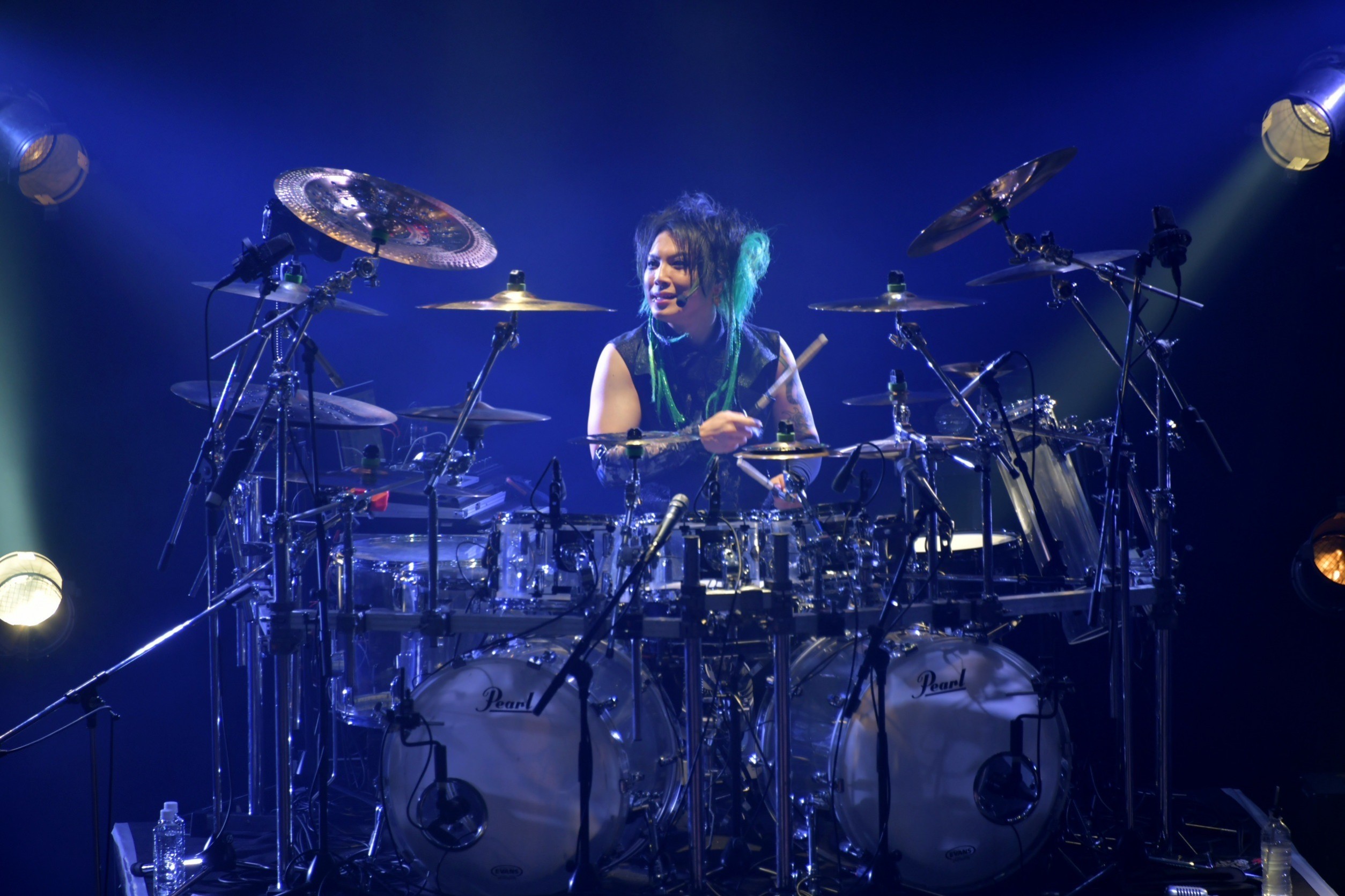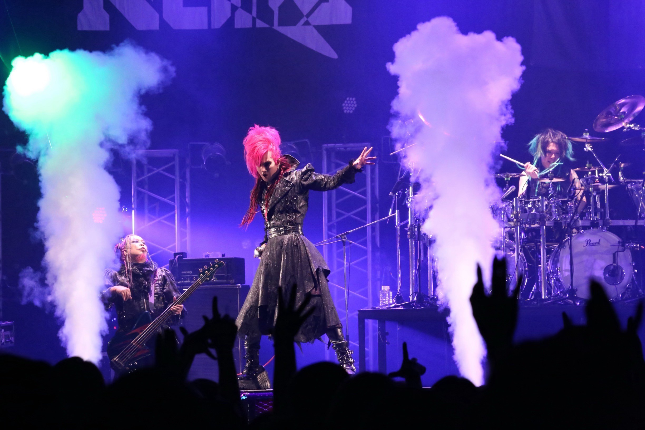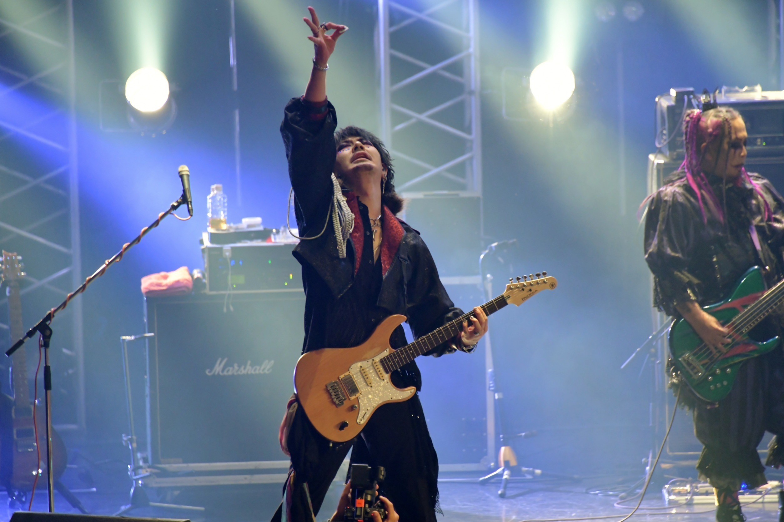 メランコリーと激情が見事に融合した「THE PARADOX IN IDEOLOGY」は、スモークとシャウトとヘドバンとジャンプで大騒ぎ。「踊れるかい?」と叫ぶTAKAの煽りに応えて、全員が踊りまくる四つ打つダンスチューン「Ritardando」。七色にまたたく、YAMATOのドラムに仕込まれたLEDライトがまぶしい。そしてラストチューンはスペイシーな浮遊感と壮大な空間の中で、トランシーなビートに導かれて踊りまくる「METEORS」。これが最後。手を上げてくるくる踊るオーディエンス。くるくるとギター回しの妙技を披露する呼太郎。「愛してるぜ川崎ベイベー!」と叫ぶTAKA。誰もが笑顔の中でラストはお馴染みの決めポーズ、一人ずつステージを去る姿に大歓声が鳴りやまない。すごい熱気だ。