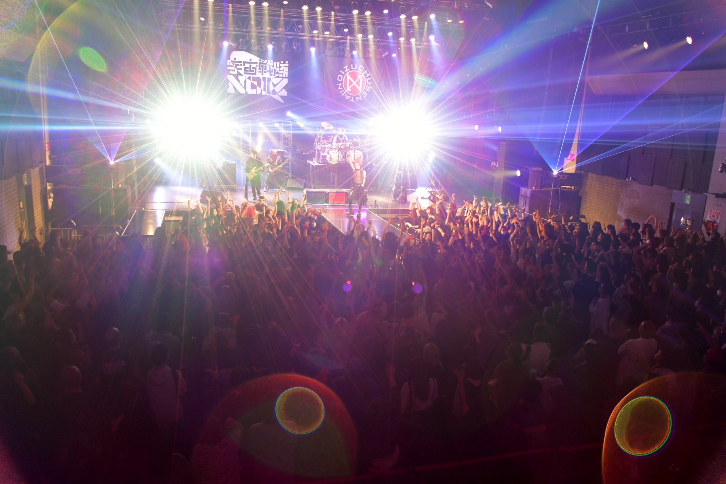 思い切り撃っちゃっていいかな? バキューン! お約束の銃撃ごっこからの「BAD MUSIC FREAKS」。燃え盛る炎の中を、強力なデジタルビートロックに乗って呼太郎が花道へ飛び出し、MASATOは中央で仁王立ち。TAKAはスクリーム、フロアはヘドバンで大暴れ。明るくポップなメロディで疾走する「ORANGE GRADATION」はANGEL-TAKAの独壇場で、花道に飛び出し、寝転がり、飛び跳ね、やりたい放題でがんがん盛り上げる。そのまま一気に突っ走るか、と思ったところに「ロスト」をぶちこみ、重くシリアスなメッセージで胸を熱くさせる。思いのこもったMASATOのラップは圧巻だ。UCHUSENTAI:NOIZは実は詞がすごい。もちろんみんなわかってる。